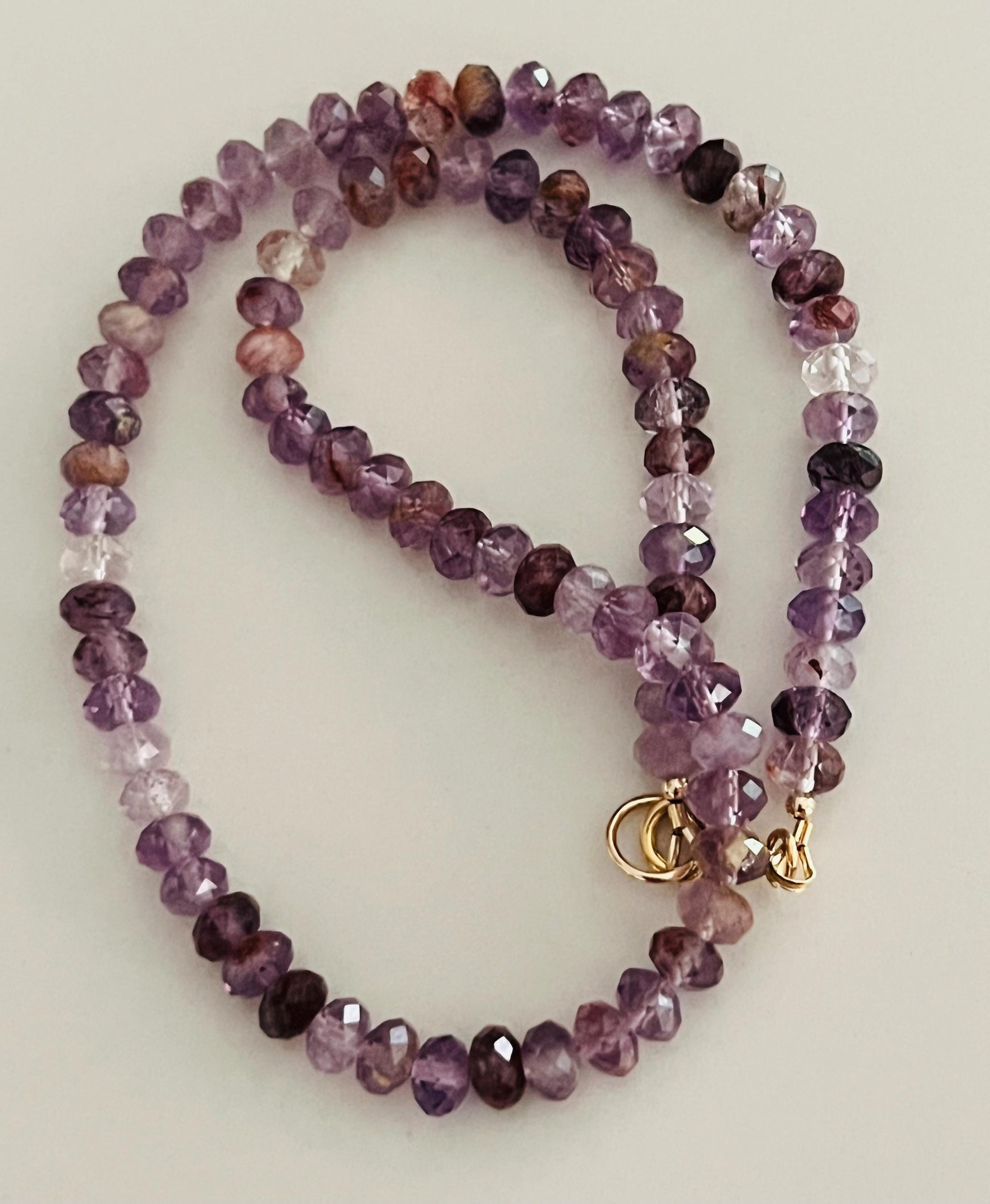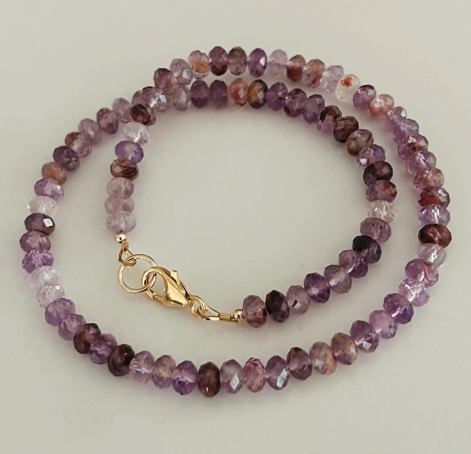 Natural Gemstone Necklace. Super Seven Amethyst Cacoxenite Purple Phantom 6mm faceted rondelle beaded necklace with 18k gold filled clasp. Stunning sparkling necklace. Arrives thoughtfully packaged in an eco-friendly kraft box wrapped in ribbon, ready for gifting or keeping for yourself. Amethyst Cacoxenite and opens all of your Chakras. It is especially connected to the Crown Chakra. Amethyst Cacoxenite is a powerful healer and it can help to build your confidence, especially your confidence in your intuition. It increases your personal power and connects the mind, body, and soul.