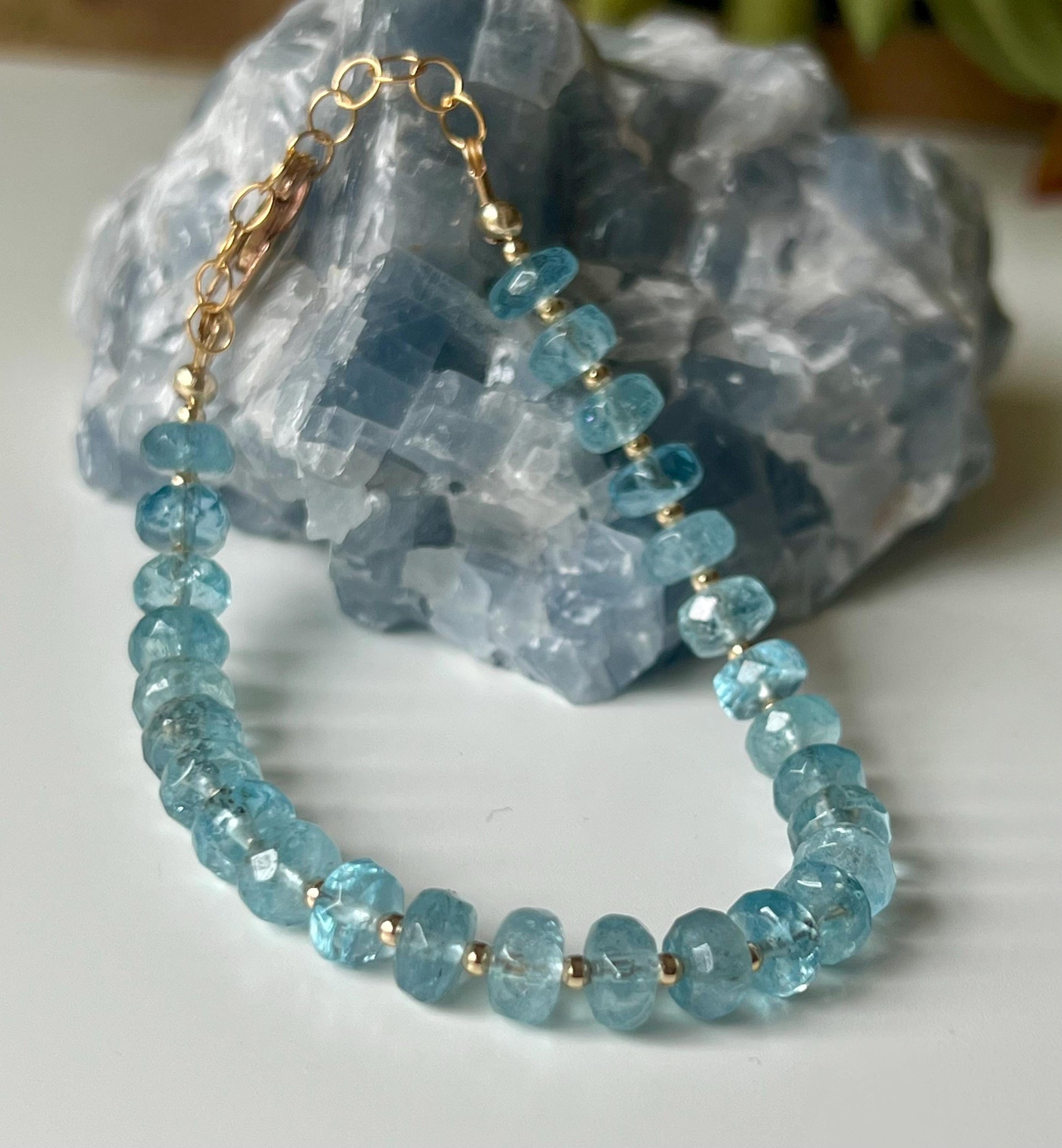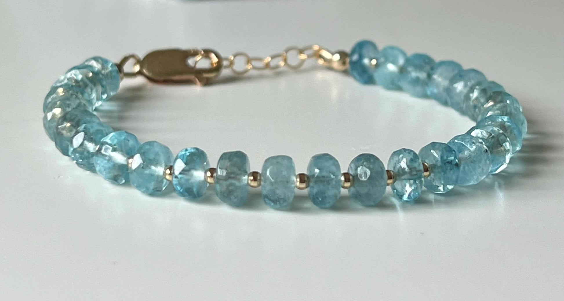 High Grade 6.5mm Faceted Rondelle Aquamarine stones with gold filled beads, gold filled clasp, and gold filled extender that allows for length to range from 6.5 to 8 inches. Arrives thoughtfully packaged in an eco-friendly kraft box wrapped in ribbon, ready for gifting or keeping for yourself.