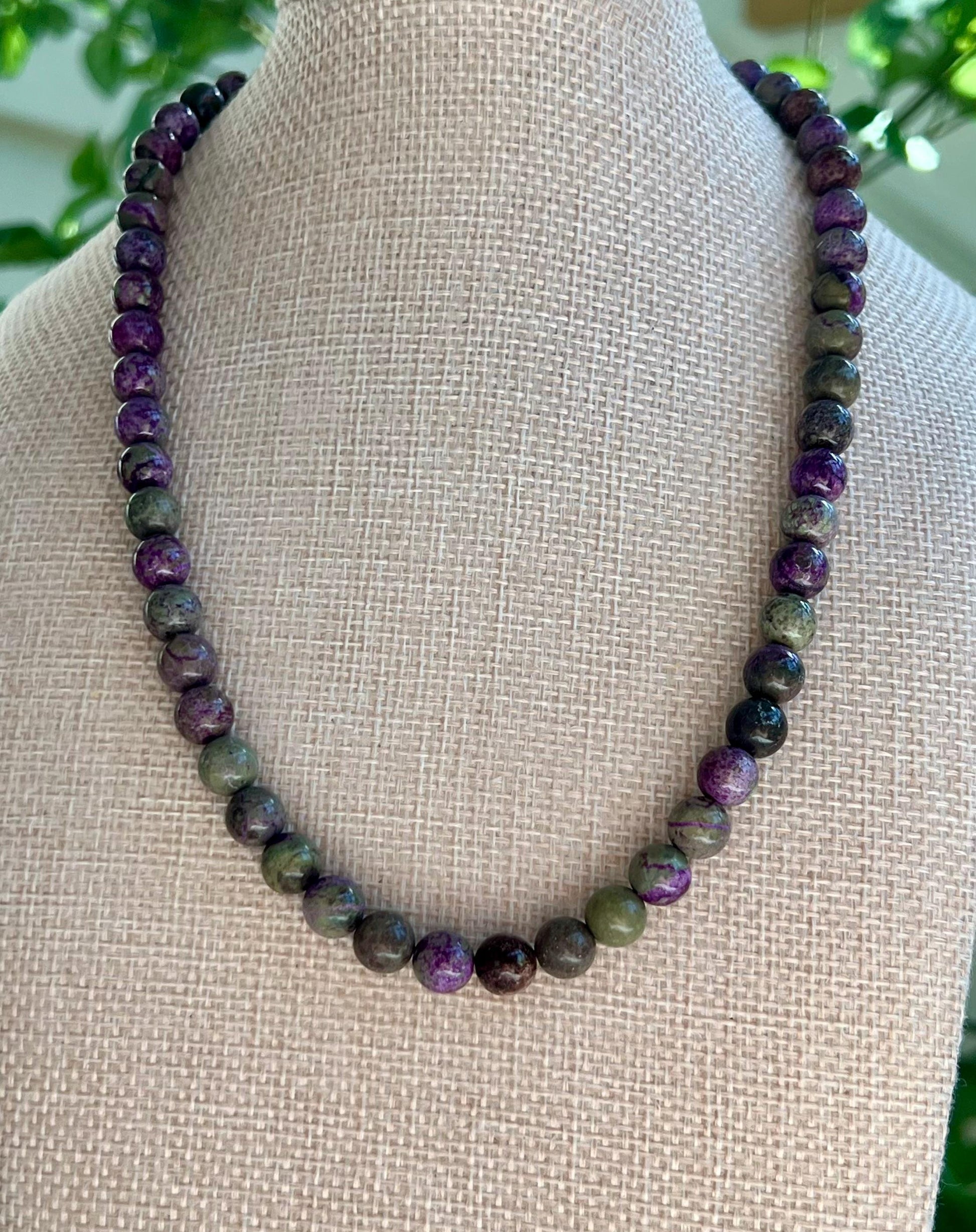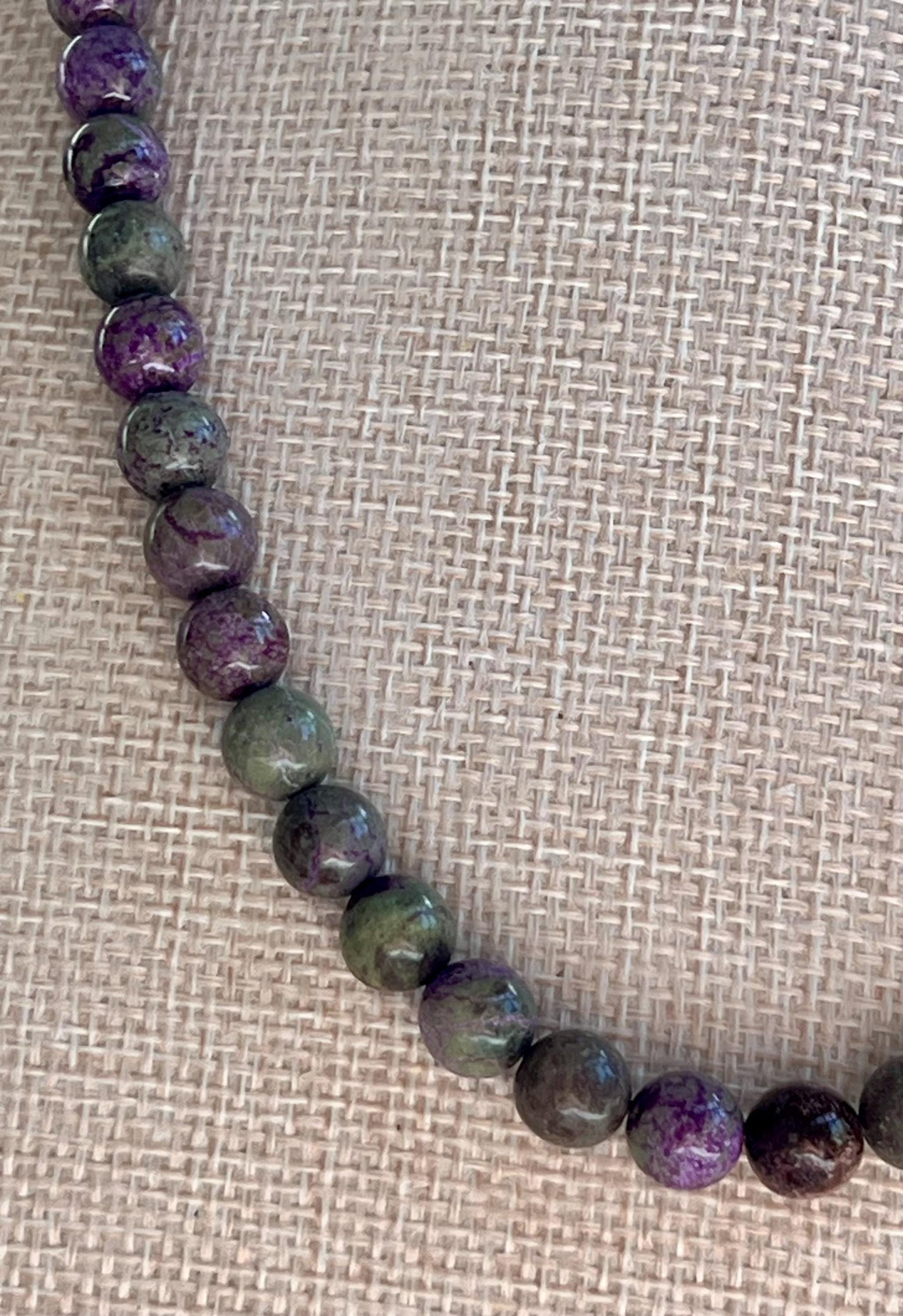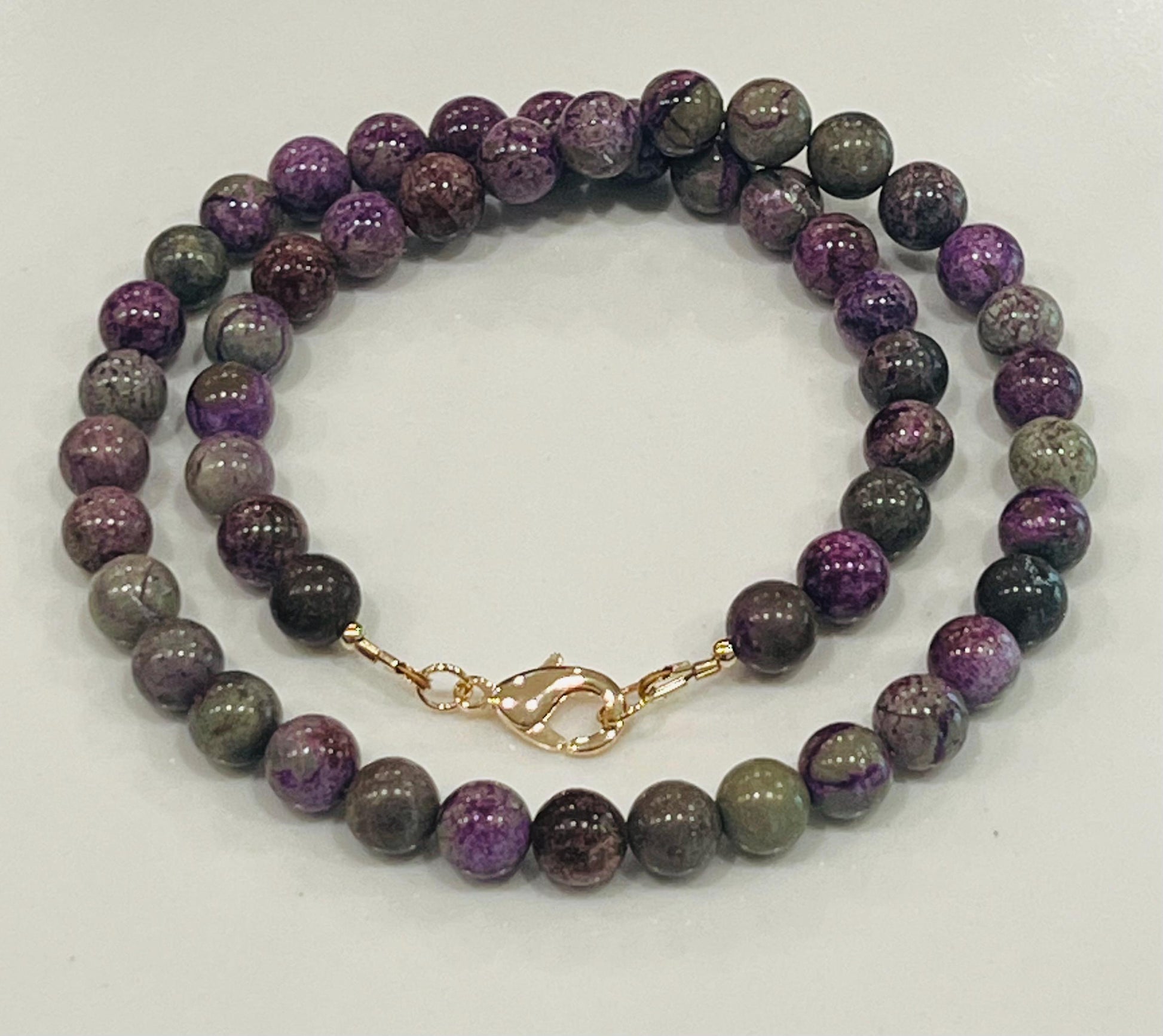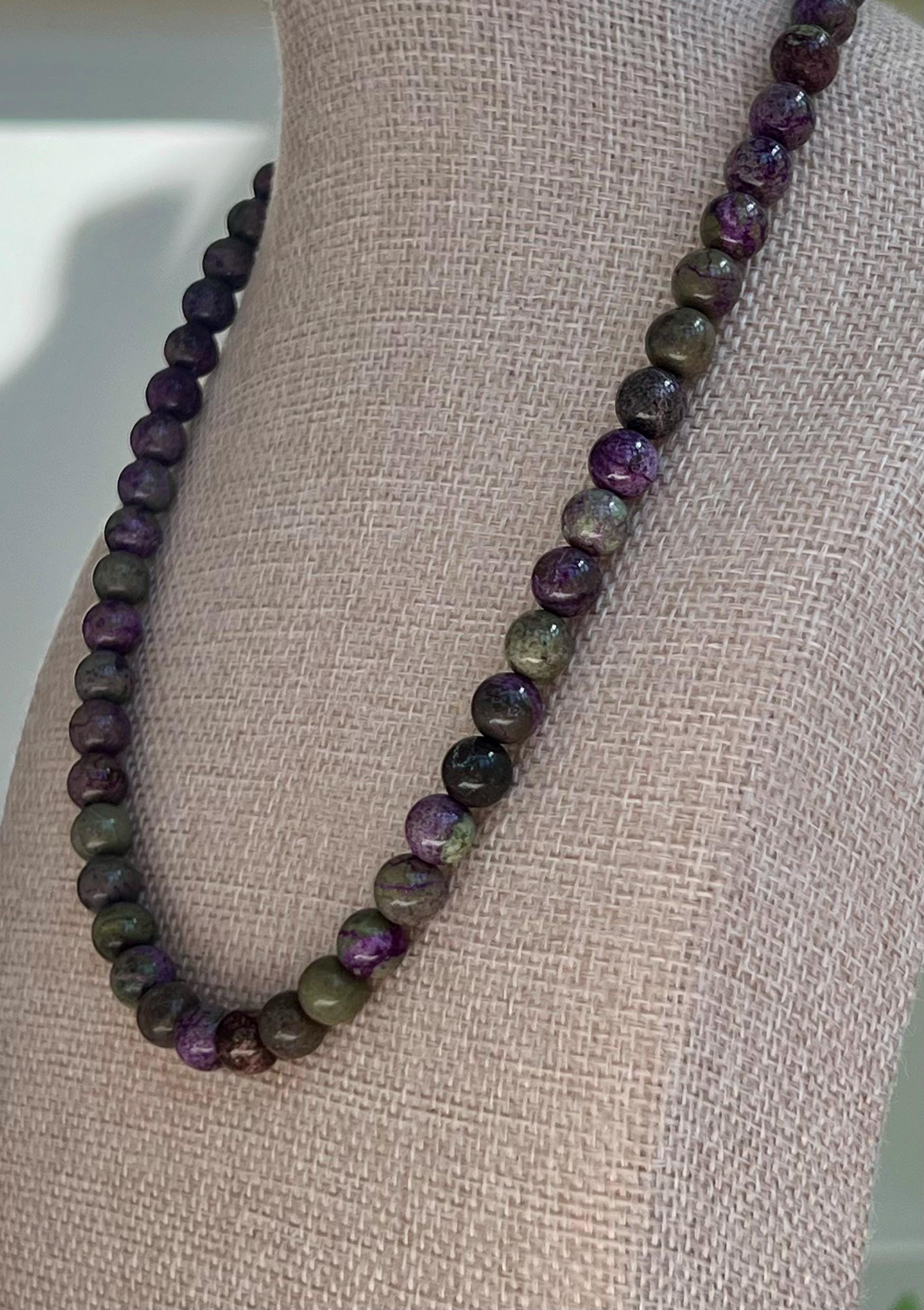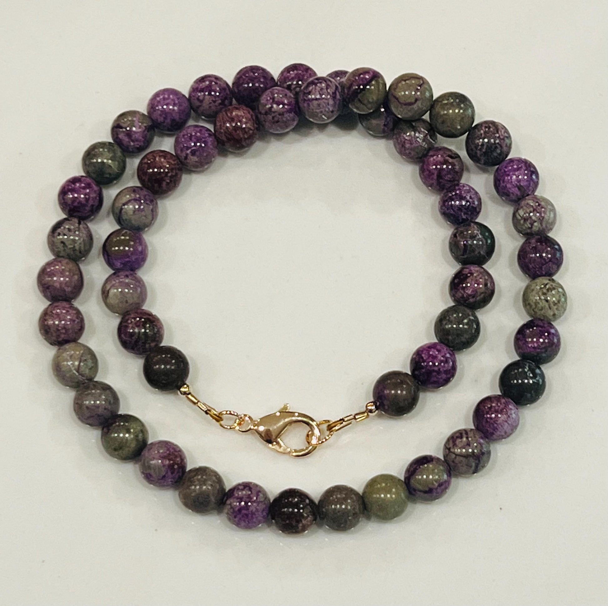 Natural gemstone necklace. Natural Grade AA Atlantisite Stichtite 8mm smooth round beaded necklace with an 18k gold filled lobster clasp . The reflection on these stones is truly breathtaking. Arrives thoughtfully packaged in an eco-friendly kraft box wrapped in ribbon, ready for gifting or keeping for yourself.