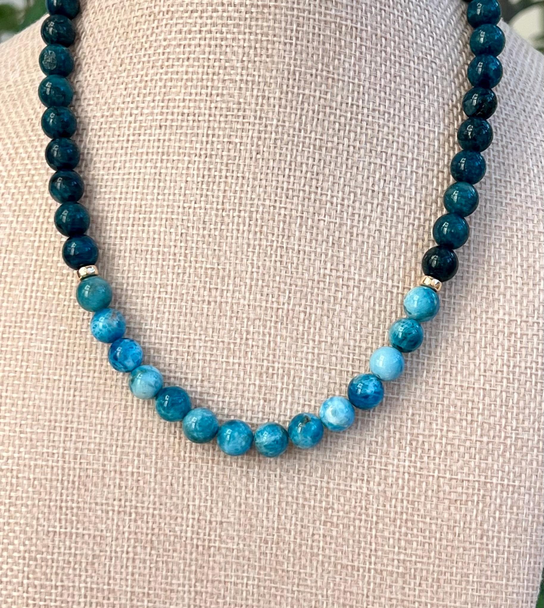Natural Gemstone Necklace. 10mm smooth round dark blue Apatite and Light Blue Apatite stones with a 18k gold filled clasp. Arrives thoughtfully packaged in an eco-friendly kraft box wrapped in ribbon, ready for gifting or keeping for yourself.