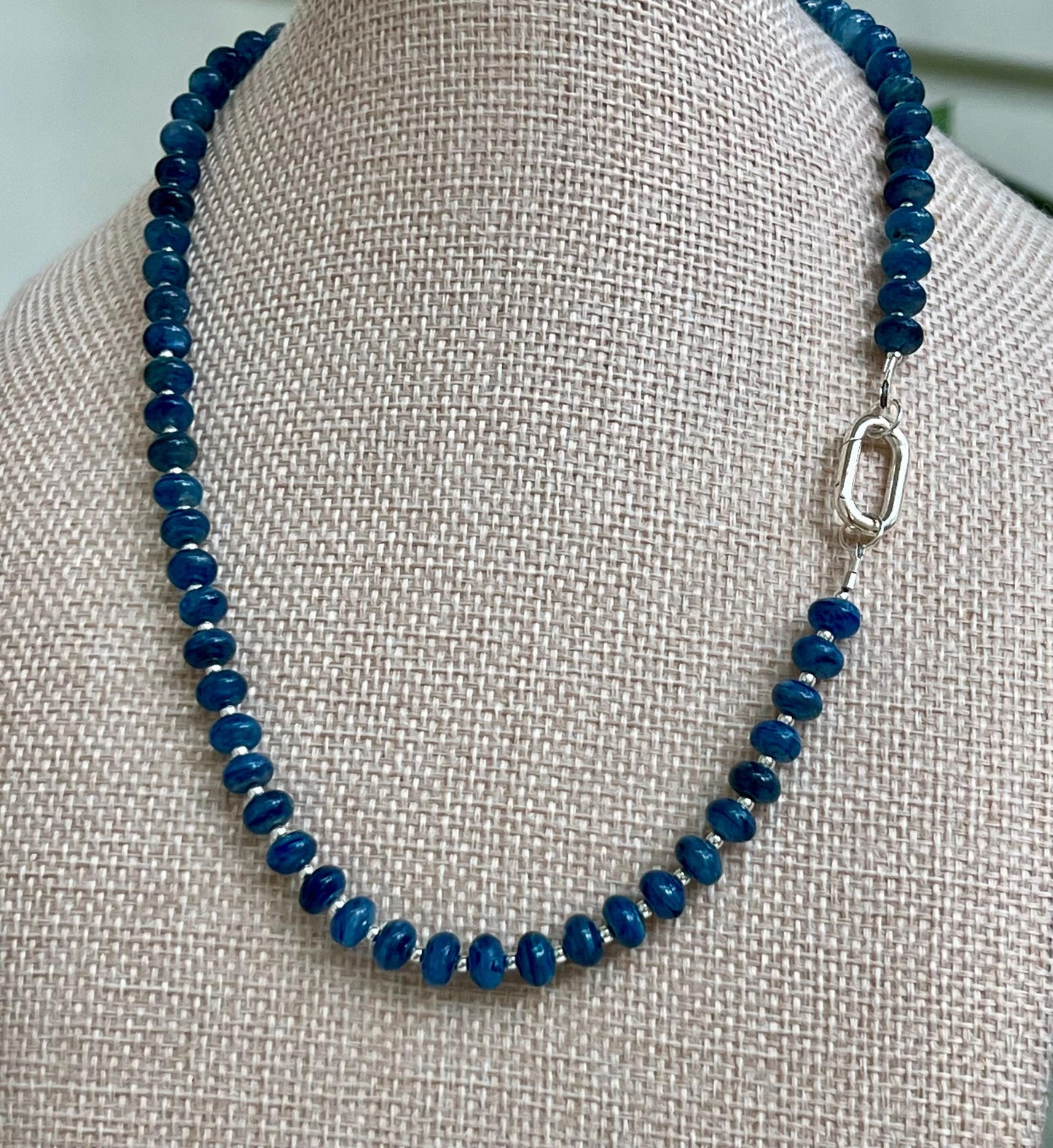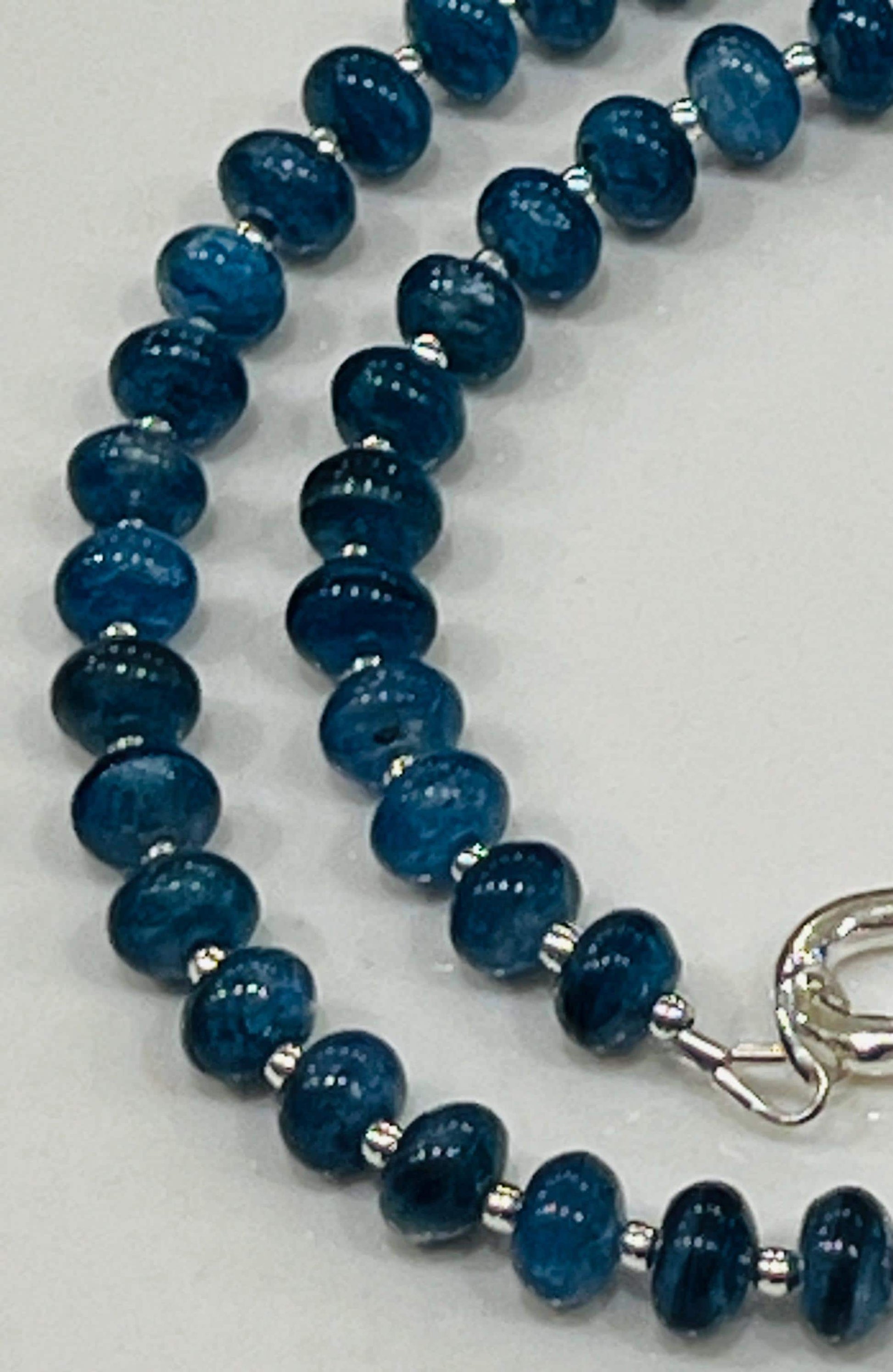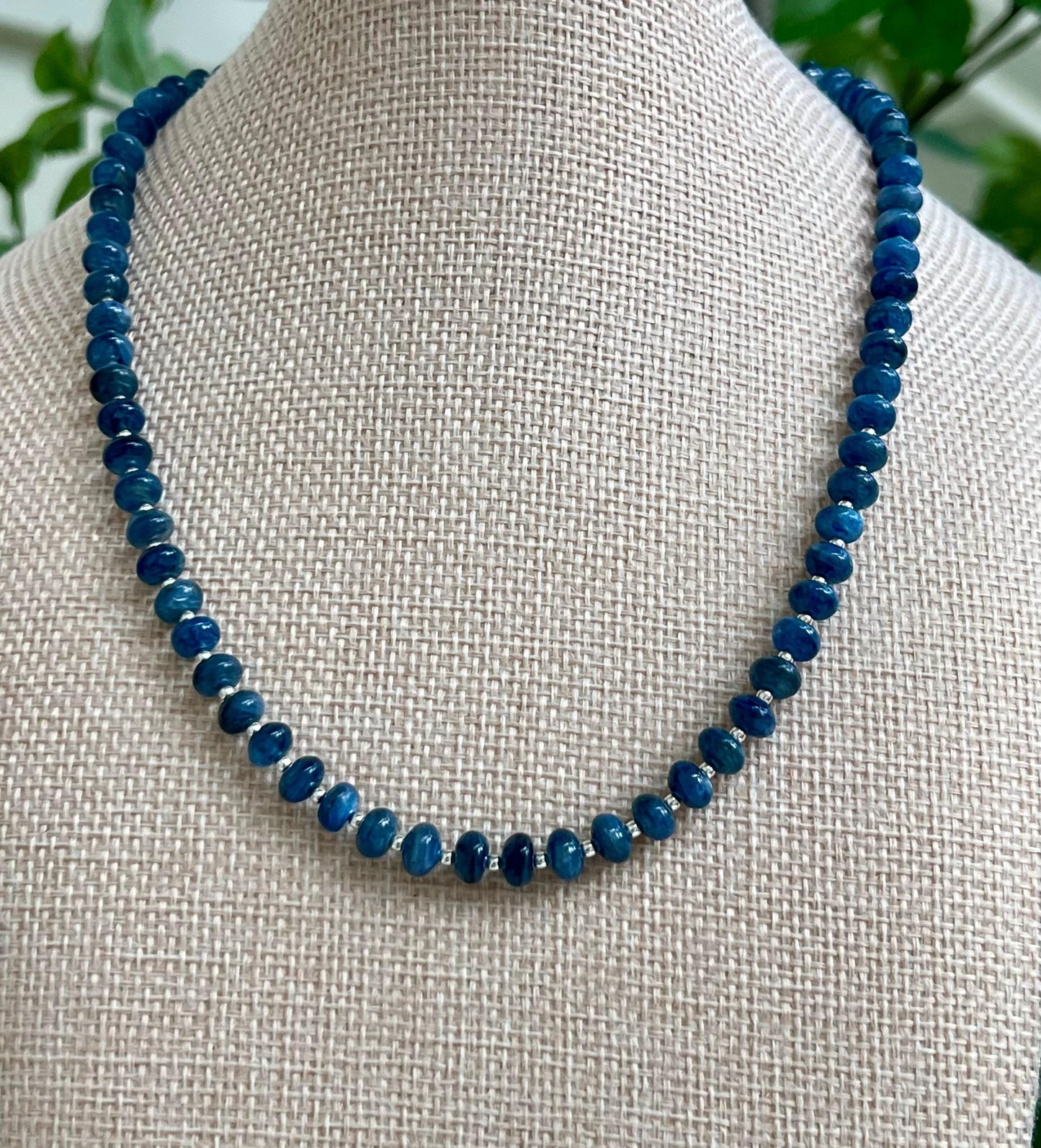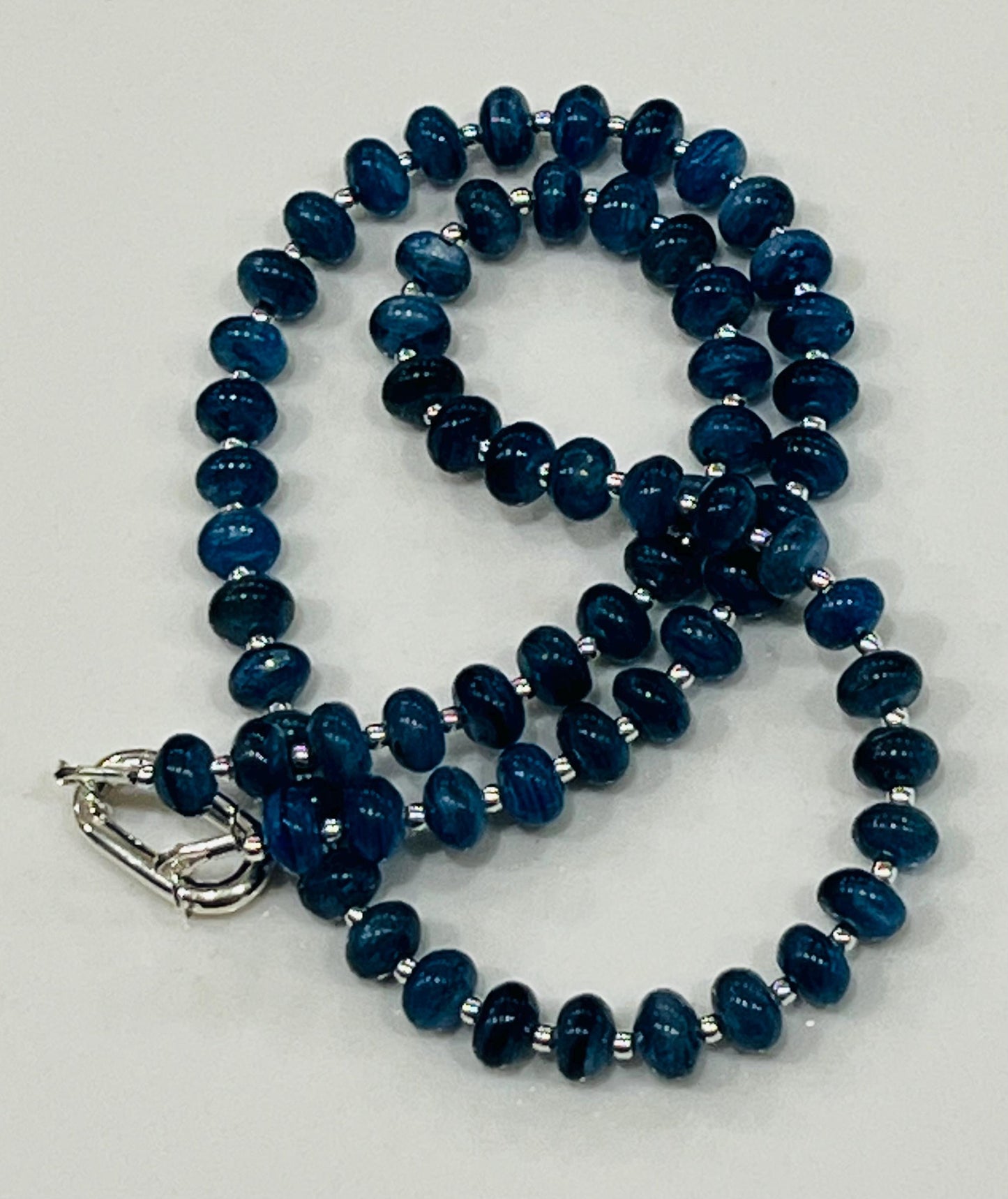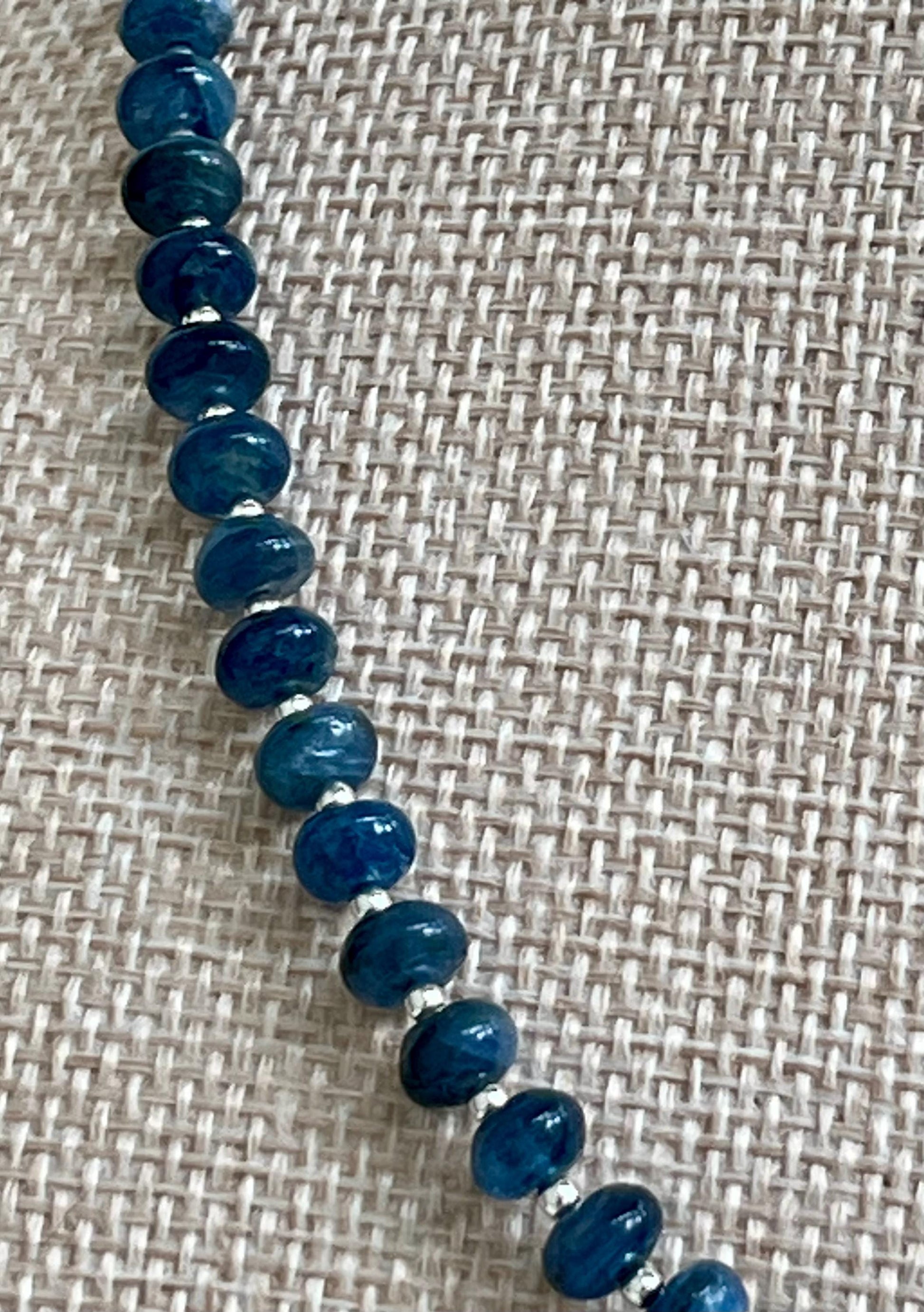 6.5x4mm Natural Blue Kyanite smooth rondelle stones with a 2mm sterling silver round smooth bead between each Kyanite stone. The necklace has a sterling silver spring clasp that allows for more strands to be easily added or pendants as well. This necklace is the perfect statement layering necklace. Arrives thoughtfully packaged in an eco-friendly kraft box wrapped in ribbon, ready for gifting or keeping for yourself.