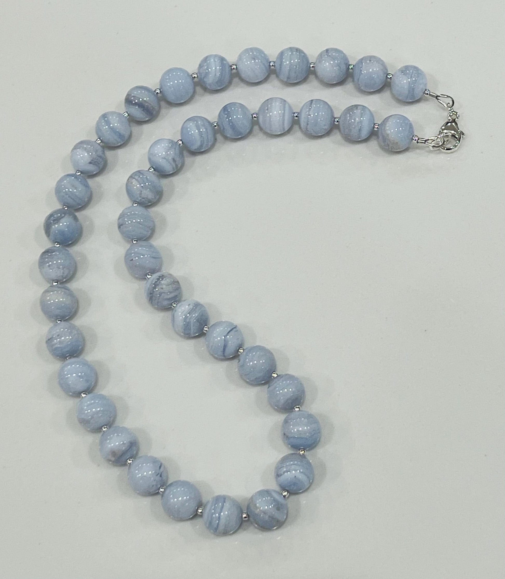 Natural Gemstone Necklace. Blue lace agate 10mm round smooth stones with a sterling silver spring clasp and a 2mm round smooth sterling silver bead between each blue lace agate stone. Arrives thoughtfully packaged in an eco-friendly kraft box wrapped in ribbon, ready for gifting or keeping for yourself.