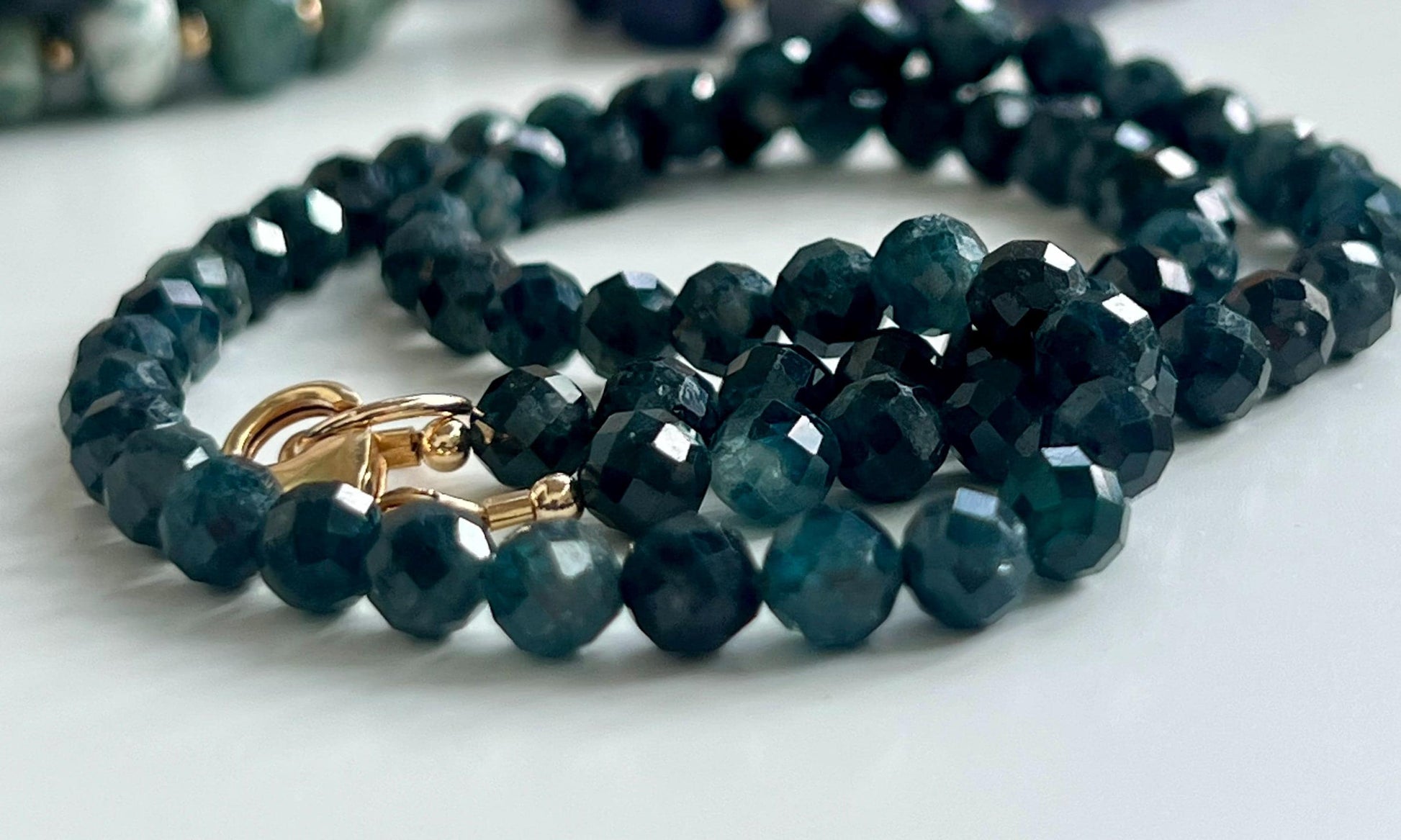 Blue tourmaline 6mm faceted round beads in this necklace with 18k gold filled clasp. Gorgeous super sparkly stones. Bohemian chic layering necklace or stand alone. Natural Gemstone Necklace. Arrives thoughtfully packaged in an eco-friendly kraft box wrapped in ribbon, ready for gifting or keeping for yourself.