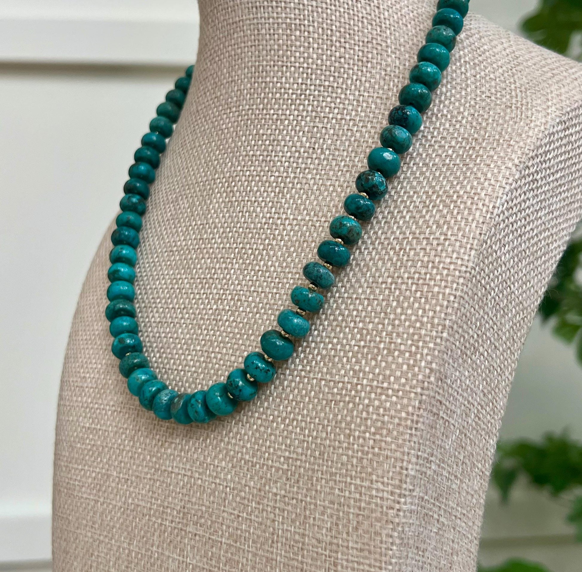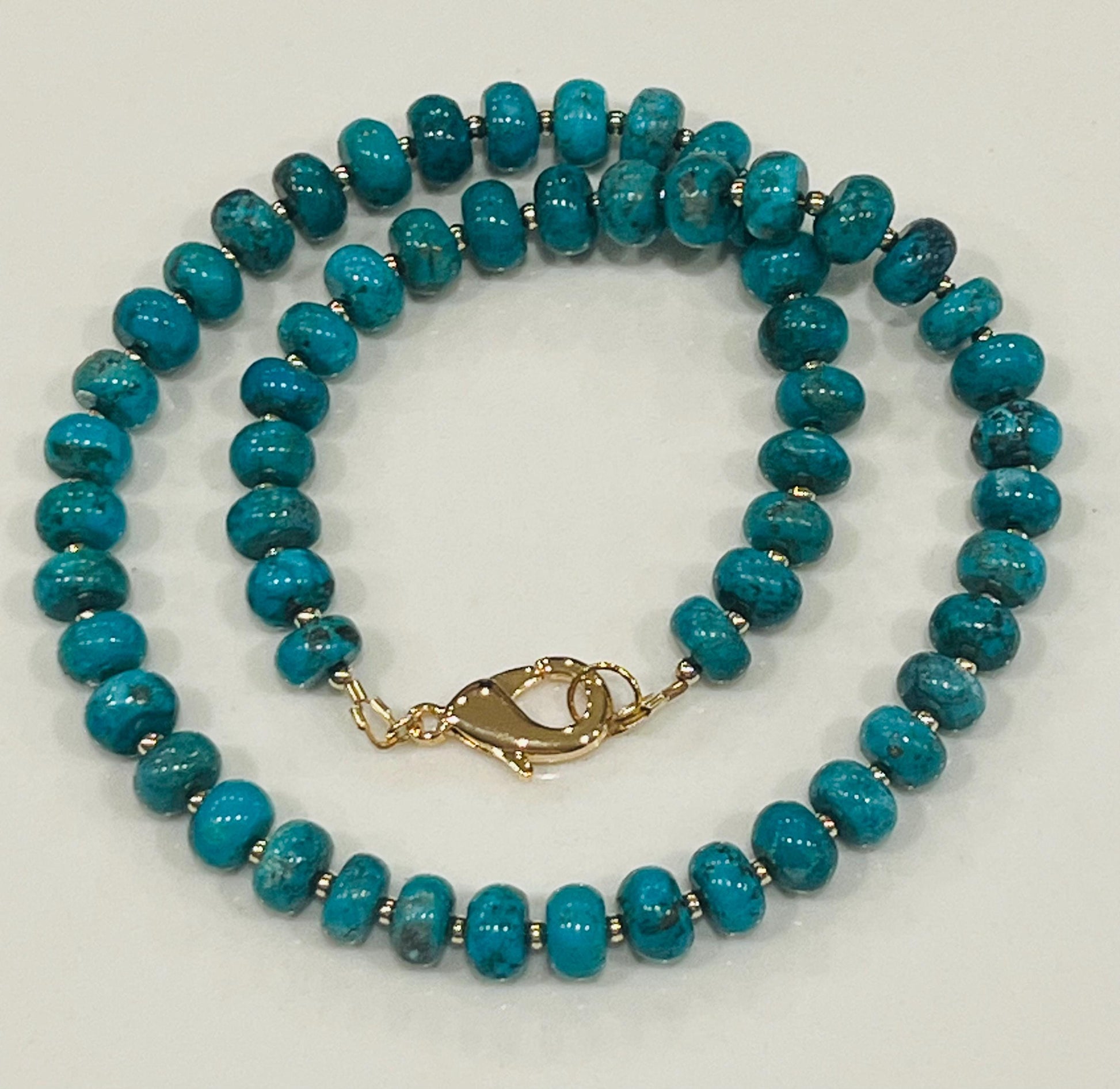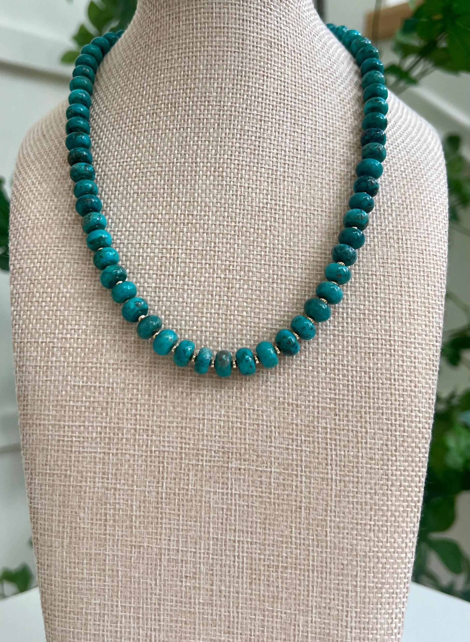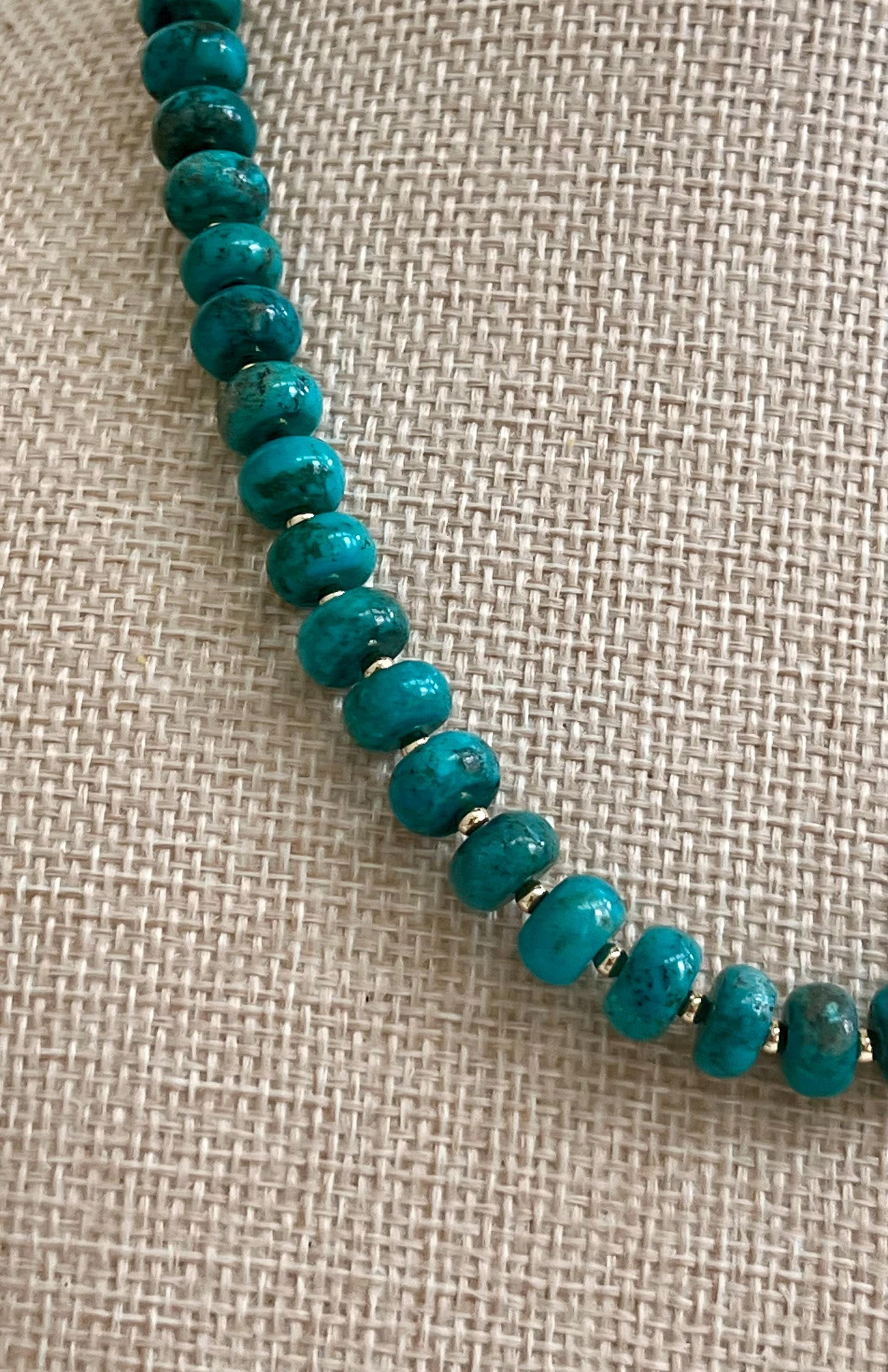 Natural Gemstone Necklace. 5x8mm smooth rondelle natural blue turquoise beaded necklace with gold filled lobster clasp and gold filled accent beads between each turquoise stone. Arrives thoughtfully packaged in an eco-friendly kraft box wrapped in ribbon, ready for gifting or keeping for yourself.