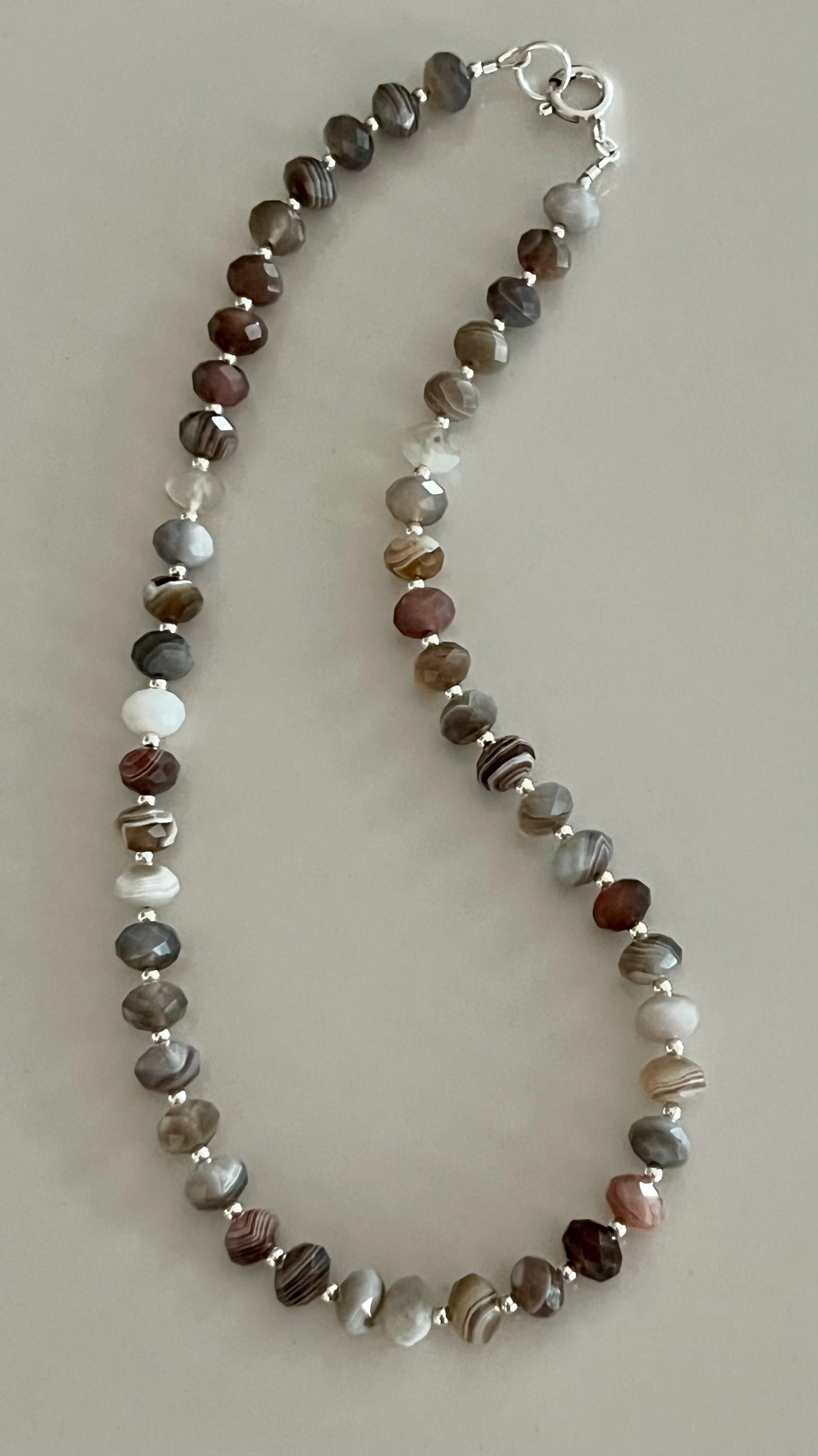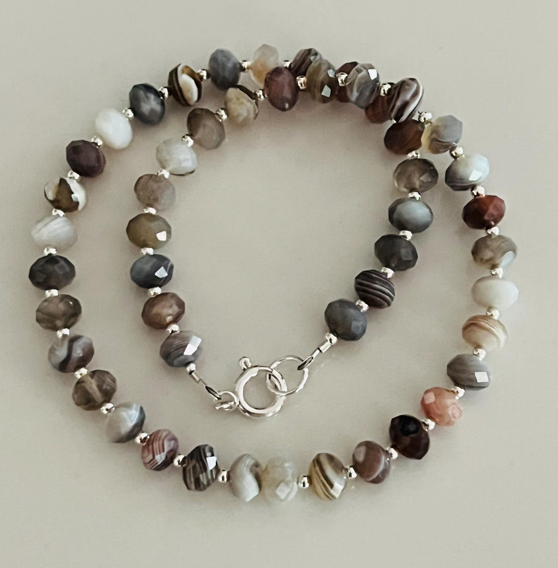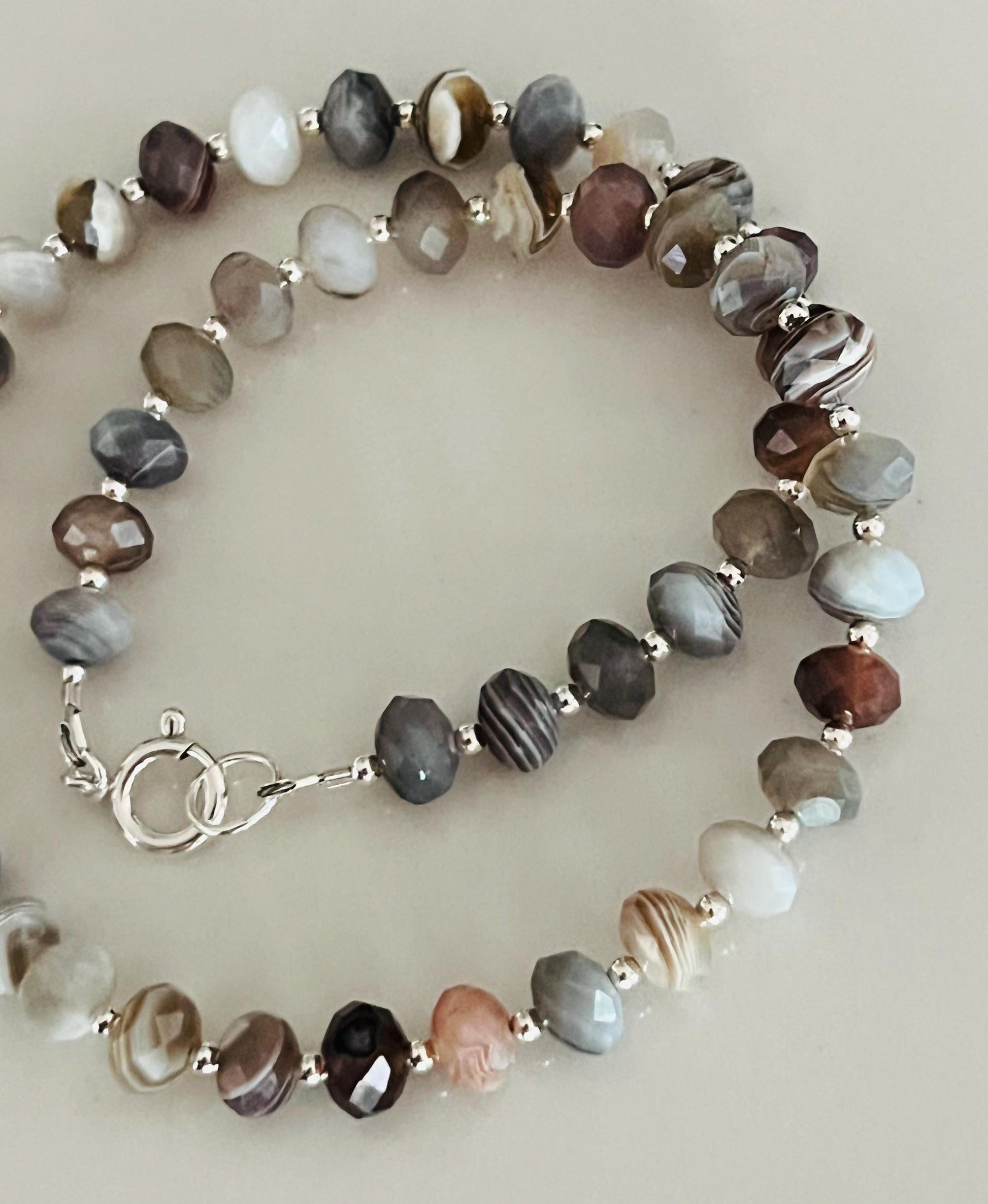 Botswana Agate faceted rondelle 8mm stones with a large sterling silver spring clasp. A 2.5mm sterling silver round bead sits between each Botswana agate stone. Arrives thoughtfully packaged in an eco-friendly kraft box wrapped in ribbon, ready for gifting or keeping for yourself.