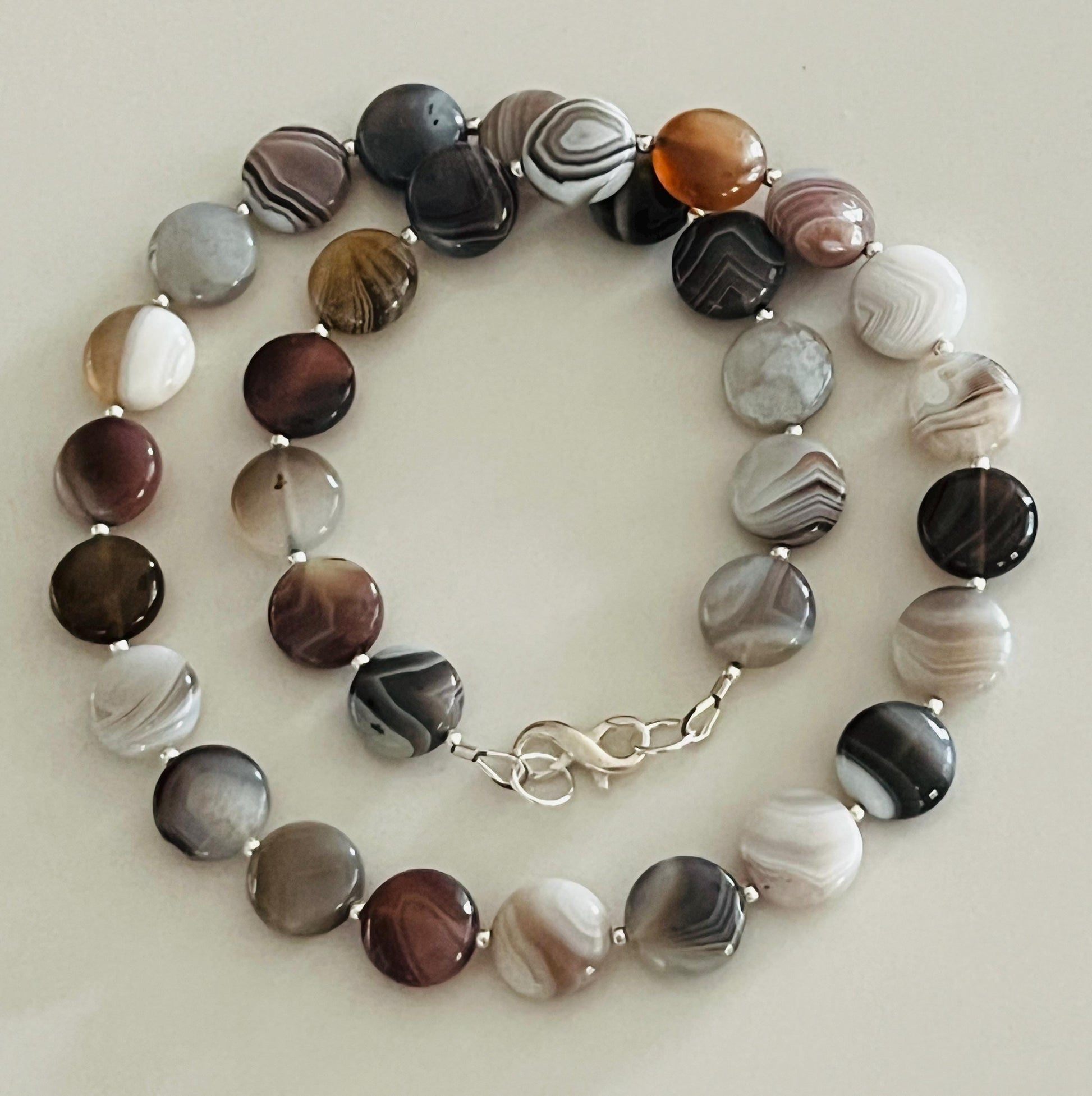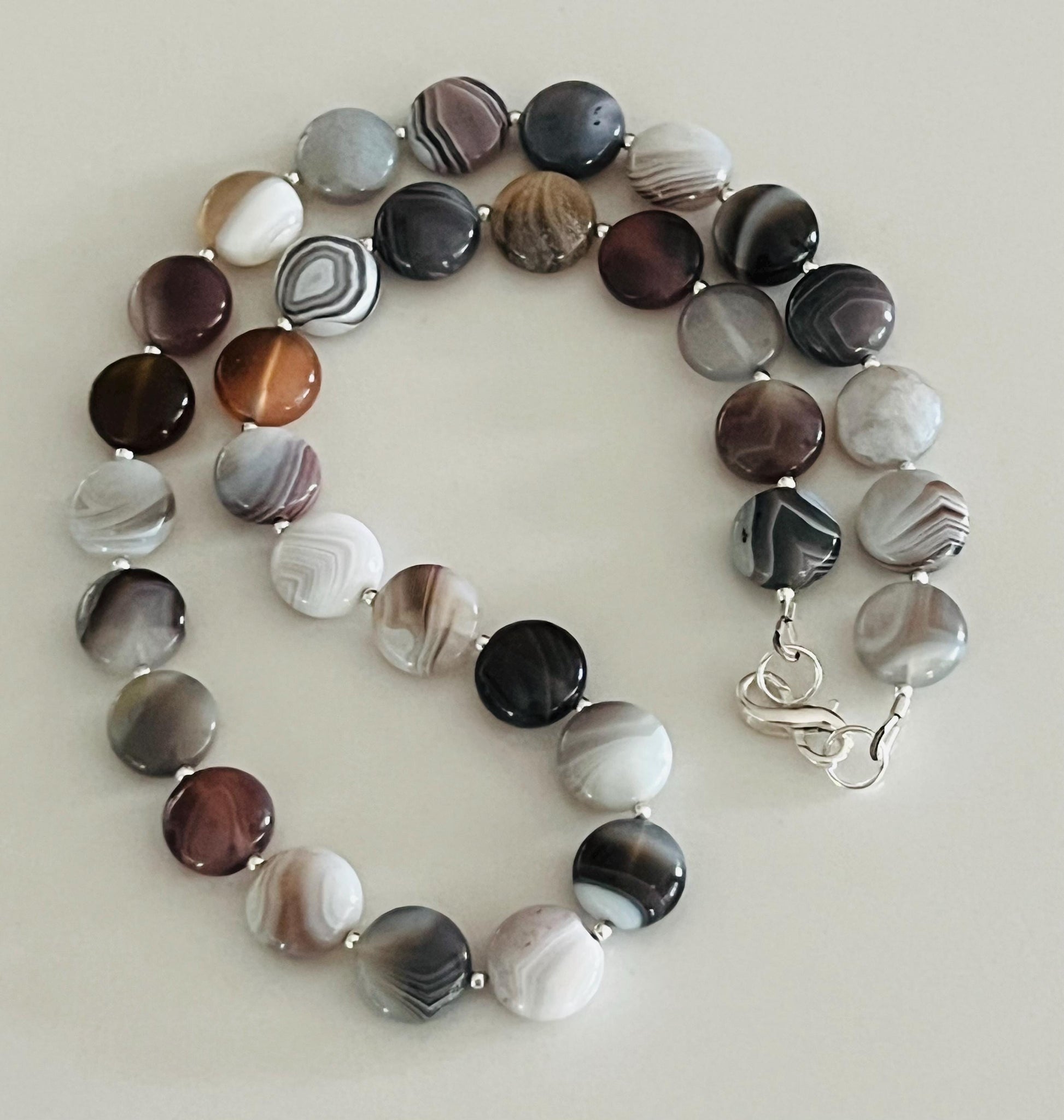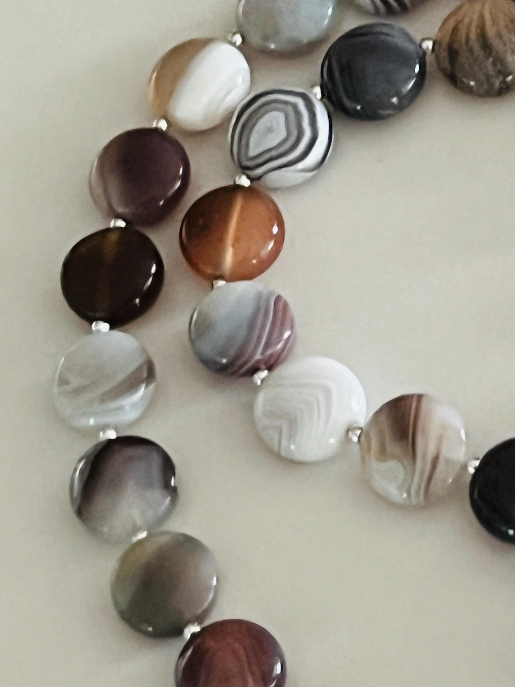 12mm smooth coin Botswana Agate stones with a sterling silver lobster clasp. A 2mm sterling silver round bead sits between each Botswana agate stone. Arrives thoughtfully packaged in an eco-friendly kraft box wrapped in ribbon, ready for gifting or keeping for yourself.