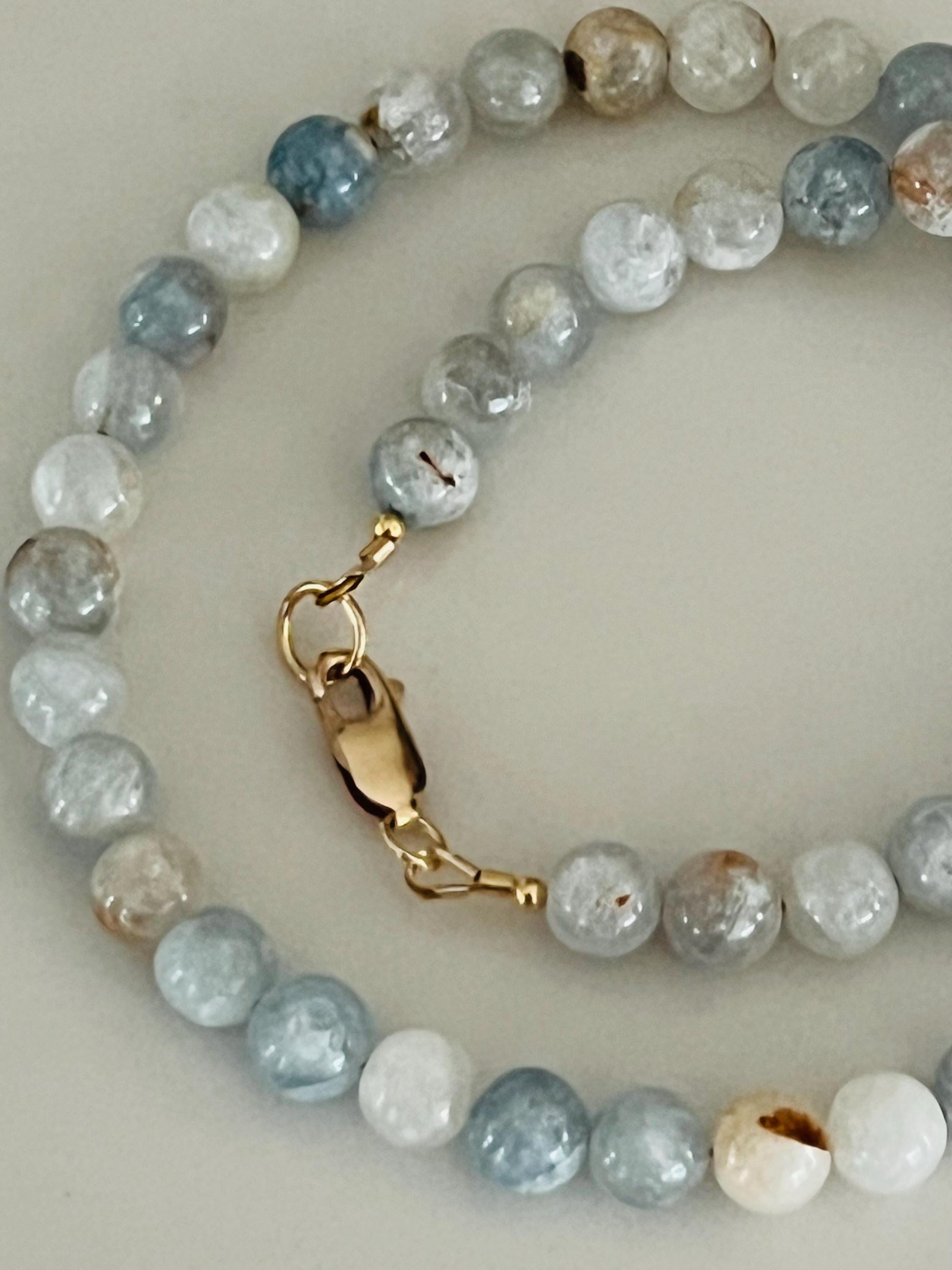 Celestite smooth round 8mm beads with an 18th gold filled clasp. Arrives thoughtfully packaged in an eco-friendly kraft box wrapped in ribbon, ready for gifting or keeping for yourself.