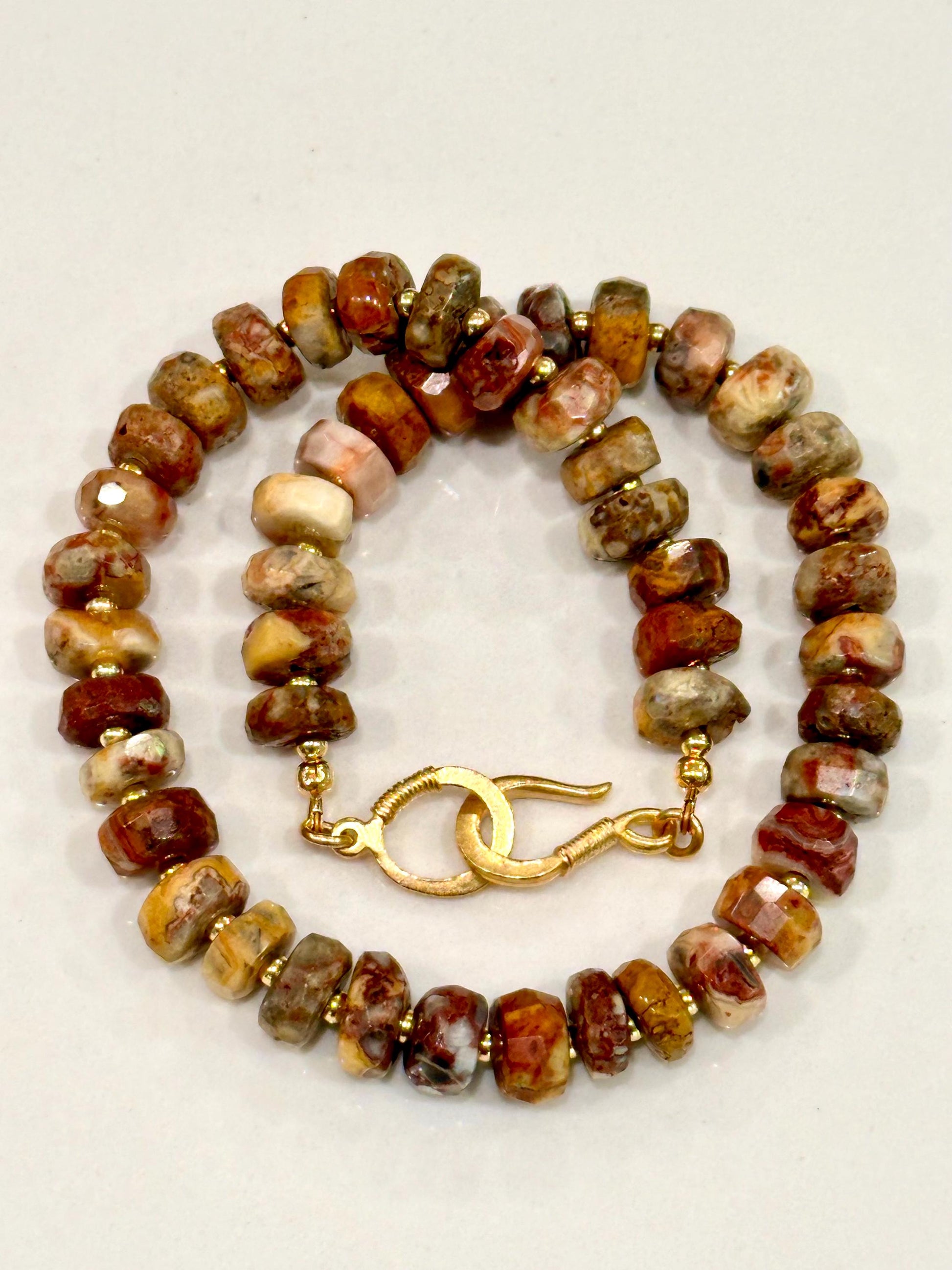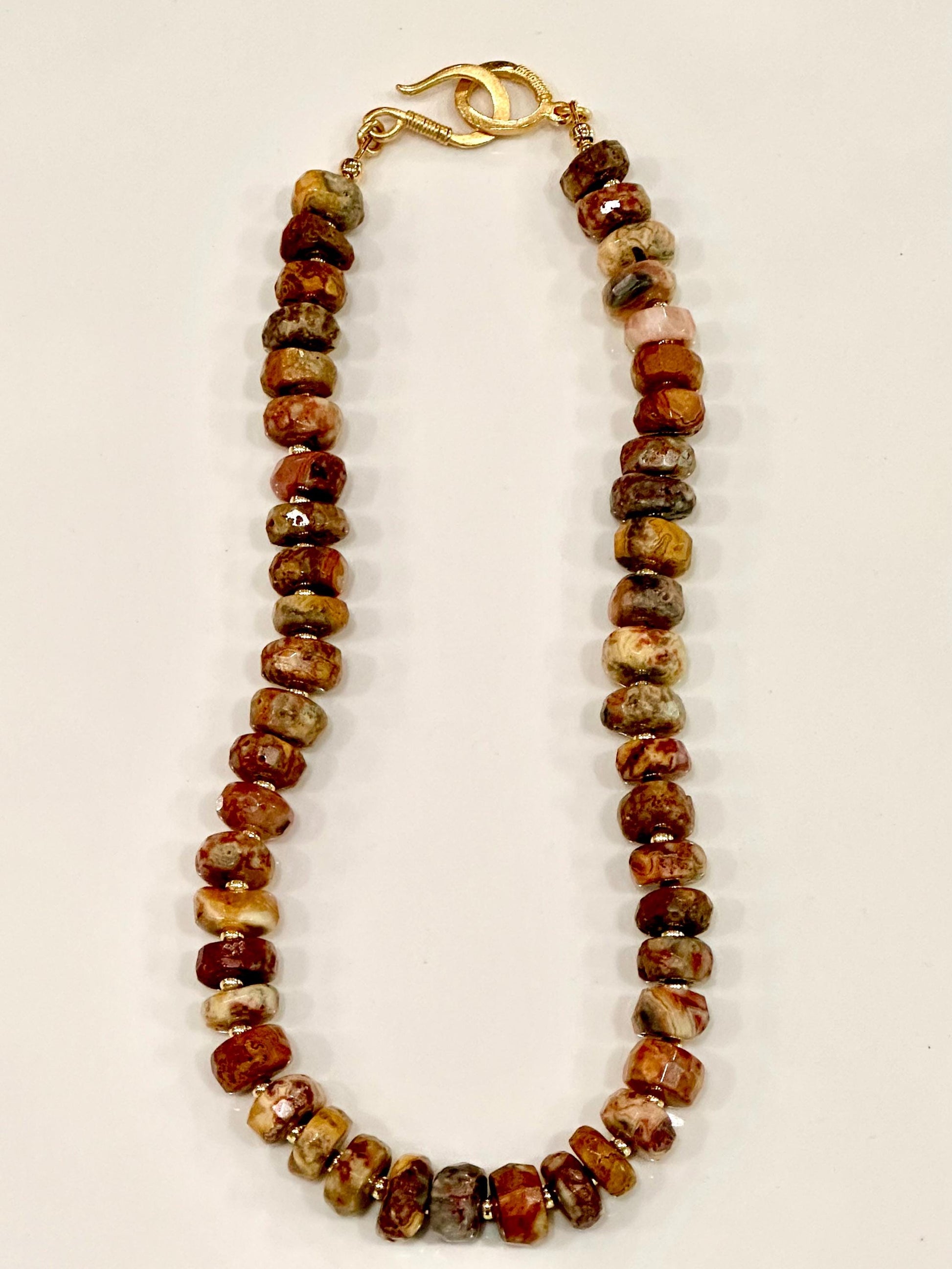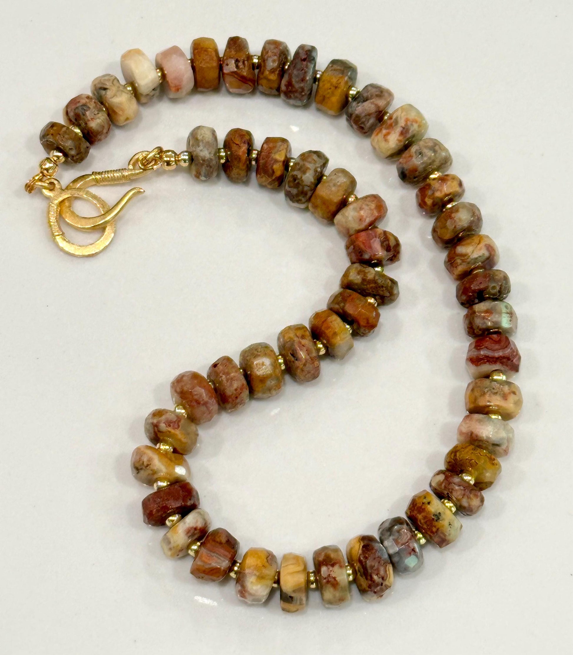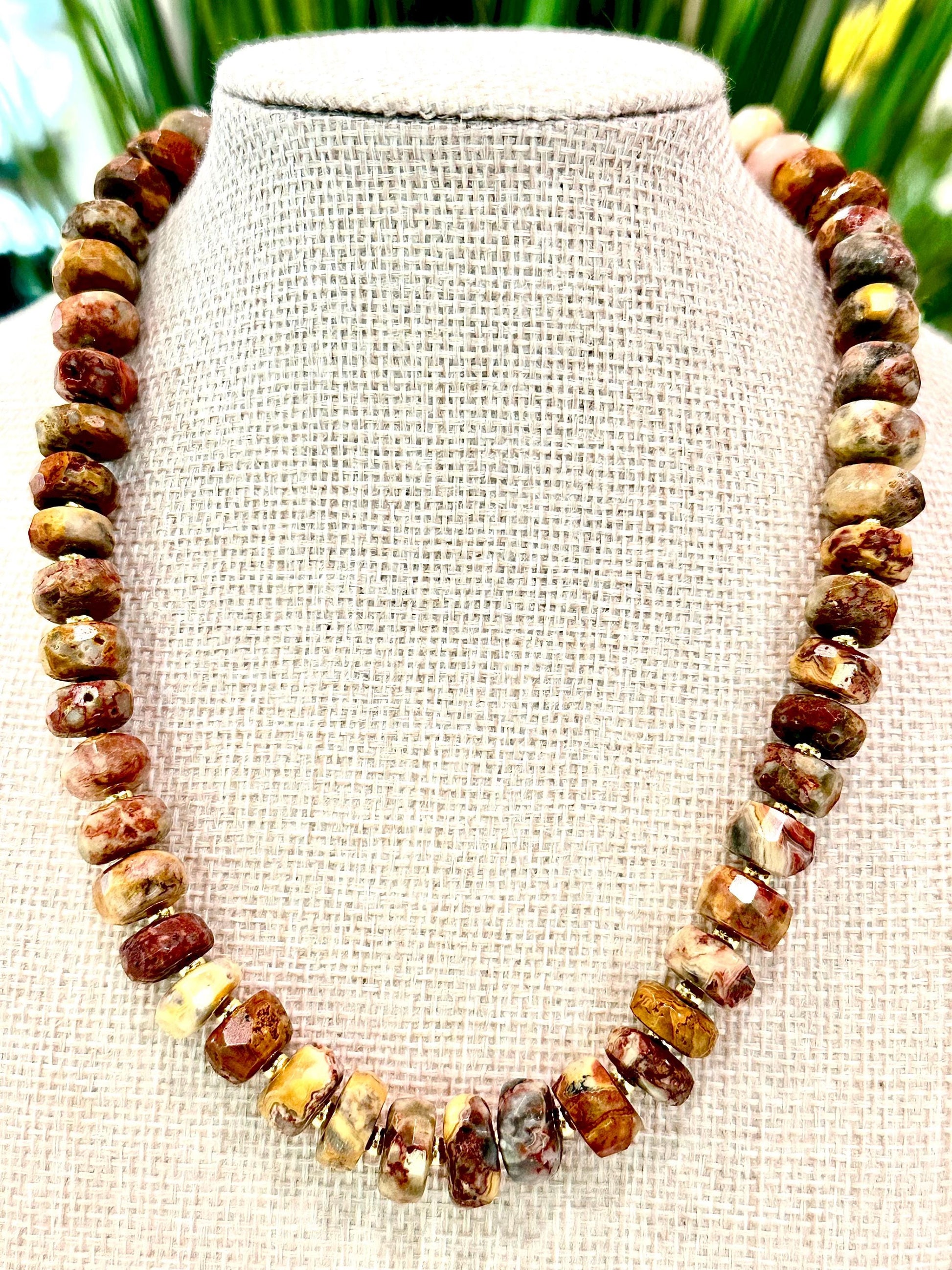 Gorgeous earth toned crazy lace agate faceted wheel stones make up this stunning statement necklace with gold plated pewter non-tarnish decorative hook and eye clasp/beads between each stone. Arrives thoughtfully packaged in an eco-friendly kraft box wrapped in ribbon, ready for gifting or keeping for yourself.