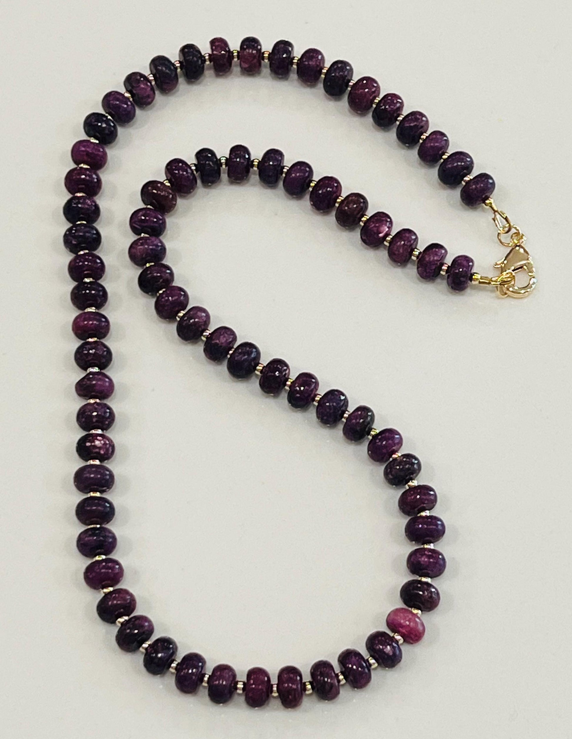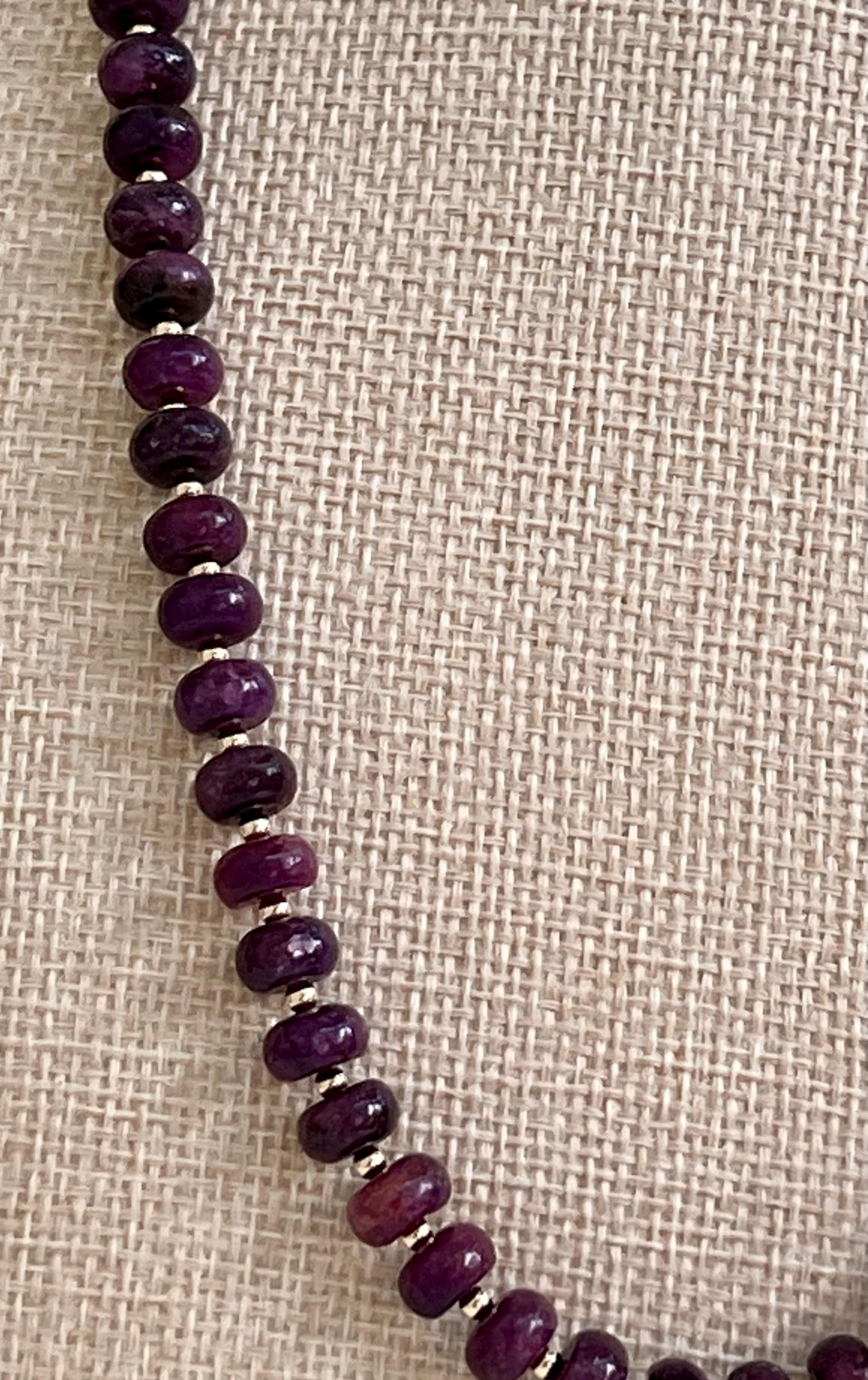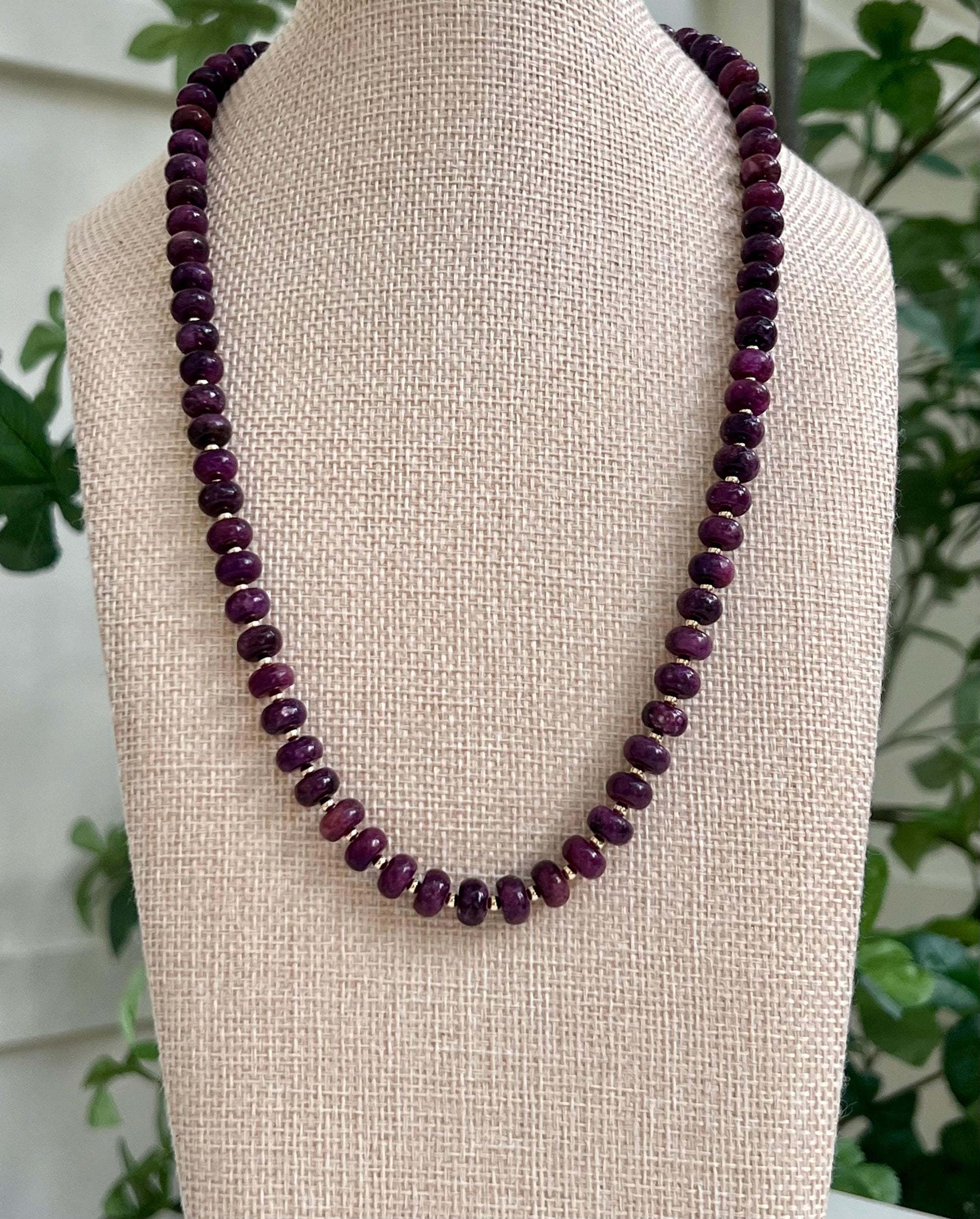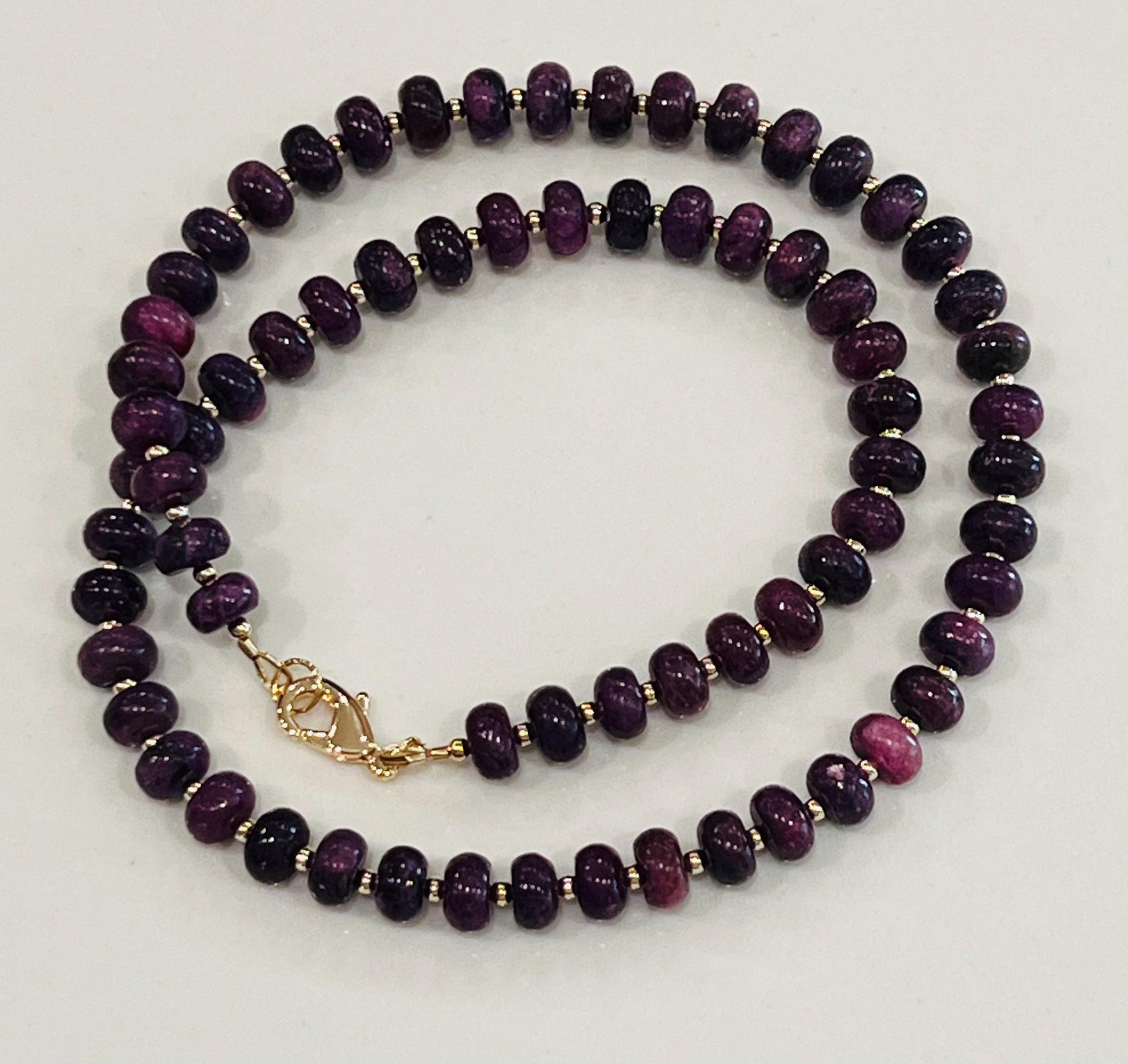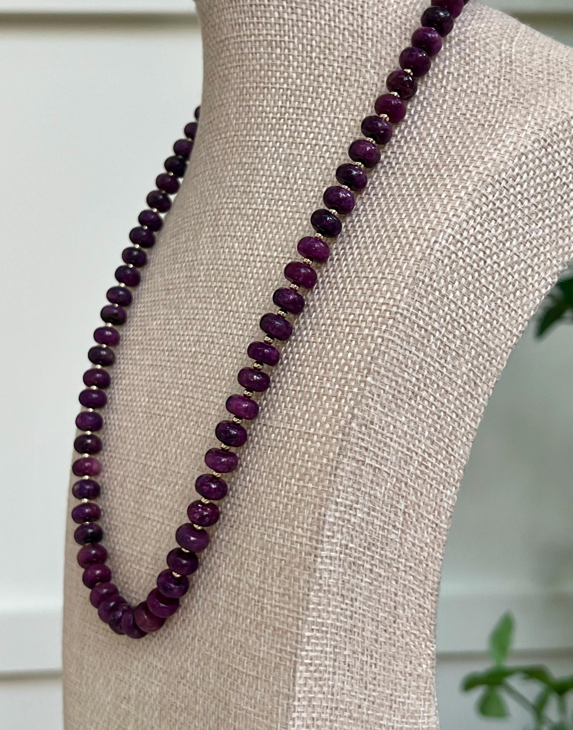 Natural gemstone necklace. Natural Dark Lepidolite 5x8mm smooth rondelle beaded necklace with 18k gold filled lobster clasp and gold filled round accent beads between each Lepidolite stone. Arrives thoughtfully packaged in an eco-friendly kraft box wrapped in ribbon, ready for gifting or keeping for yourself.