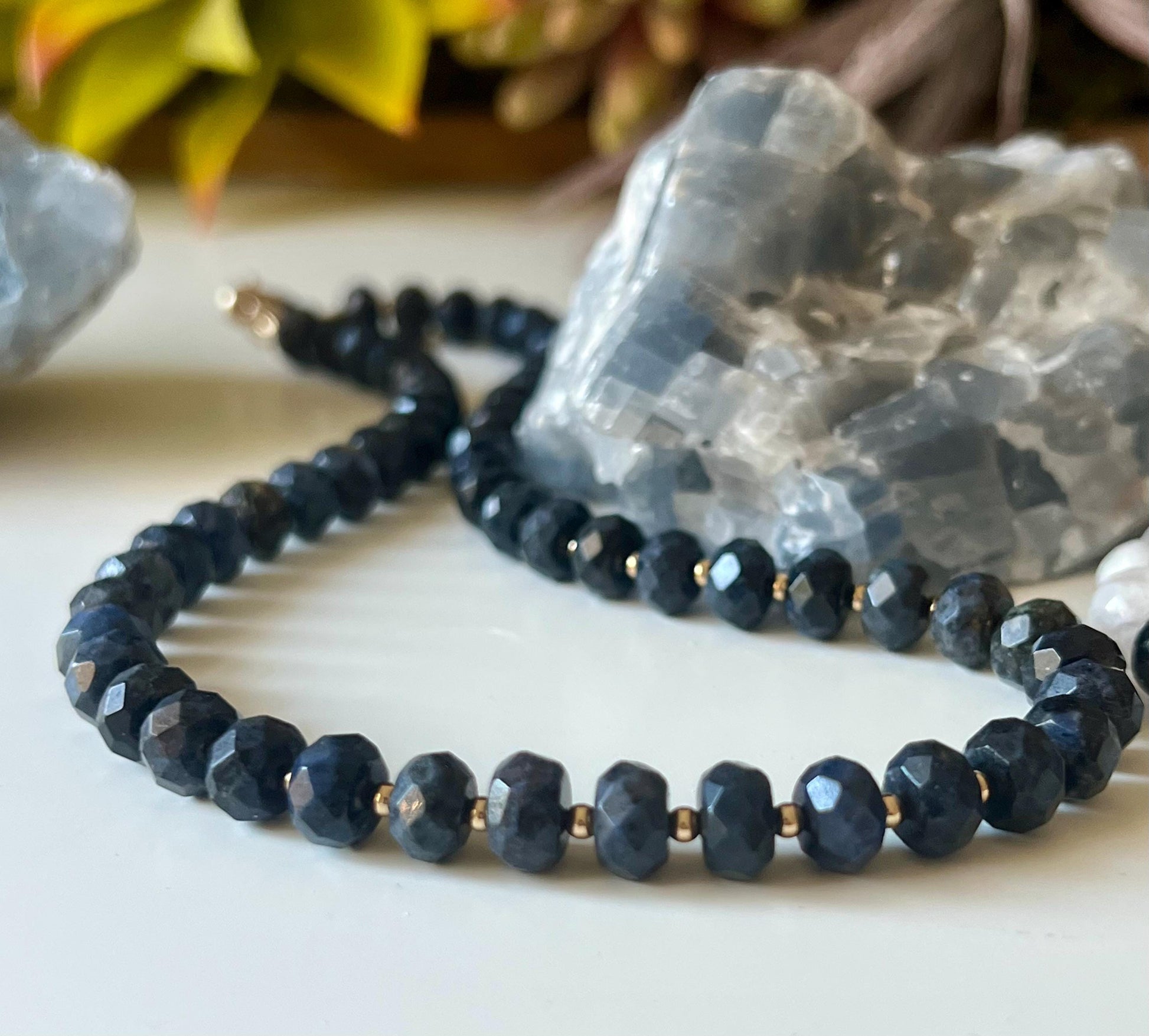 Natural Gemstone Necklace. Blue Dumortierite 8mm faceted Rondelle beads with gold filled beads between each stone and a gold filled clasp. Arrives thoughtfully packaged in an eco-friendly kraft box wrapped in ribbon, ready for gifting or keeping for yourself.