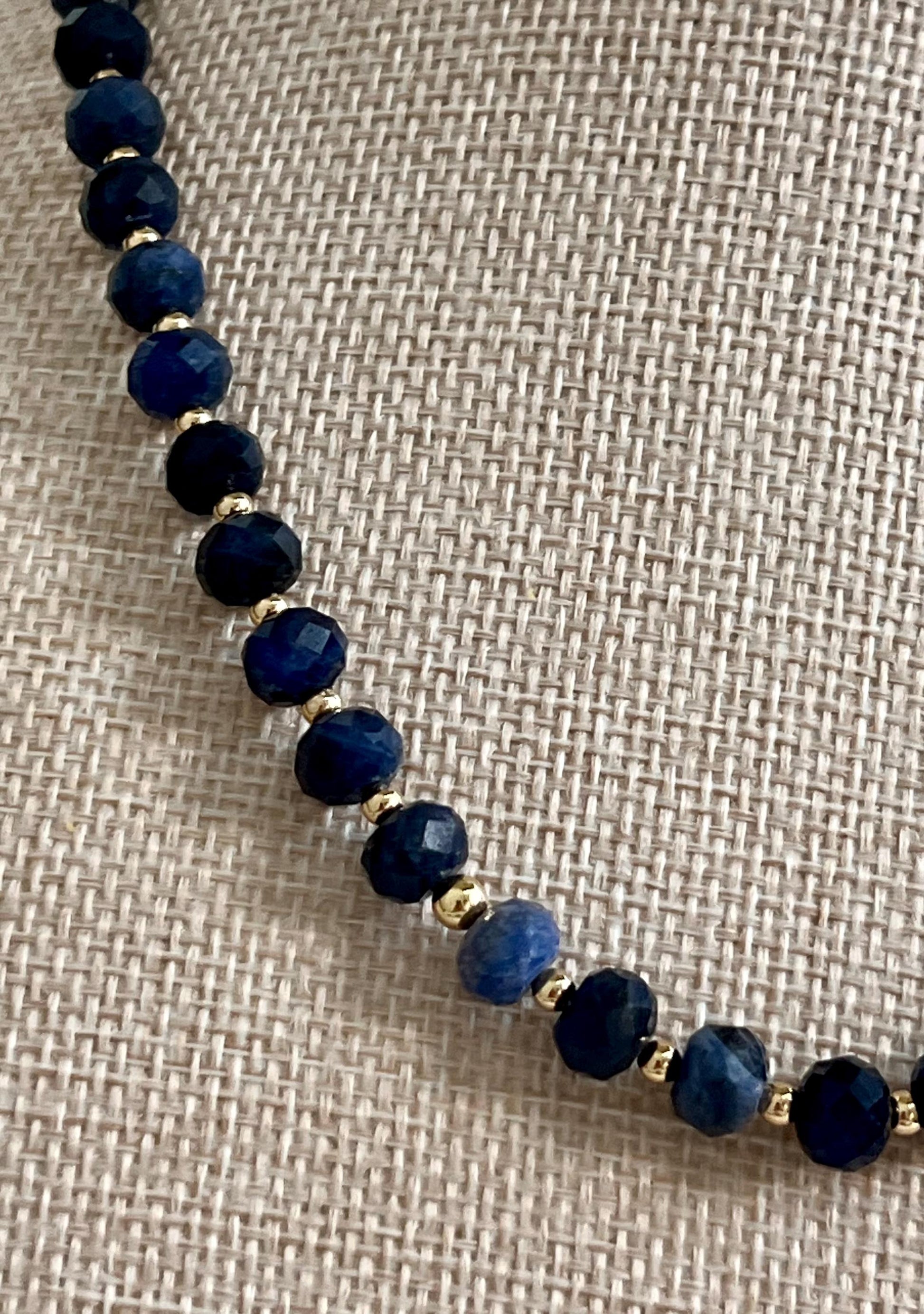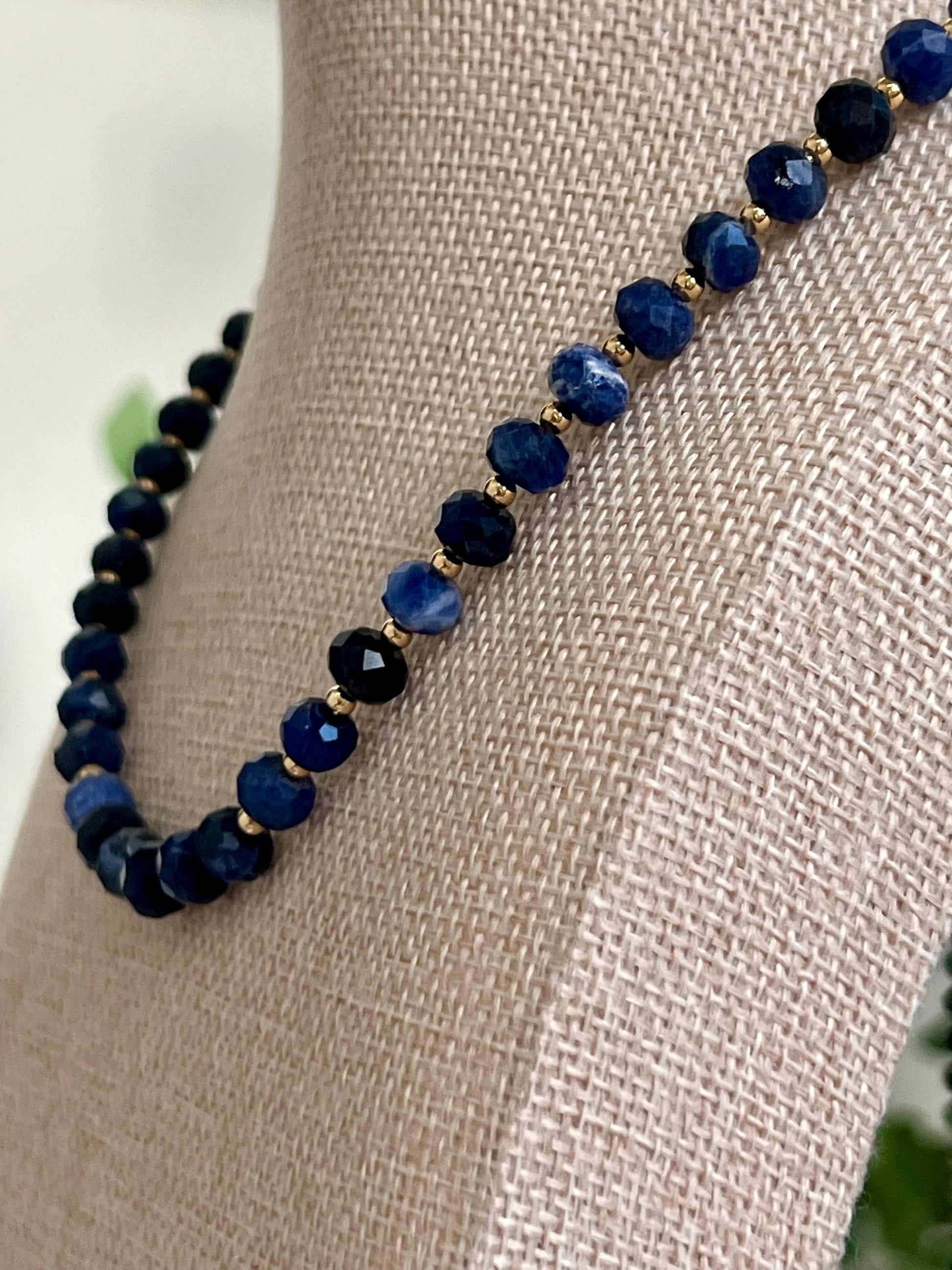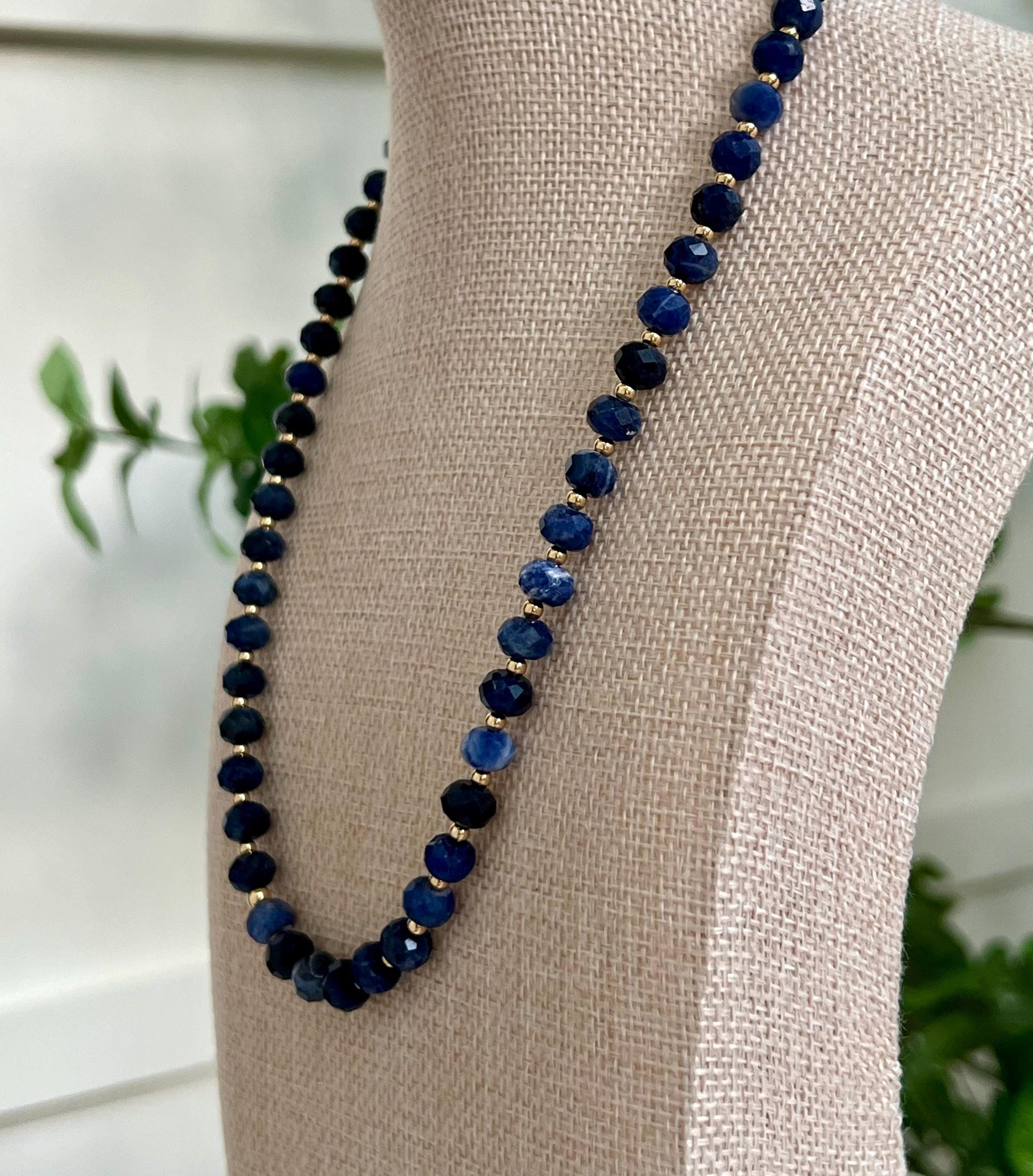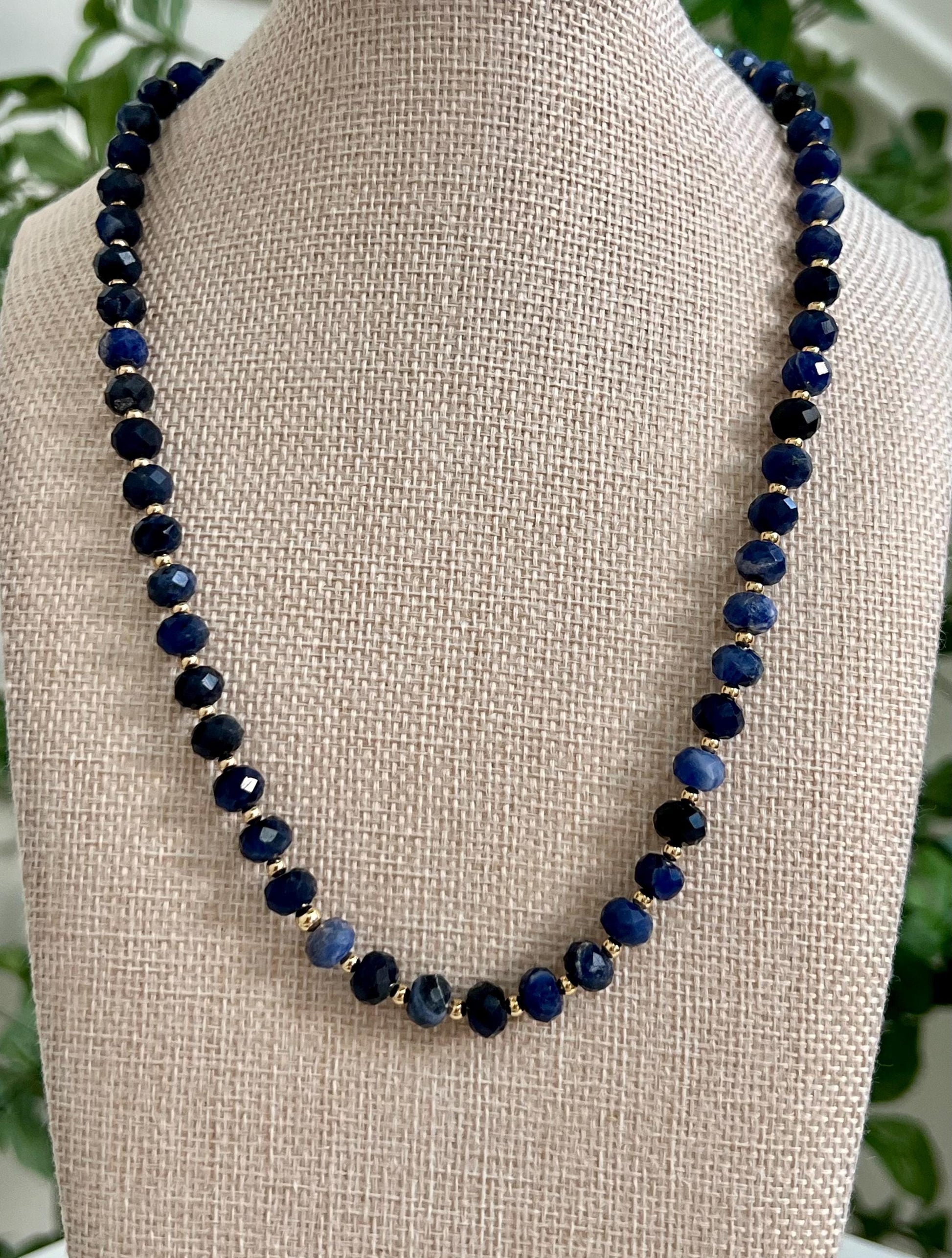 Natural Gemstone Necklace. 5x8mm faceted rondelle sodalite beaded necklace with 3mm gold filled beads between each sodalite stone and a large 18k gold filled lobster clasp. Sodalite is traditionally associated with intellectualism and communication. It's thought to improve clarity, self-expression, intuition, insight, wisdom, emotional stability, and calm. Sodalite is frequently recommended for artists, writers, and other creatives.Arrives thoughtfully packaged in an eco-friendly kraft box wrapped in ribbon, ready for gifting or keeping for yourself.