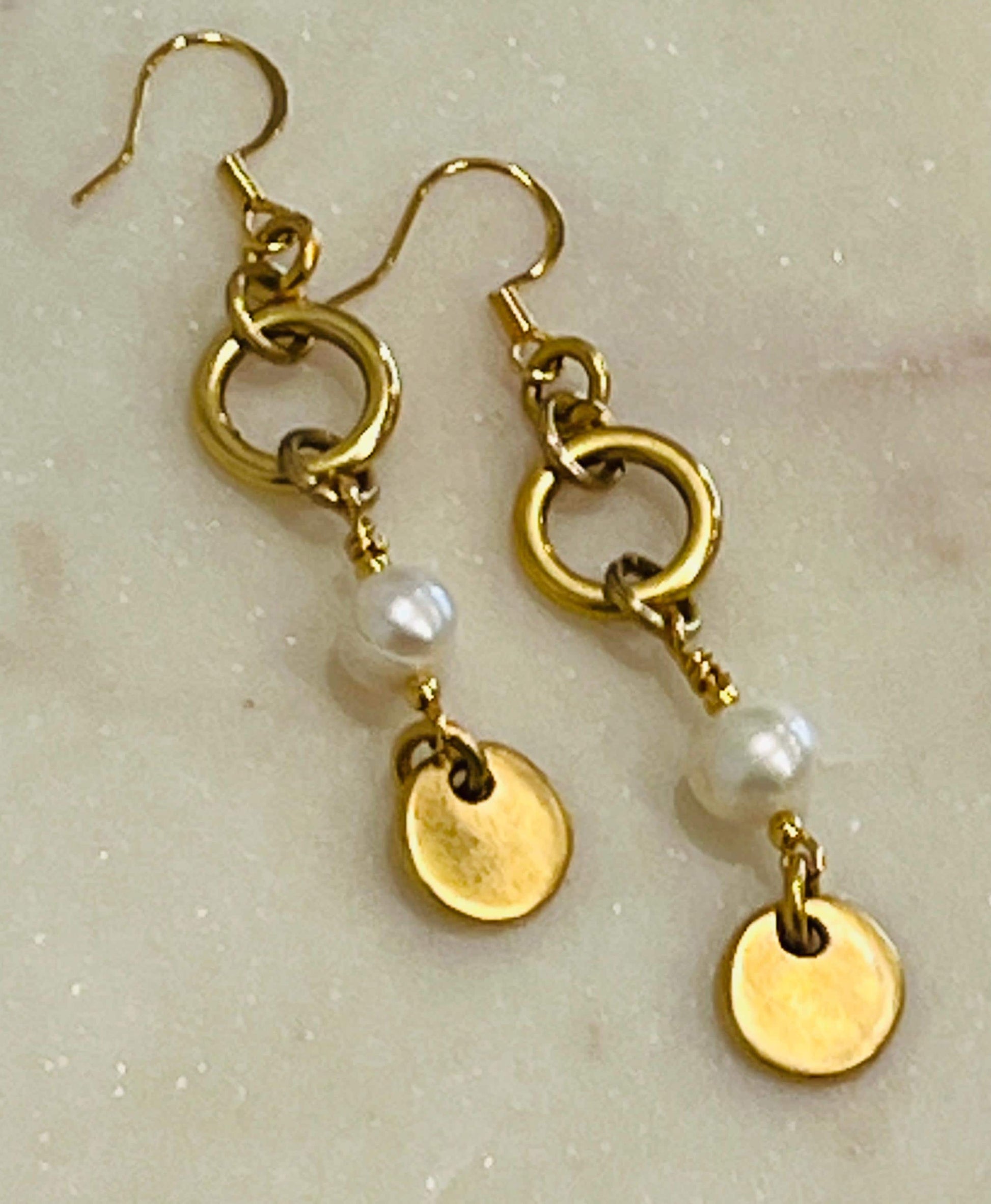 Freshwater Pearl drop earrings with non-tarnish gold plated pewter round frames and gold plated stainless steel ear wires. 2.5 inches in length. Arrives thoughtfully packaged in an eco-friendly kraft box wrapped in ribbon, ready for gifting or keeping for yourself.