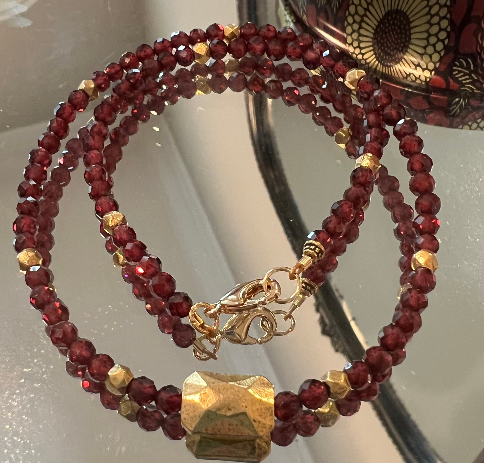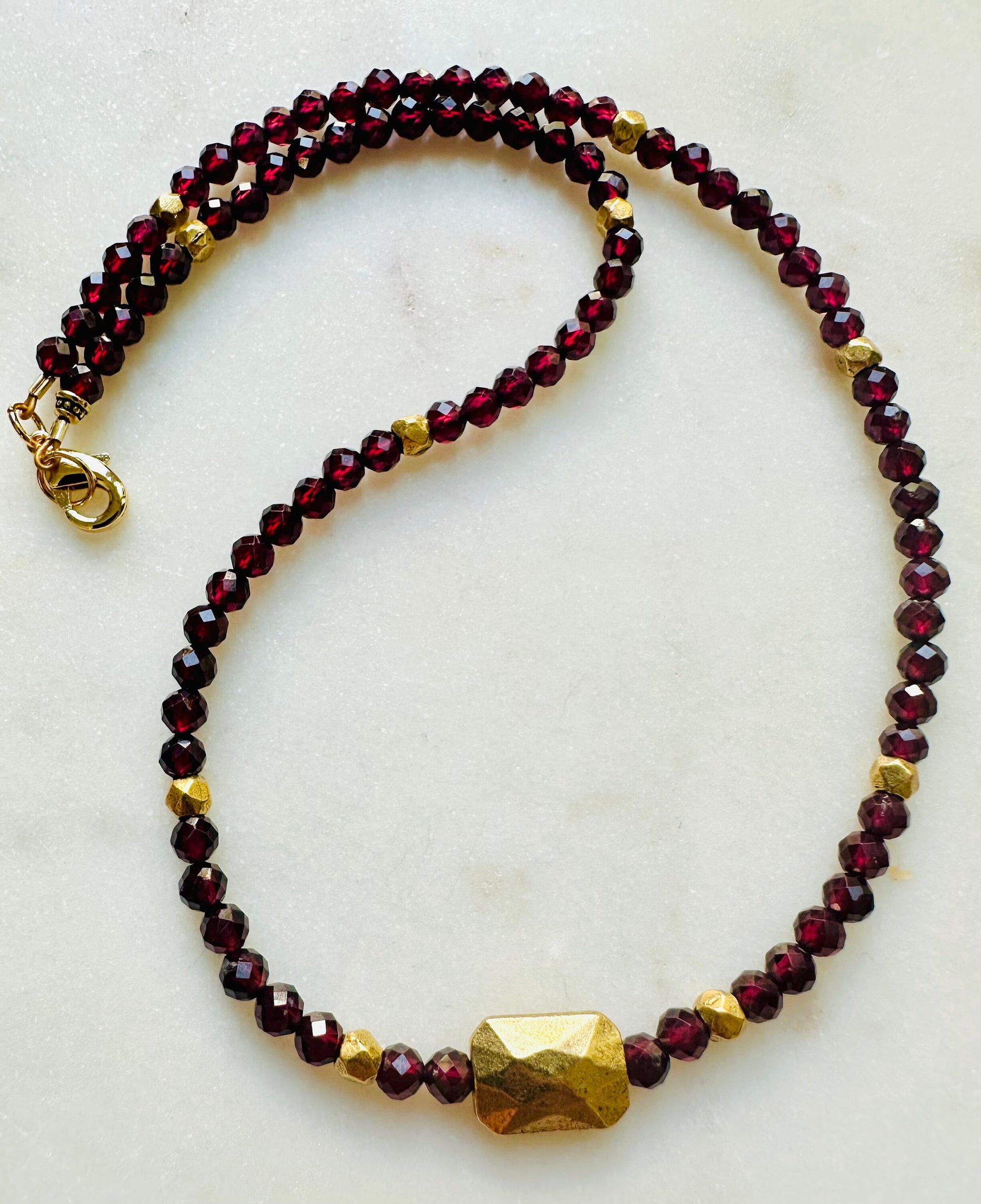 4mm faceted round garnet gemstones with 18k gold filled clasp. Non-tarnish gold plated pewter accent beads. Natural Gemstone Necklace. Ruby is said to stimulate heart chakra and bring spiritual wisdom while shielding against psychic attacks.Arrives thoughtfully packaged in an eco-friendly kraft box wrapped in ribbon, ready for gifting or keeping for yourself.
