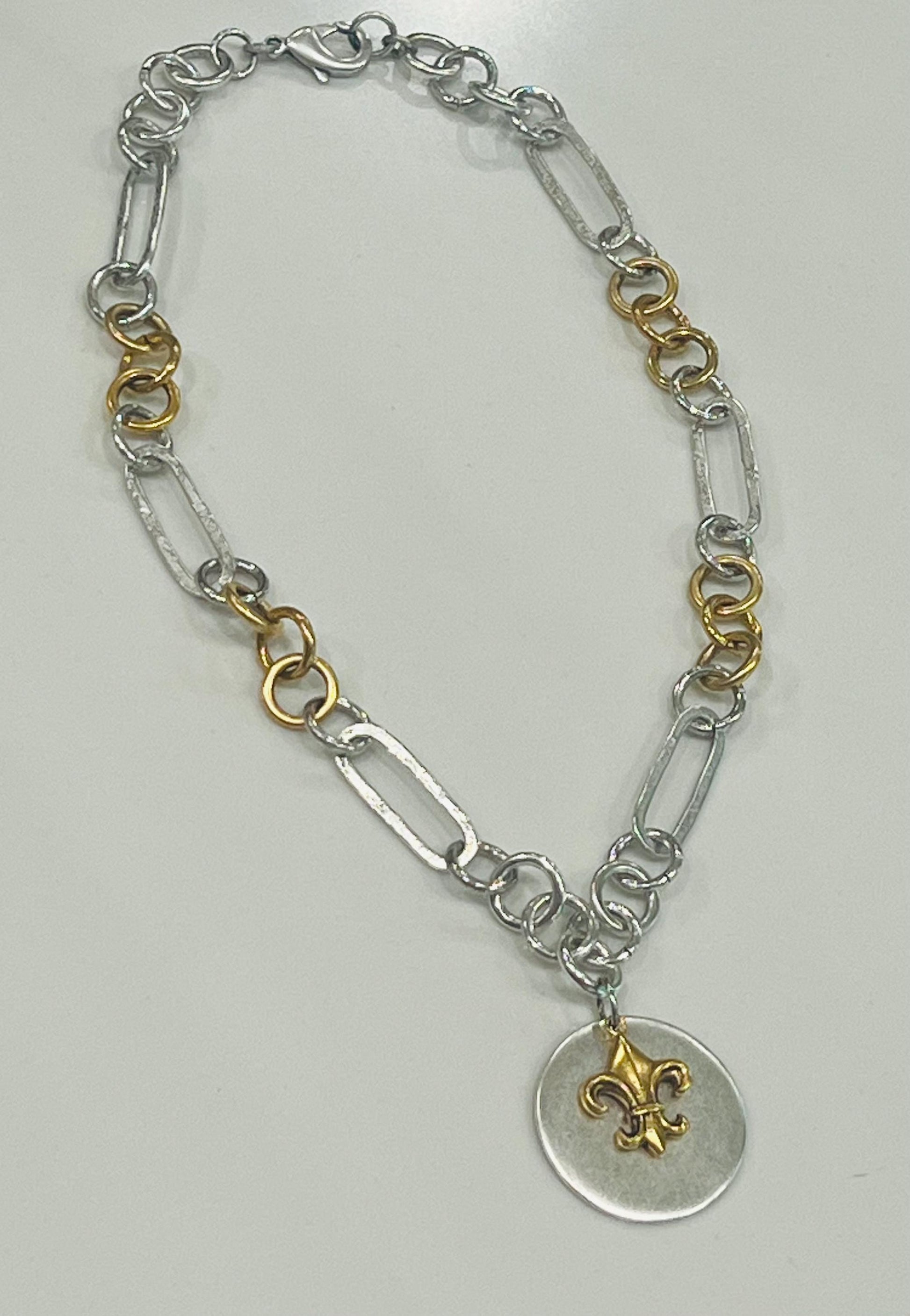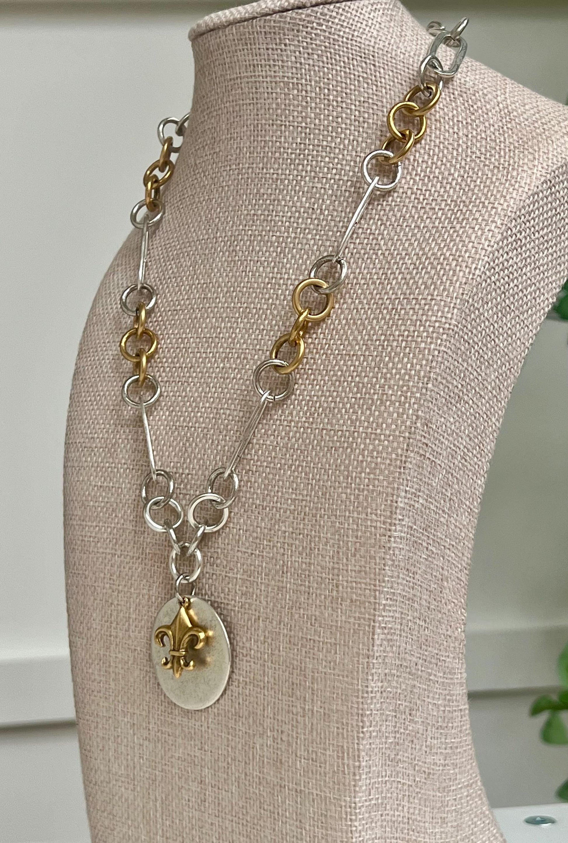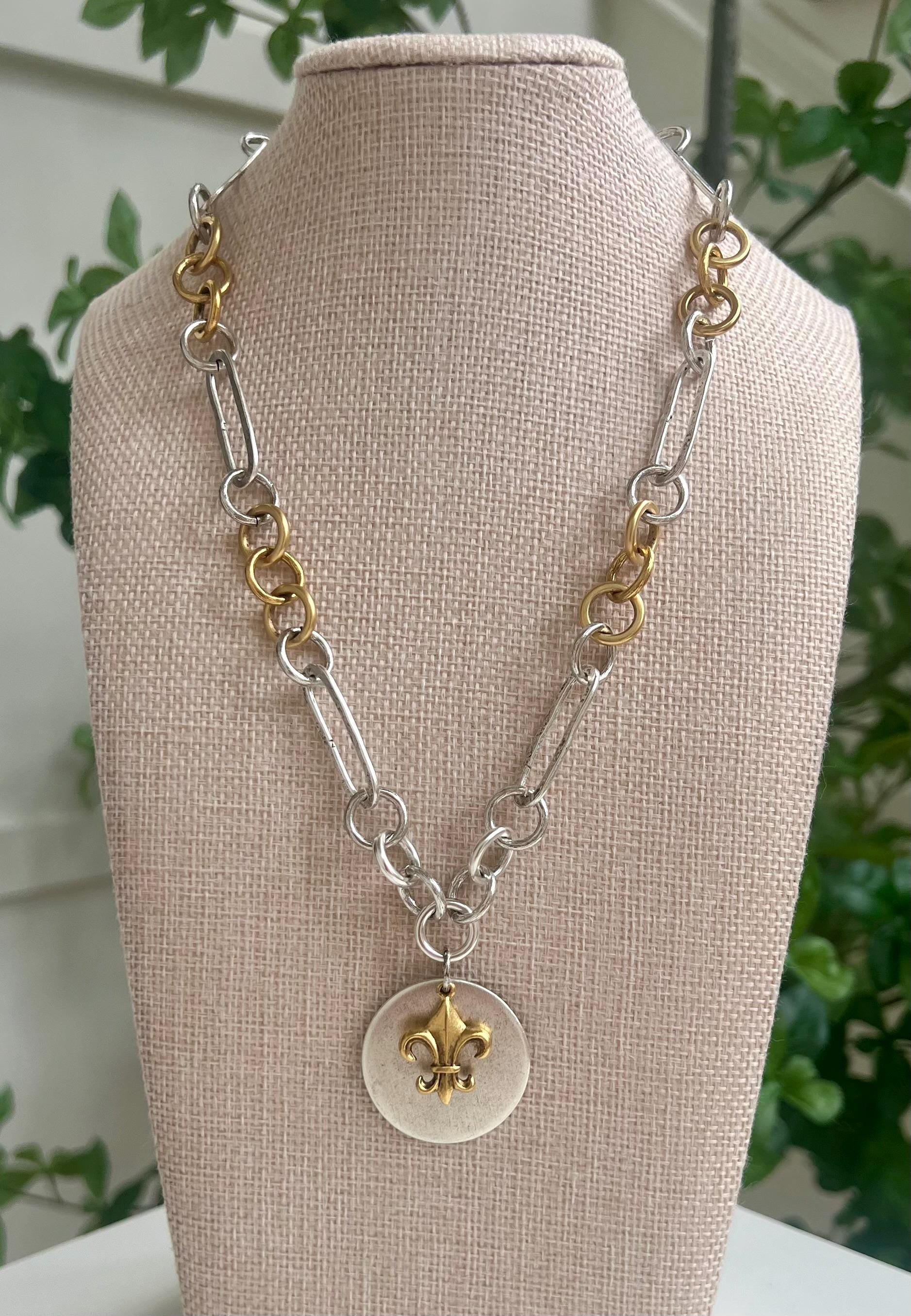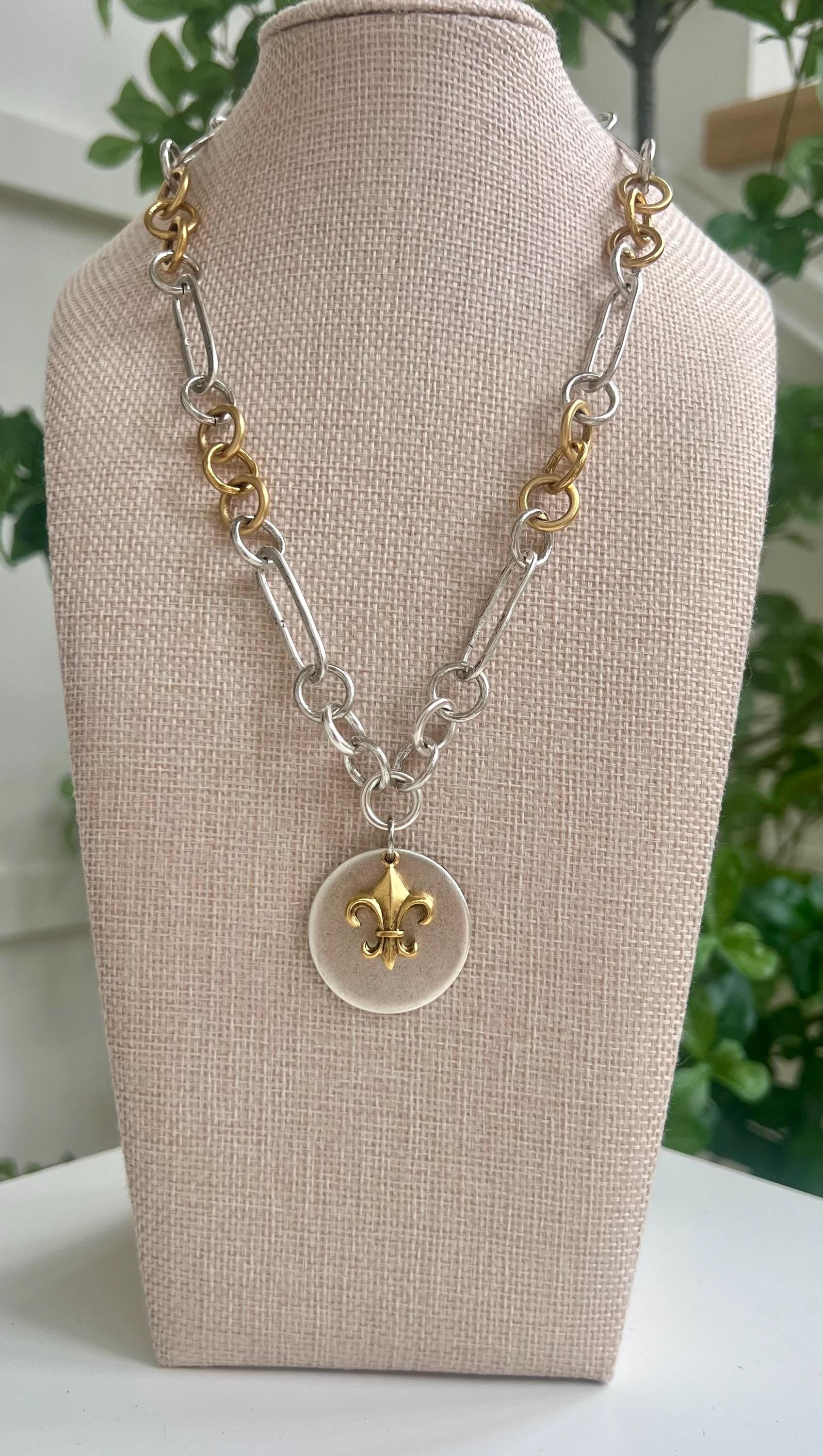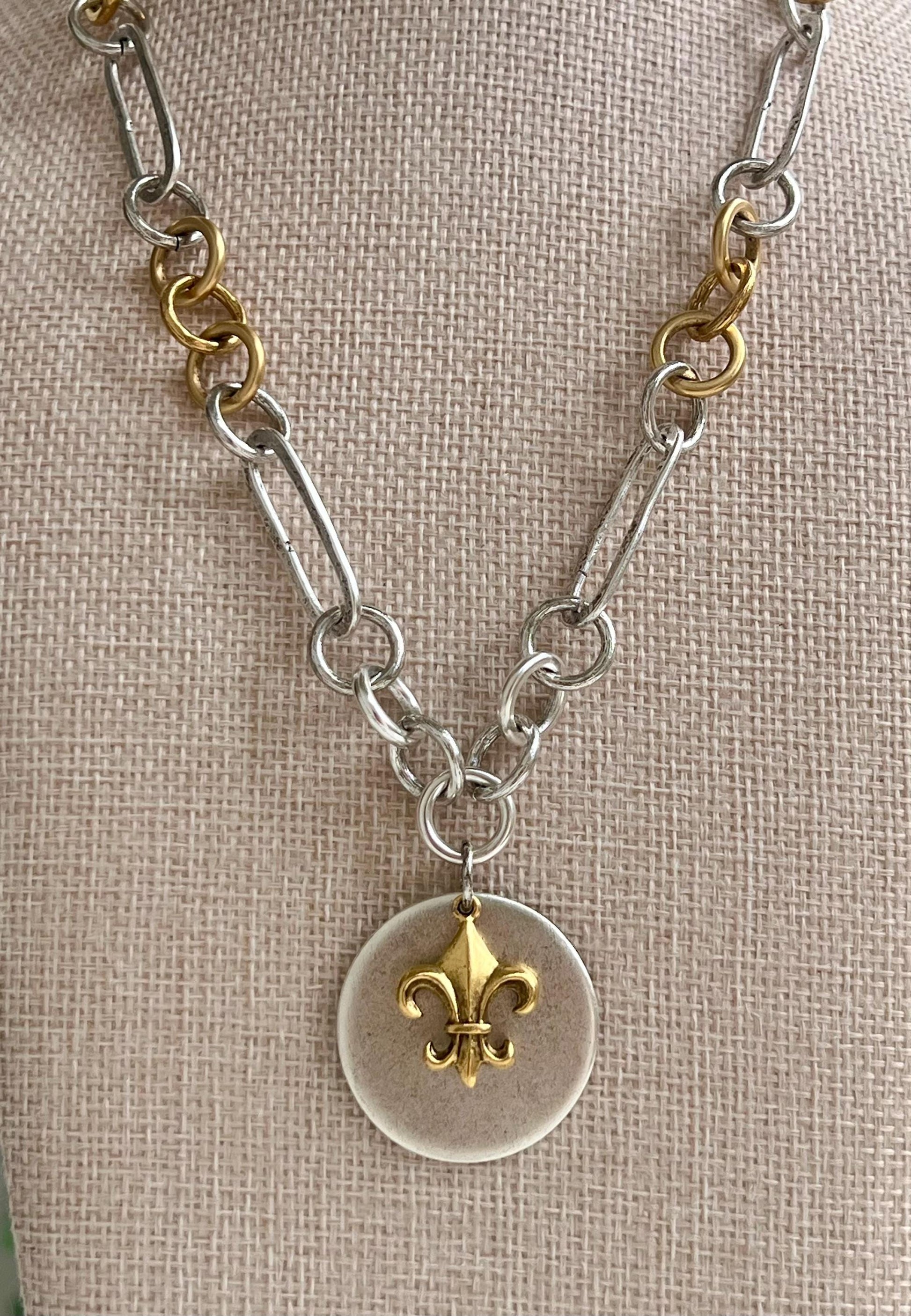 Large link necklace with non-tarnish gold plated pewter gorgeous Fleur de Lis Gold pendant over a silver plated pewter larger coin pendant. The pendant is 1.25 inches in diameter. This necklace is the perfect statement layering necklace. Necklace is made completely out of non-tarnish antiqued gold and silver plated pewter. Pendants are non-tarnish gold and silver plated pewter. Arrives thoughtfully packaged in an eco-friendly kraft box wrapped in ribbon, ready for gifting or keeping for yourself.