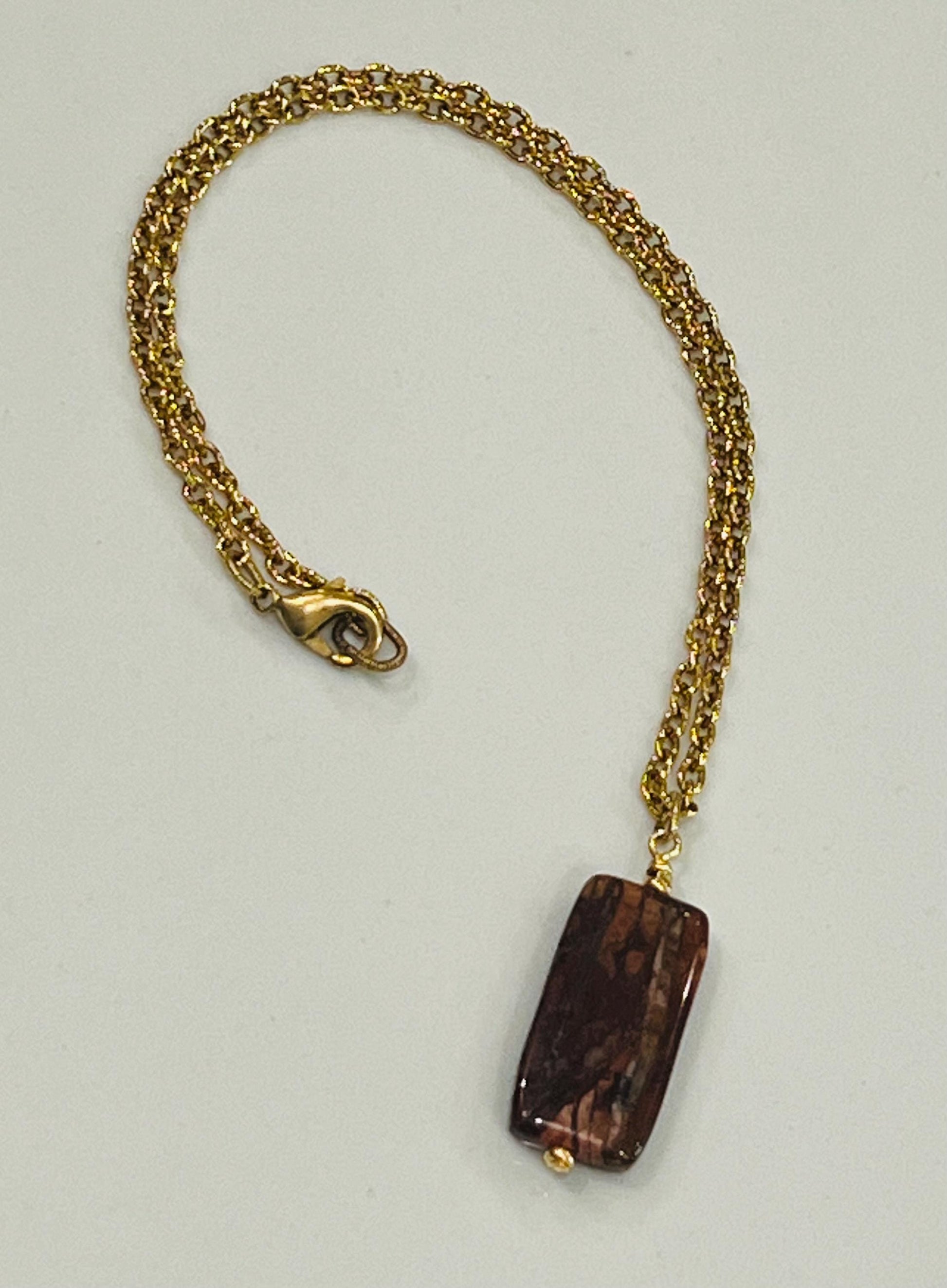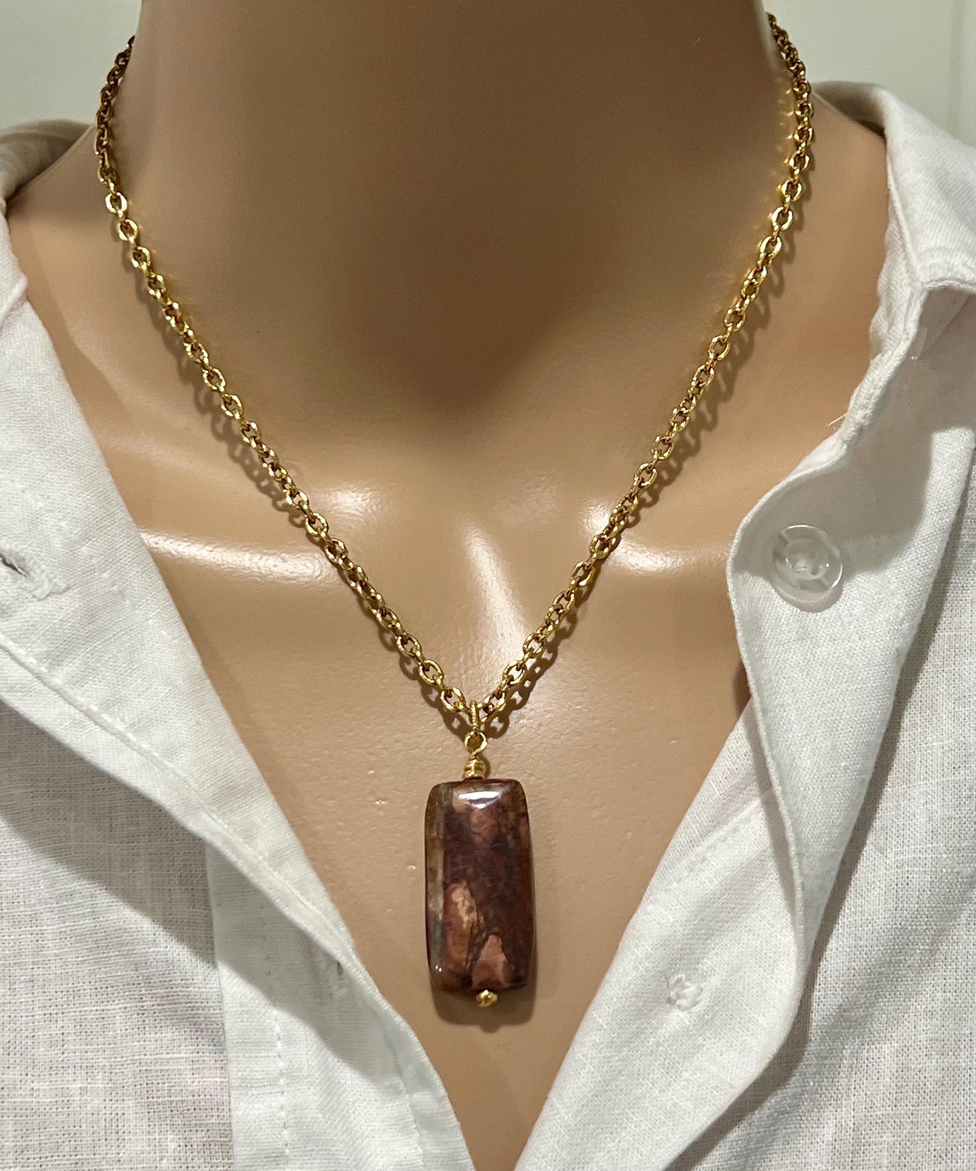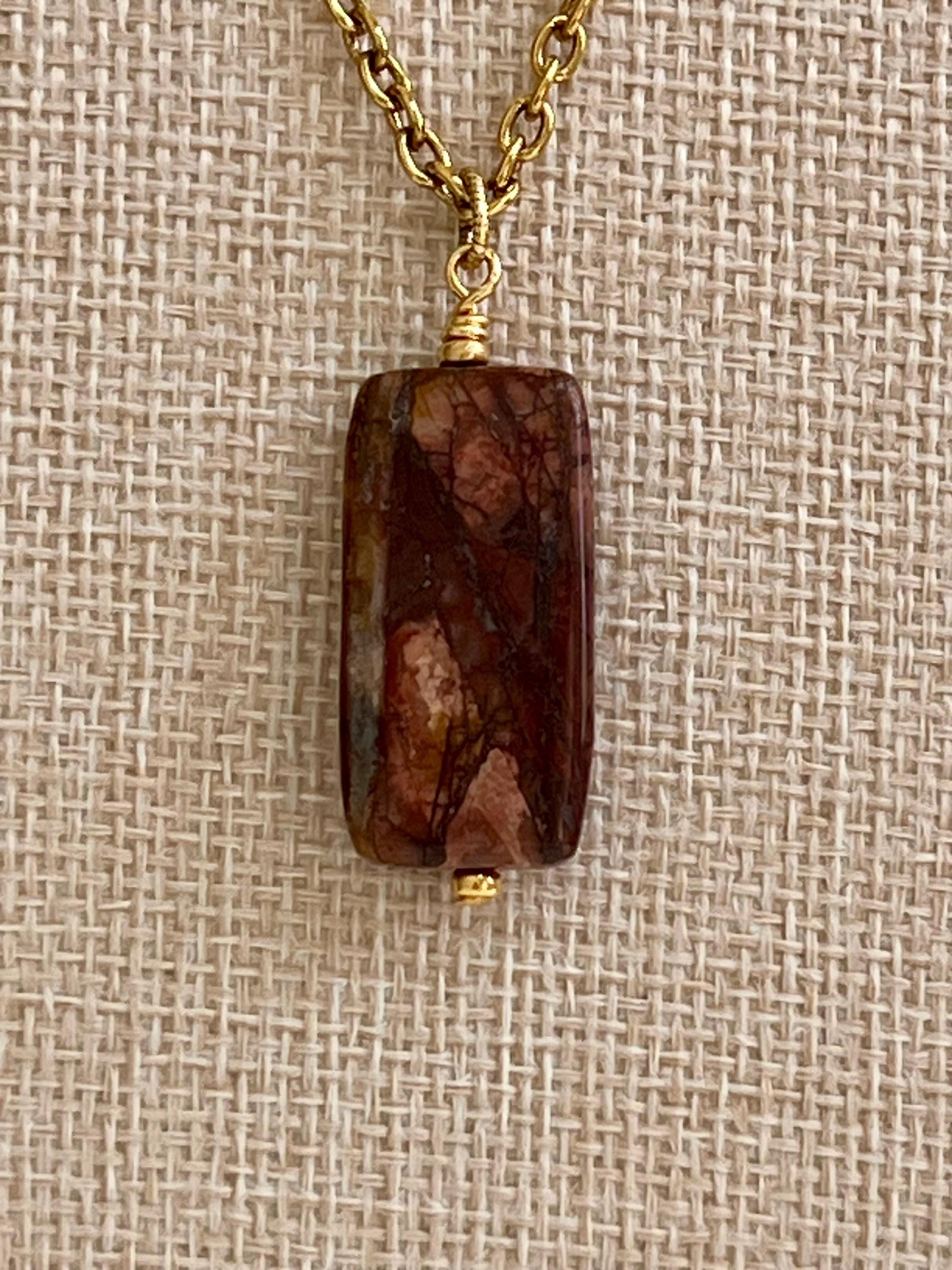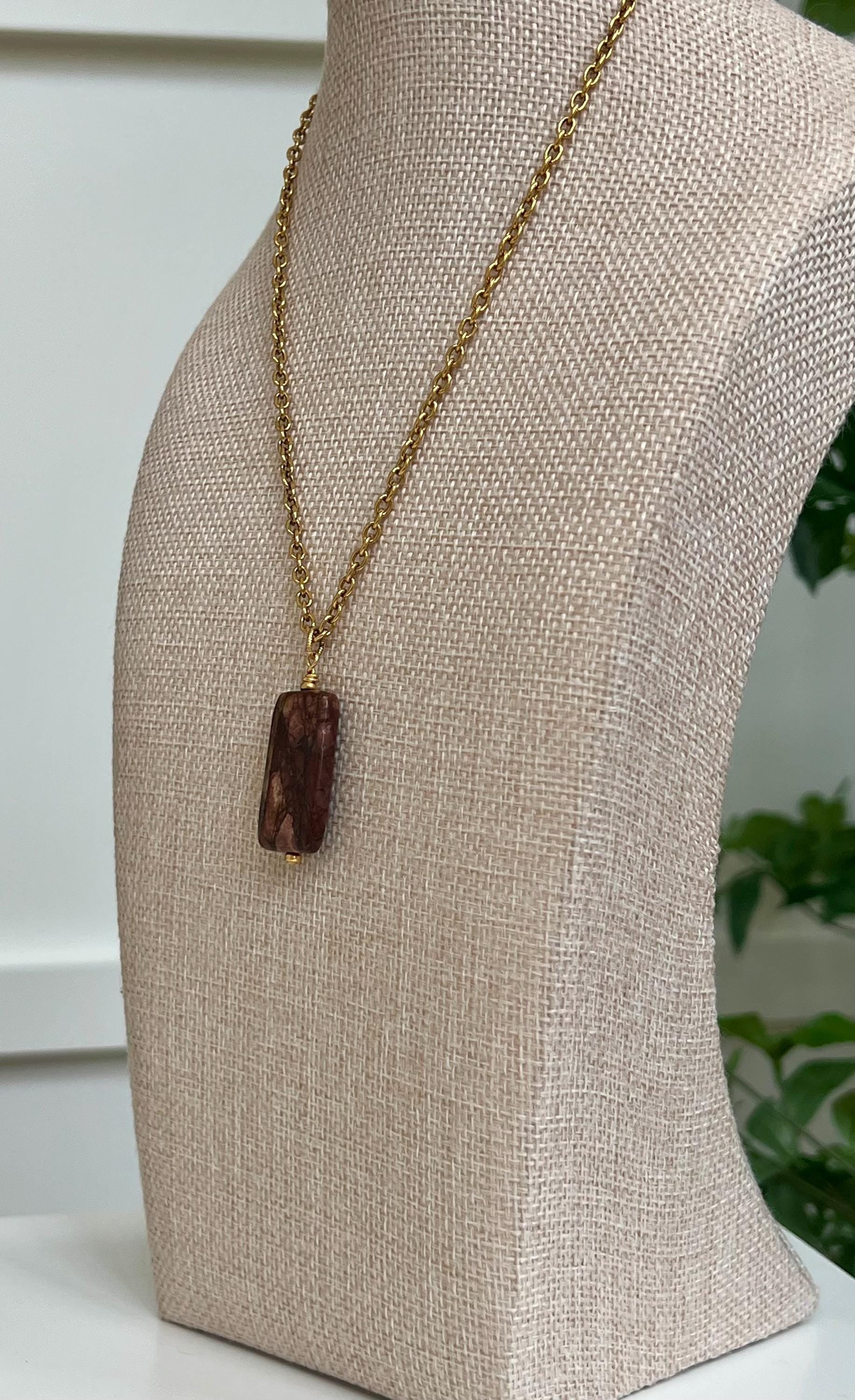 Gold textured small cable chain with non-tarnish gold plated pewter hoop drop with oval Red Creek Jasper pendant (1.25 inches in length by 0.5 inches in width). This necklace is the perfect statement layering necklace. The length can be adjusted anywhere from 16 to 18 inches. Chain is made out of gold plated brass. Arrives thoughtfully packaged in an eco-friendly kraft box wrapped in ribbon, ready for gifting or keeping for yourself.