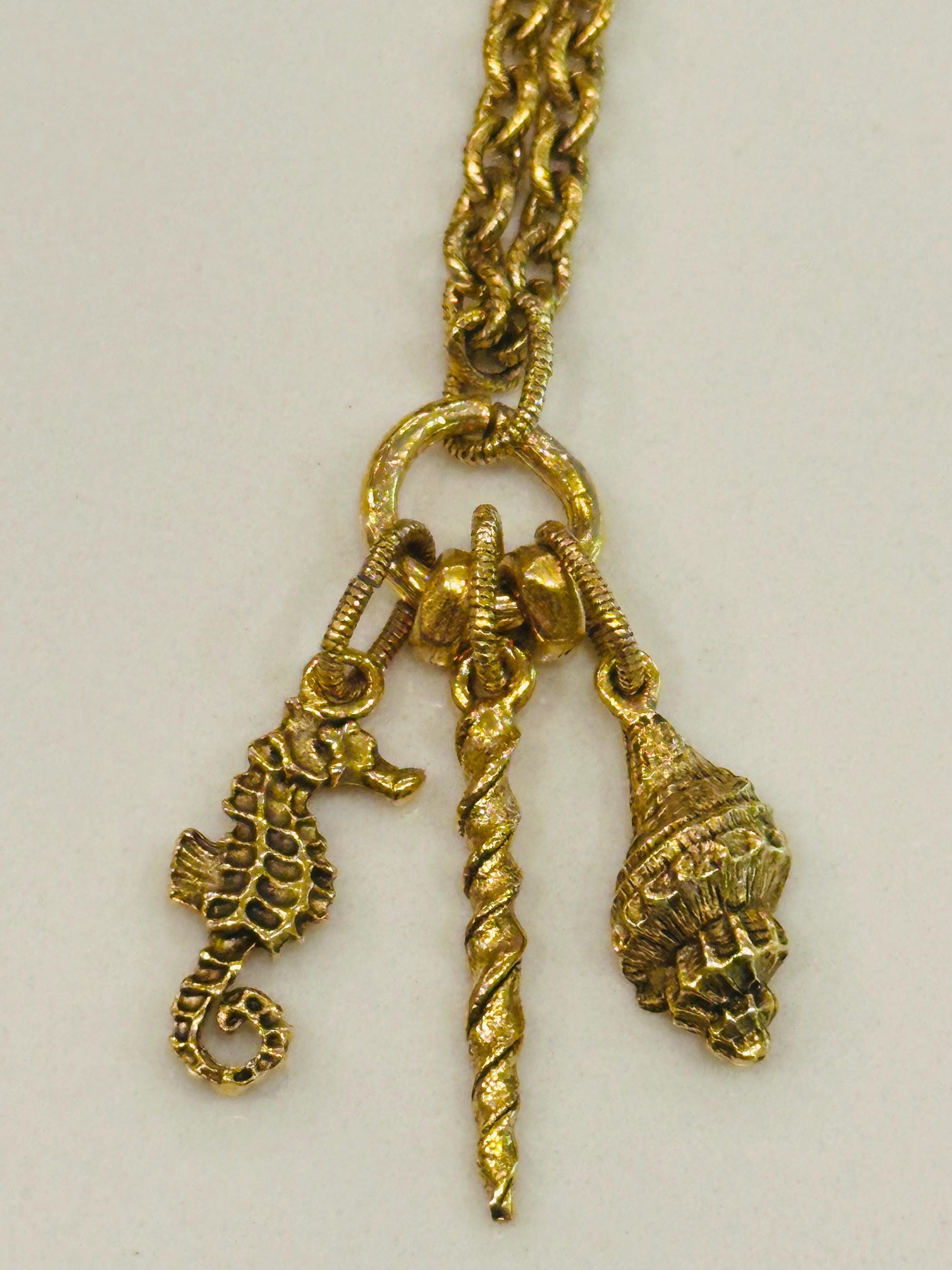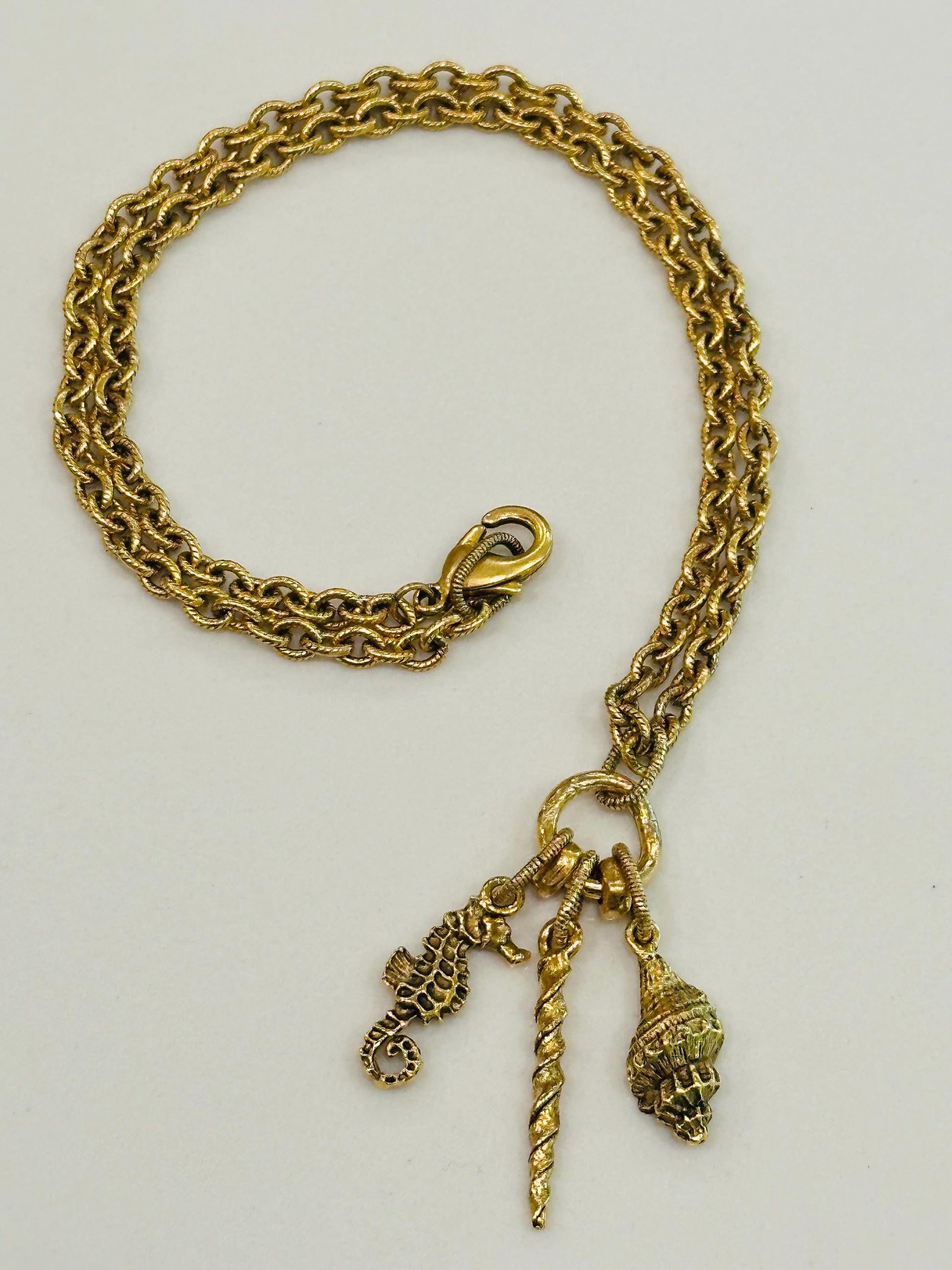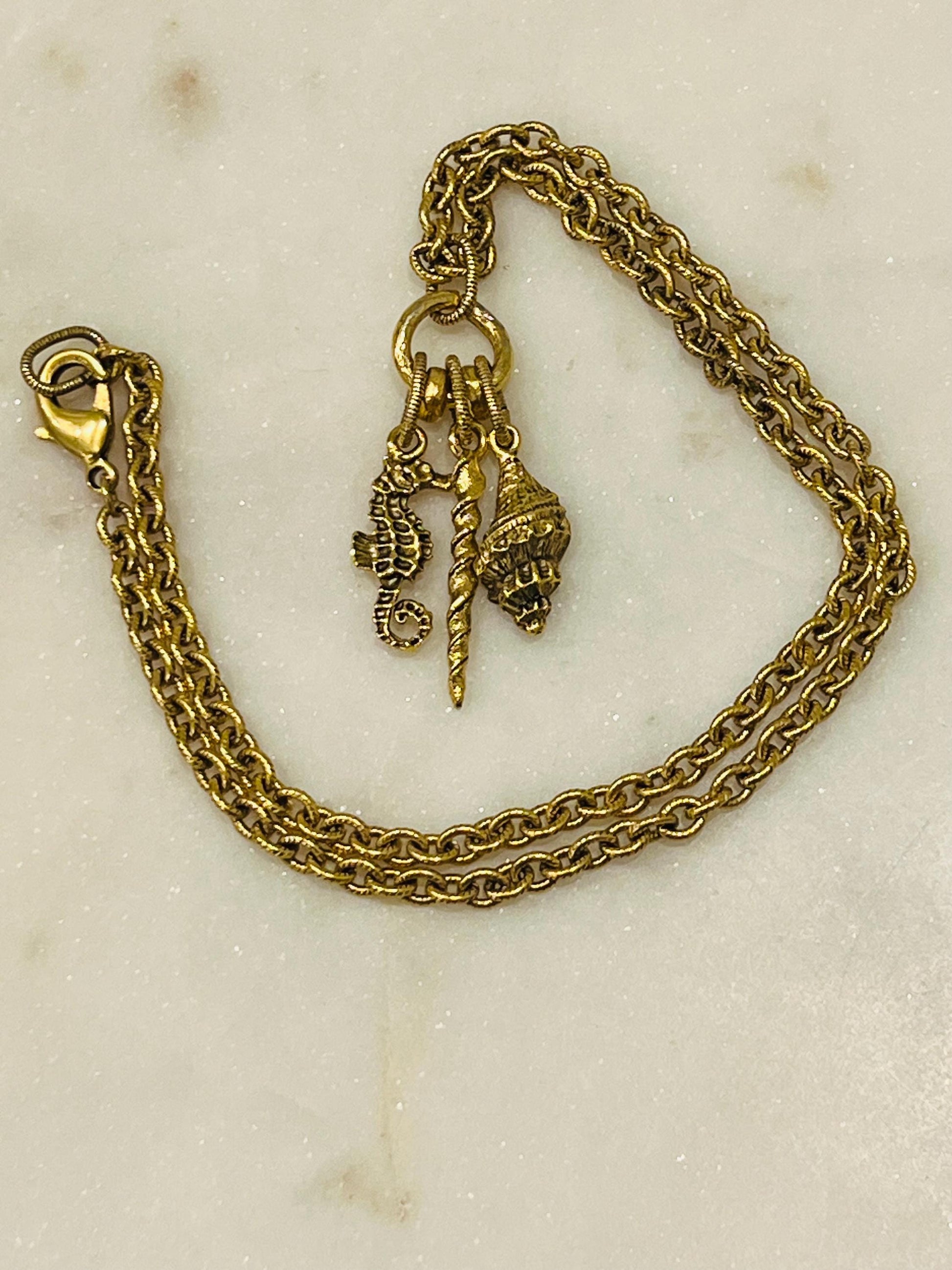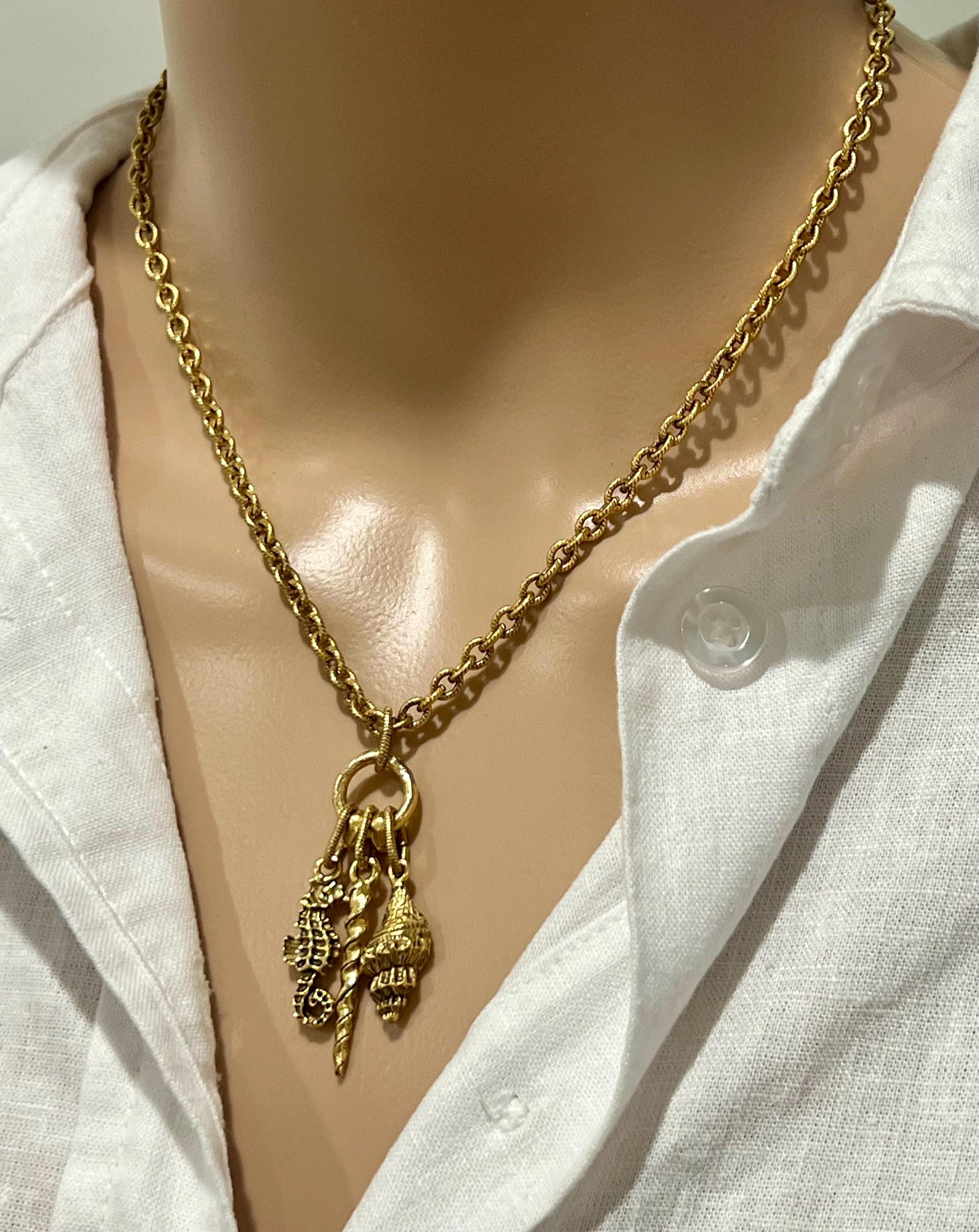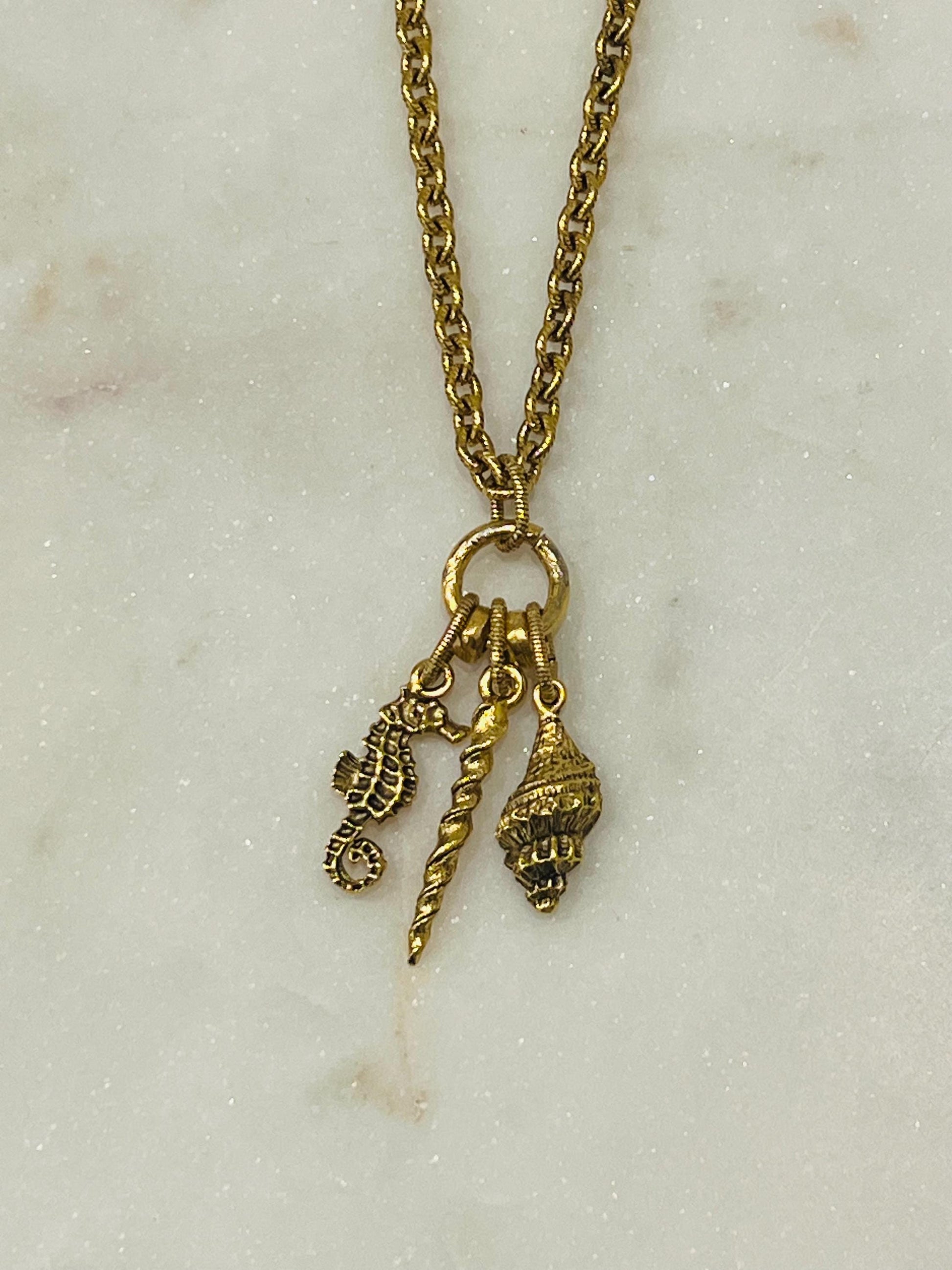 Gold Classic Textured Cable Chain Nautical Necklace Seahorse/Conche Shell/Narwal Charm Necklace Non-tarnish Gold Plated Pewter