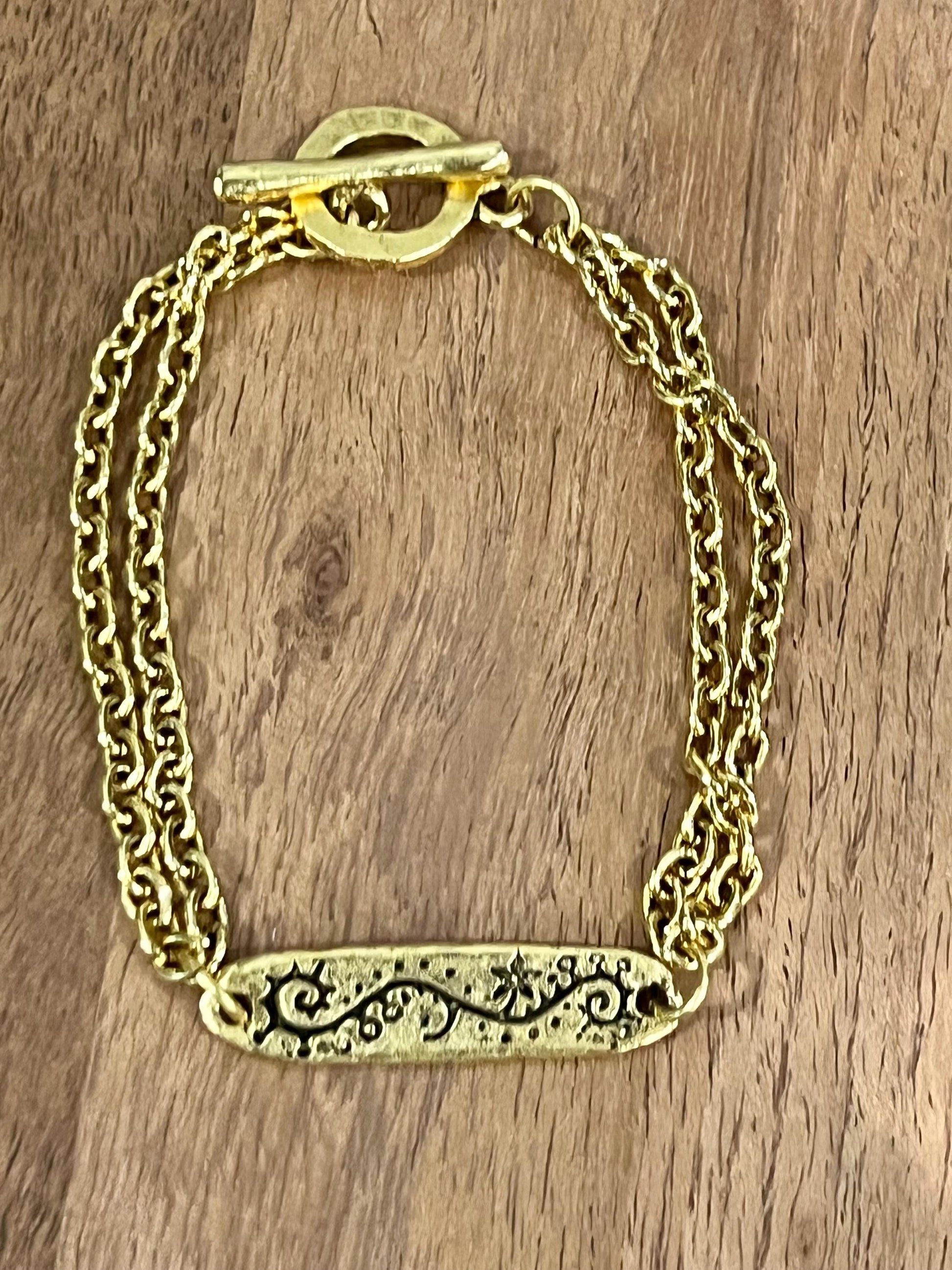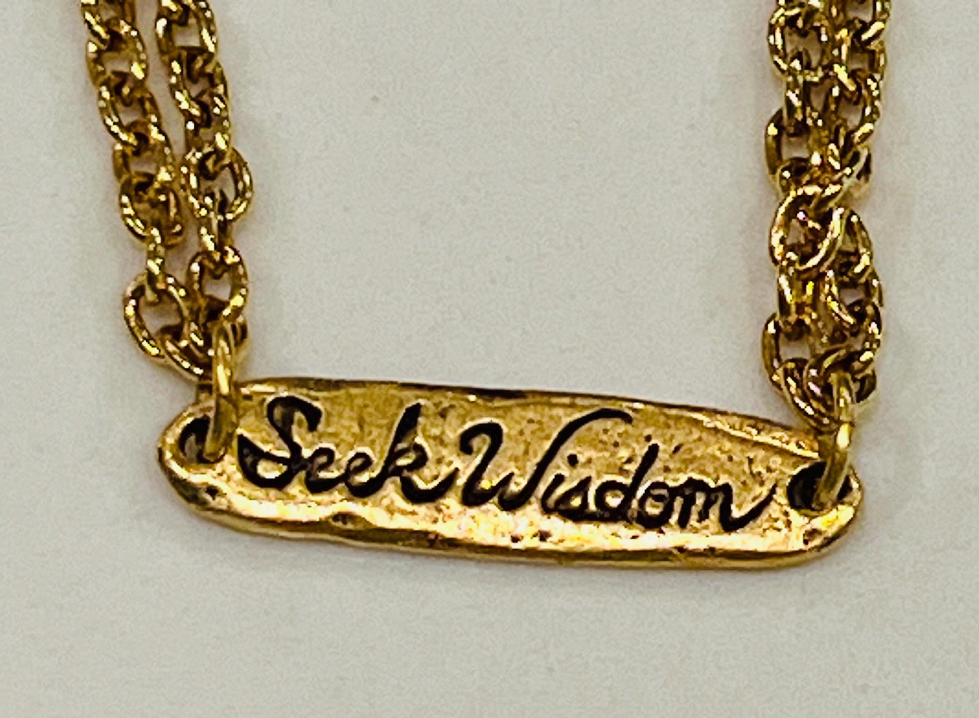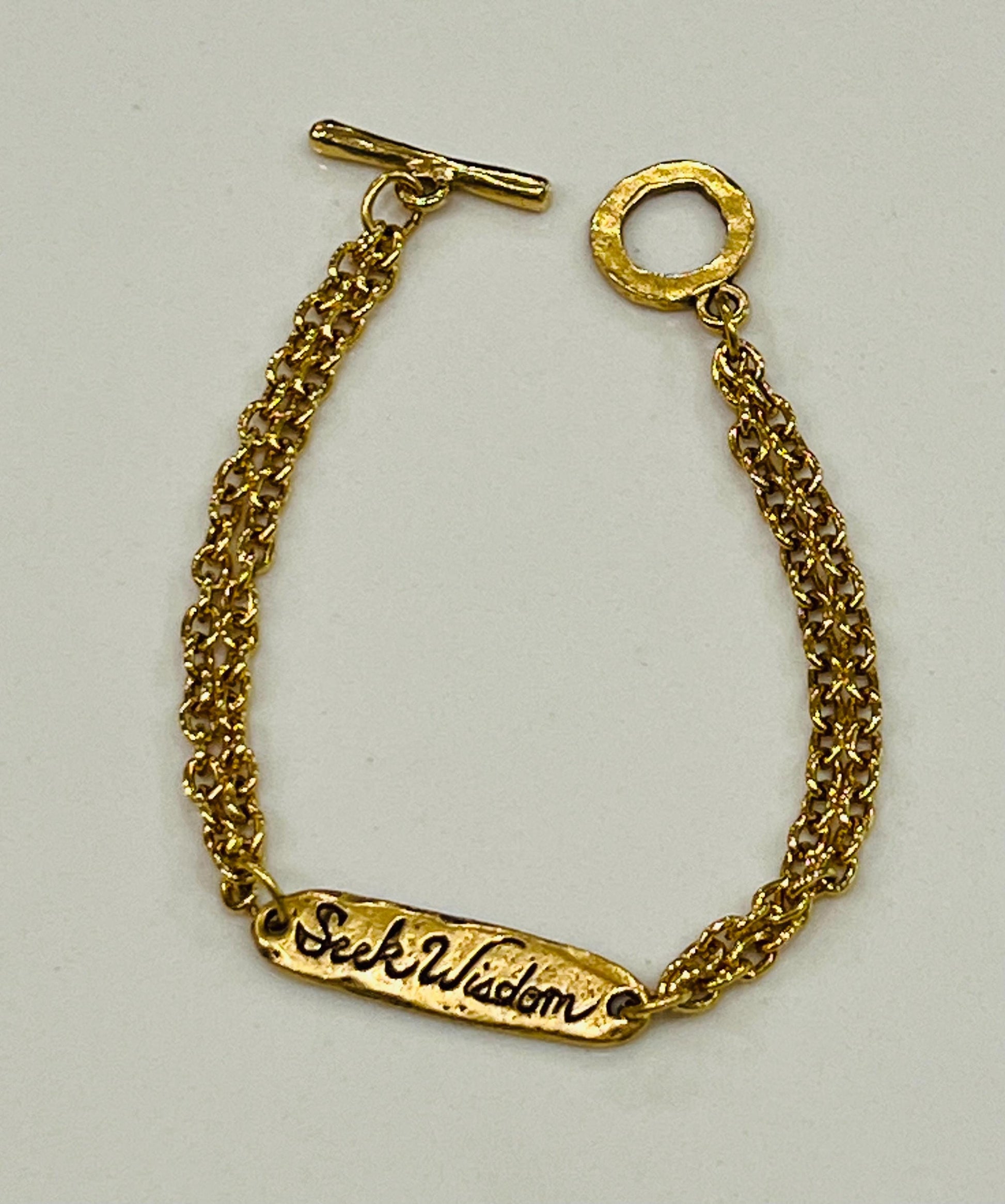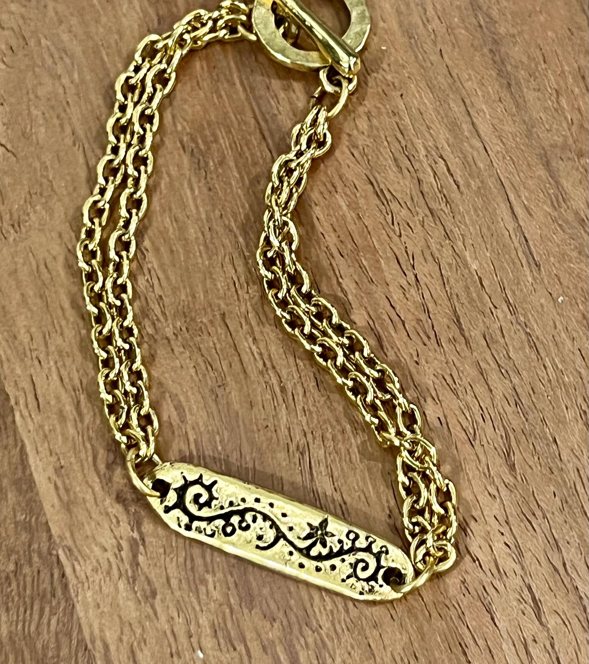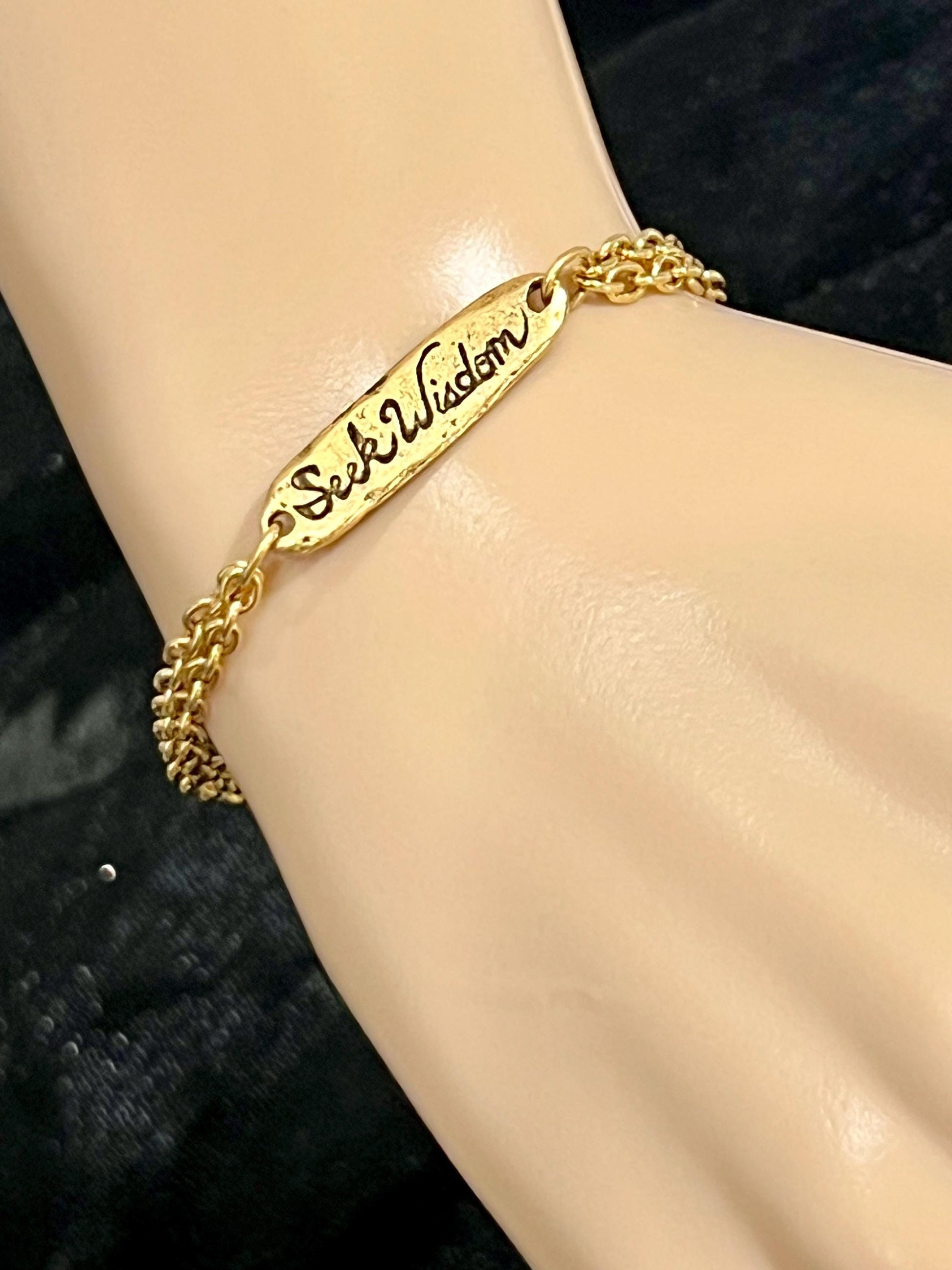 Delicate small paperclip modern chain double strand with non-tarnish gold plated pewter gorgeous Floral Vine “Seek Wisdom” Pendant by Green Girl Studios. The pendant is 1 inch in length by 0.25 inches in width. This is such a beautiful delicate bracelet. Chain is made out of gold plated brass. Arrives thoughtfully packaged in an eco-friendly kraft box wrapped in ribbon, ready for gifting or keeping for yourself.
