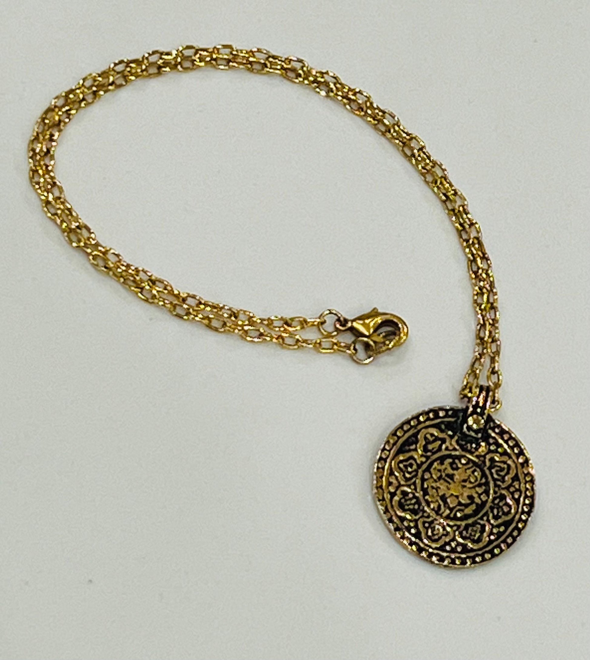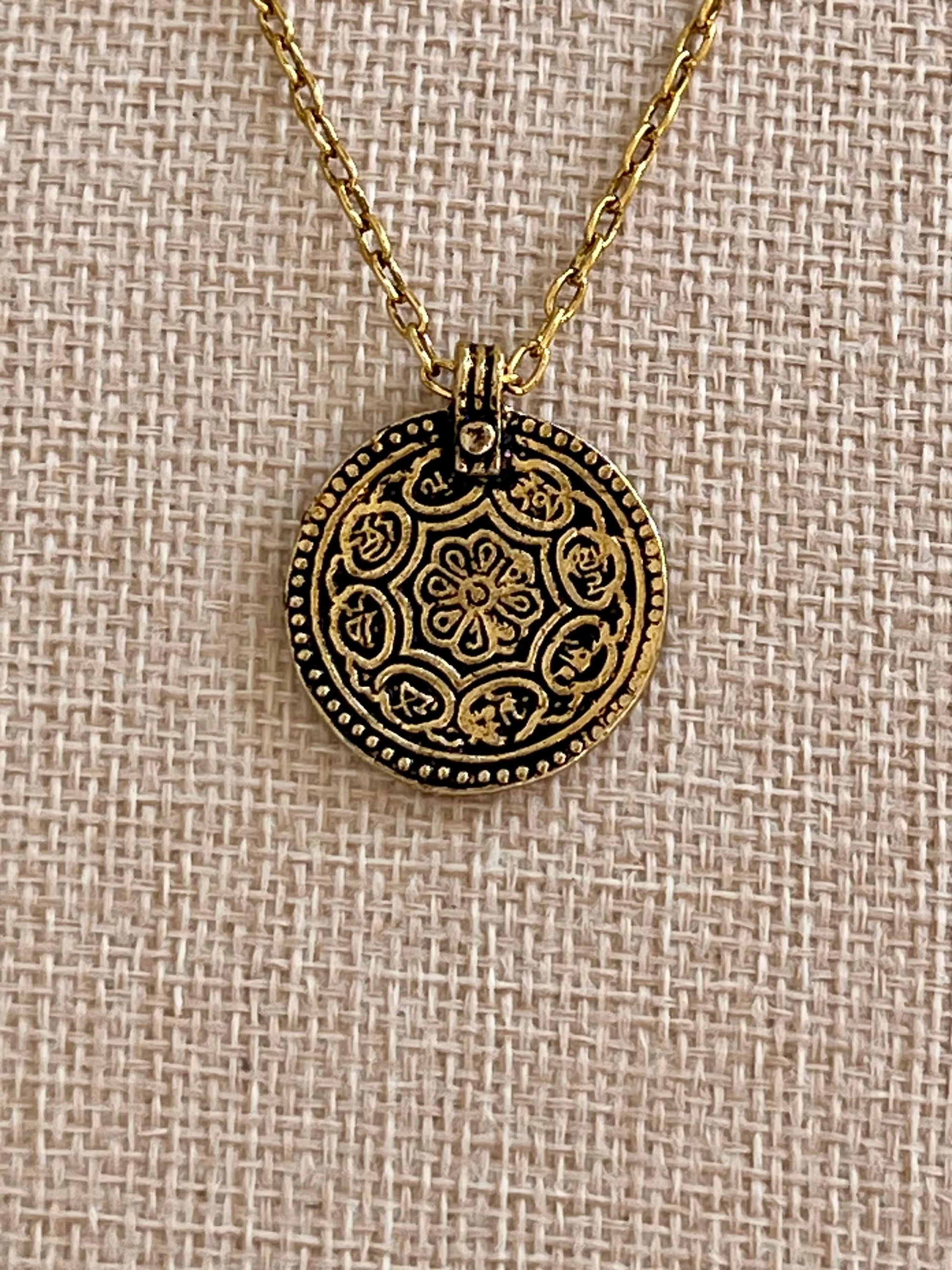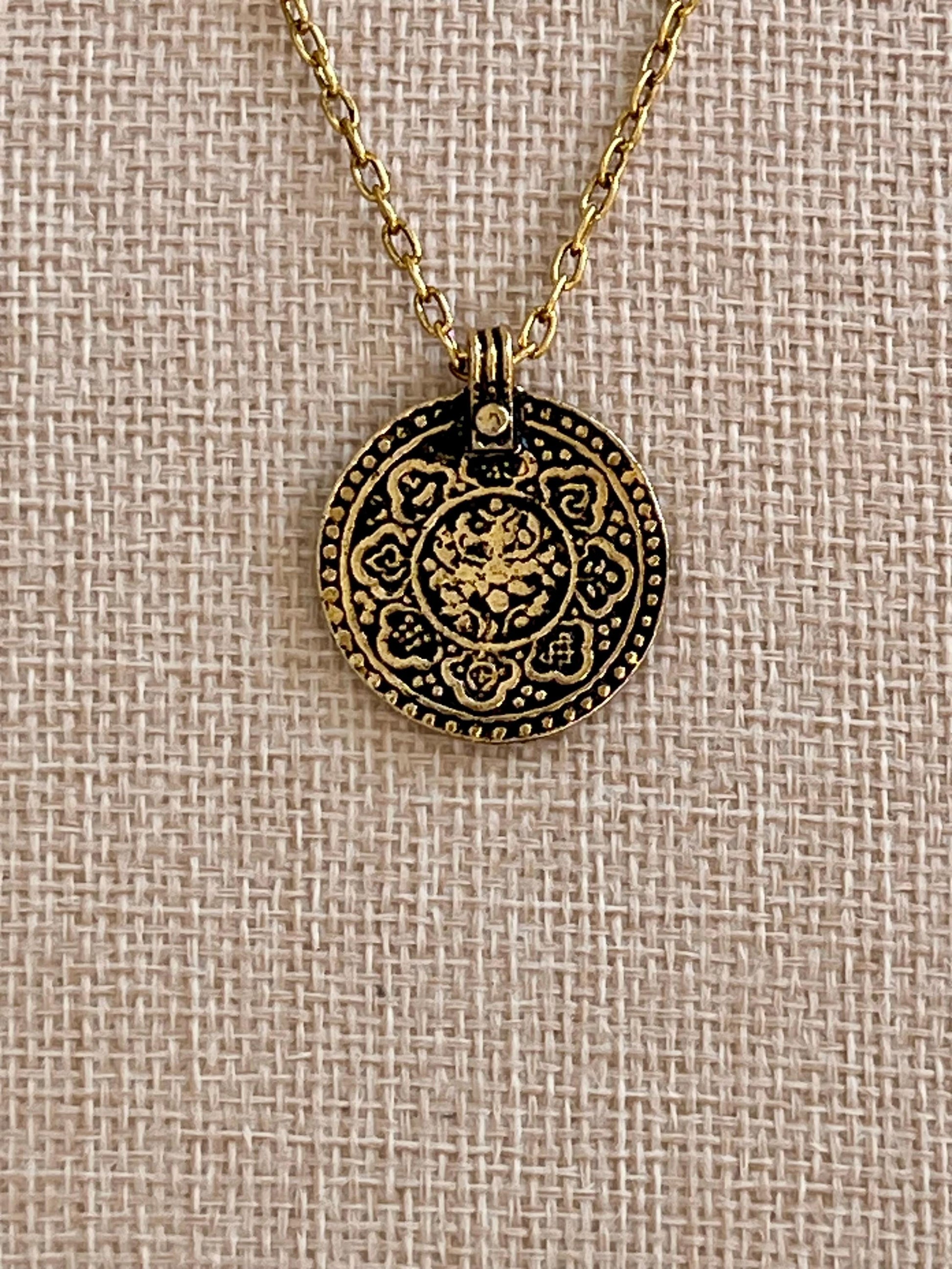 Delicate small paperclip modern chain with beautiful non-tarnish gold plated pewter double sided mandala pendant. The pendant is 1.25 inches in length. This necklace is the perfect statement layering necklace. The length can be adjusted from 16 inches to 18 inches and can be made shorter upon request. Chain is made out of gold plated brass. Arrives thoughtfully packaged in an eco-friendly kraft box wrapped in ribbon, ready for gifting or keeping for yourself.