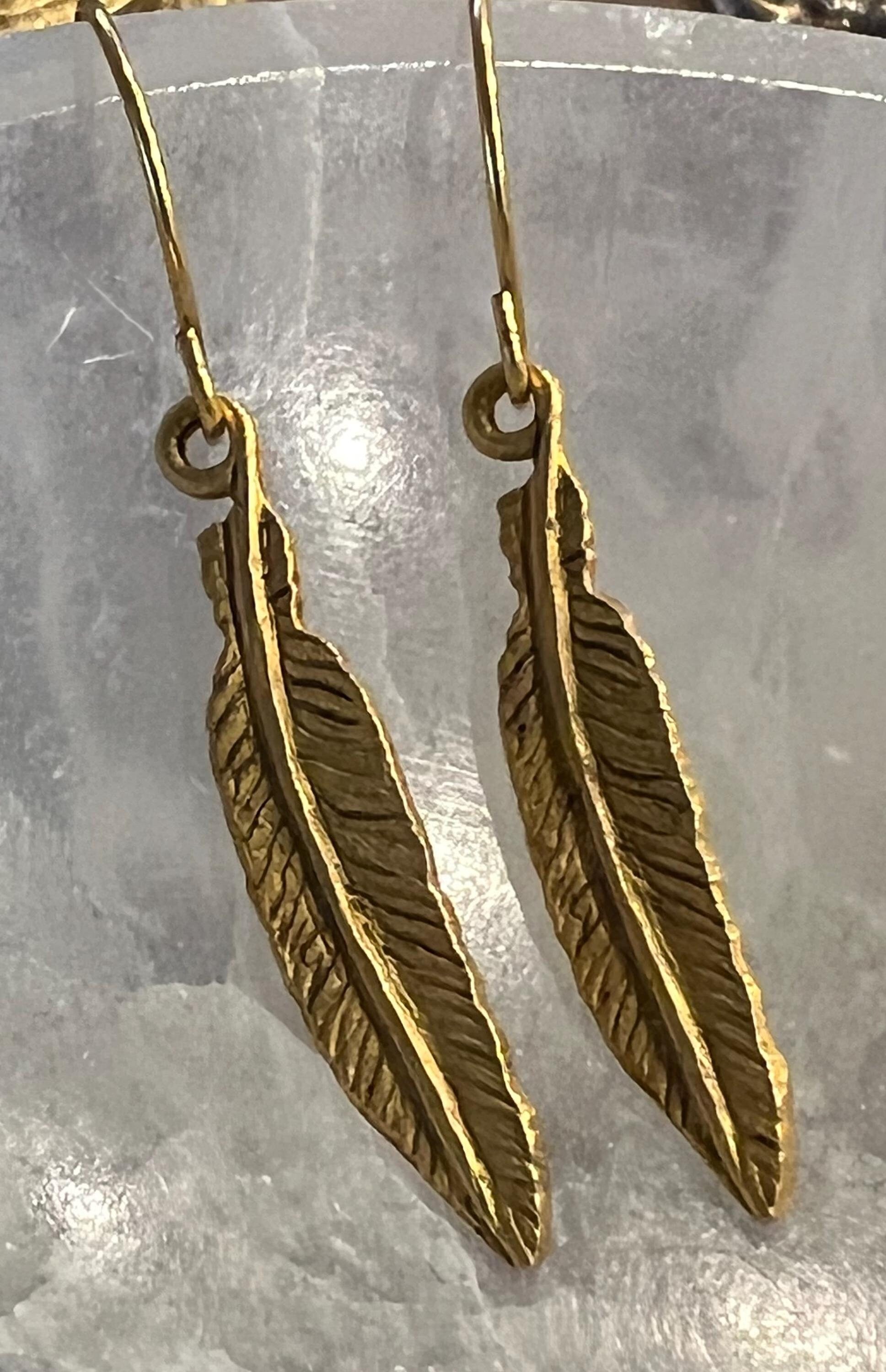 Gold plated pewter non-tarnish Feather drops and gold plated brass ear wires. Earrings are 1.5 inches in length.Arrives thoughtfully packaged in an eco-friendly kraft box wrapped in ribbon, ready for gifting or keeping for yourself.