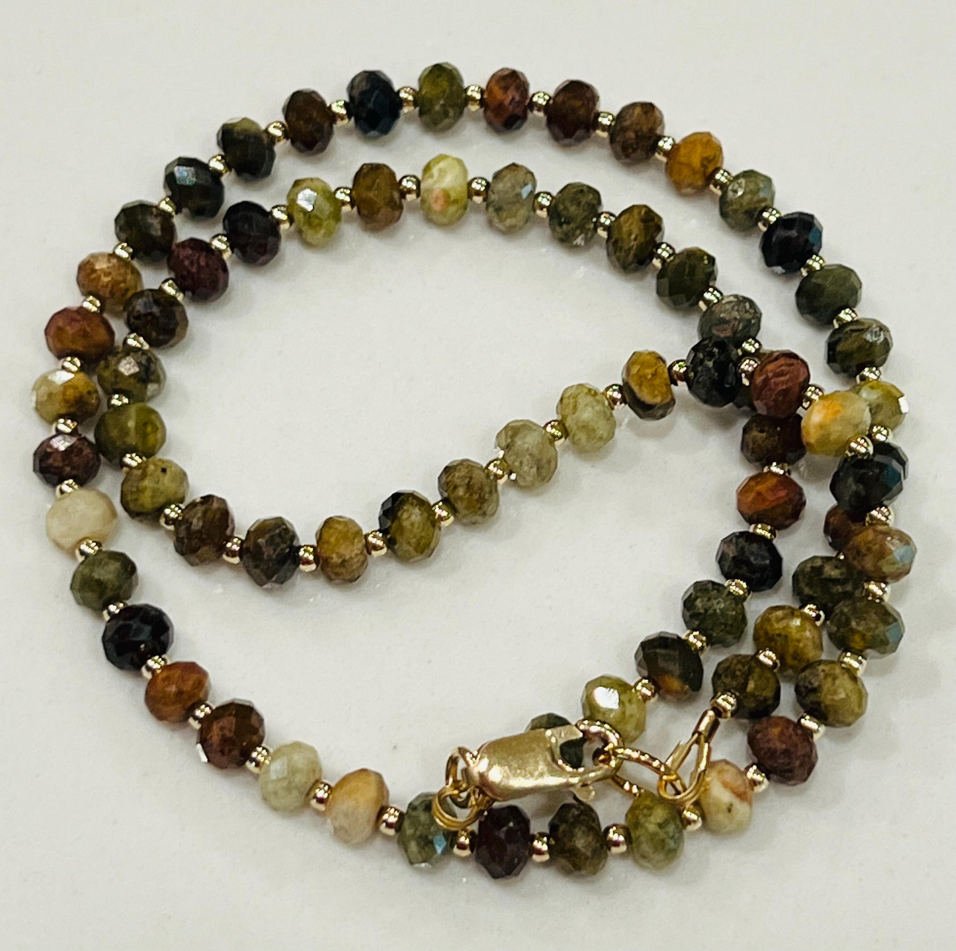 Natural Green Garnet Necklace. 5mm faceted Rondelle natural gemstones with 18k gold filled clasp and 18k gold filled accent beads between each stone. Perfect layering necklace. Green Garnet helps one open themselves up to the world around them and better connect them to the ones they love. Happiness and joy may soon follow, with one turning their attention to their truest desires. Arrives thoughtfully packaged in an eco-friendly kraft box wrapped in ribbon, ready for gifting or keeping for yourself.