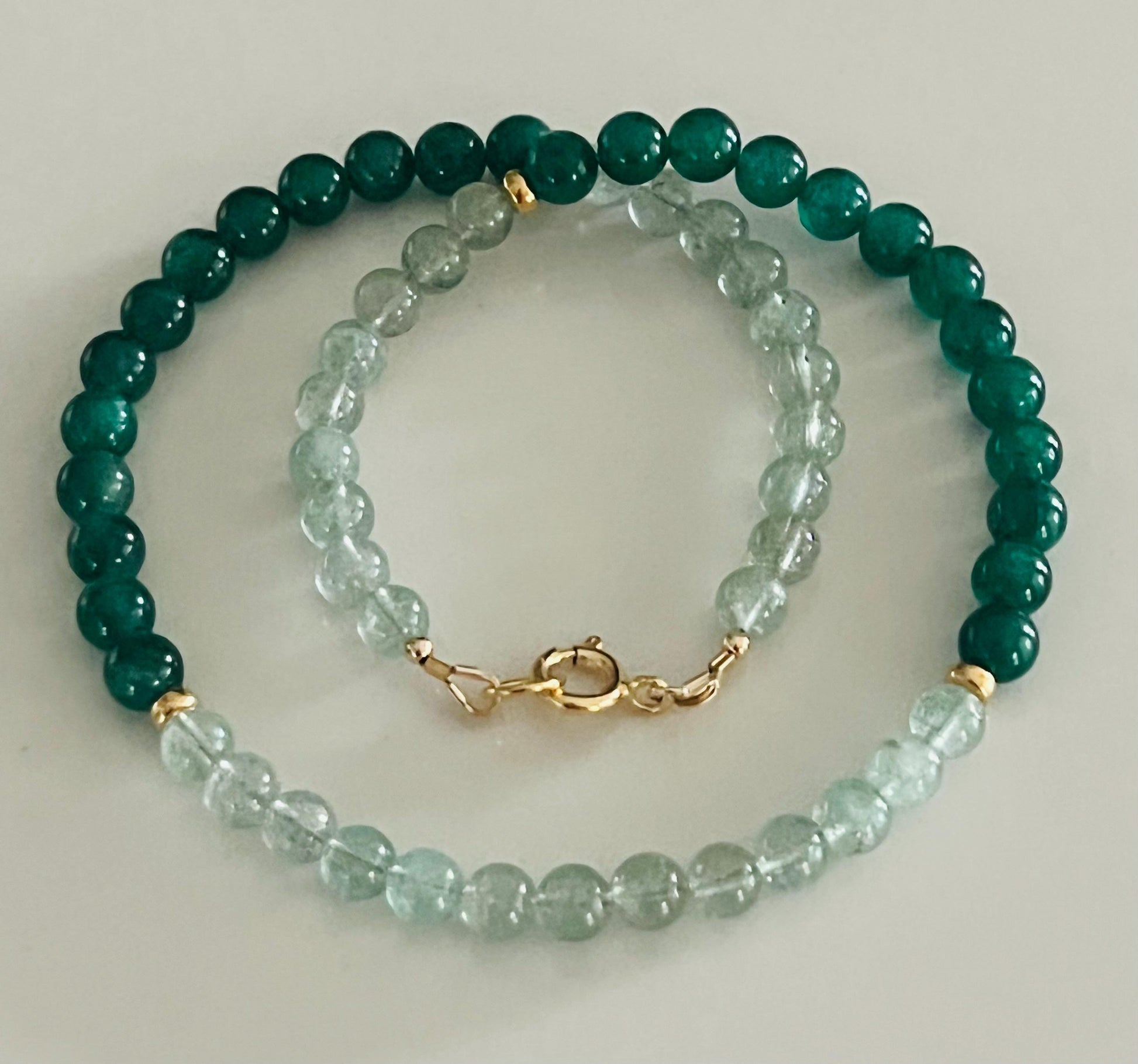 Natural Gemstone Necklace. 6mm green strawberry Quartz and 6mm green mica stones with an 18k gold filled clasp and 18k gold filled rondelle beads. Arrives thoughtfully packaged in an eco-friendly kraft box wrapped in ribbon, ready for gifting or keeping for yourself.