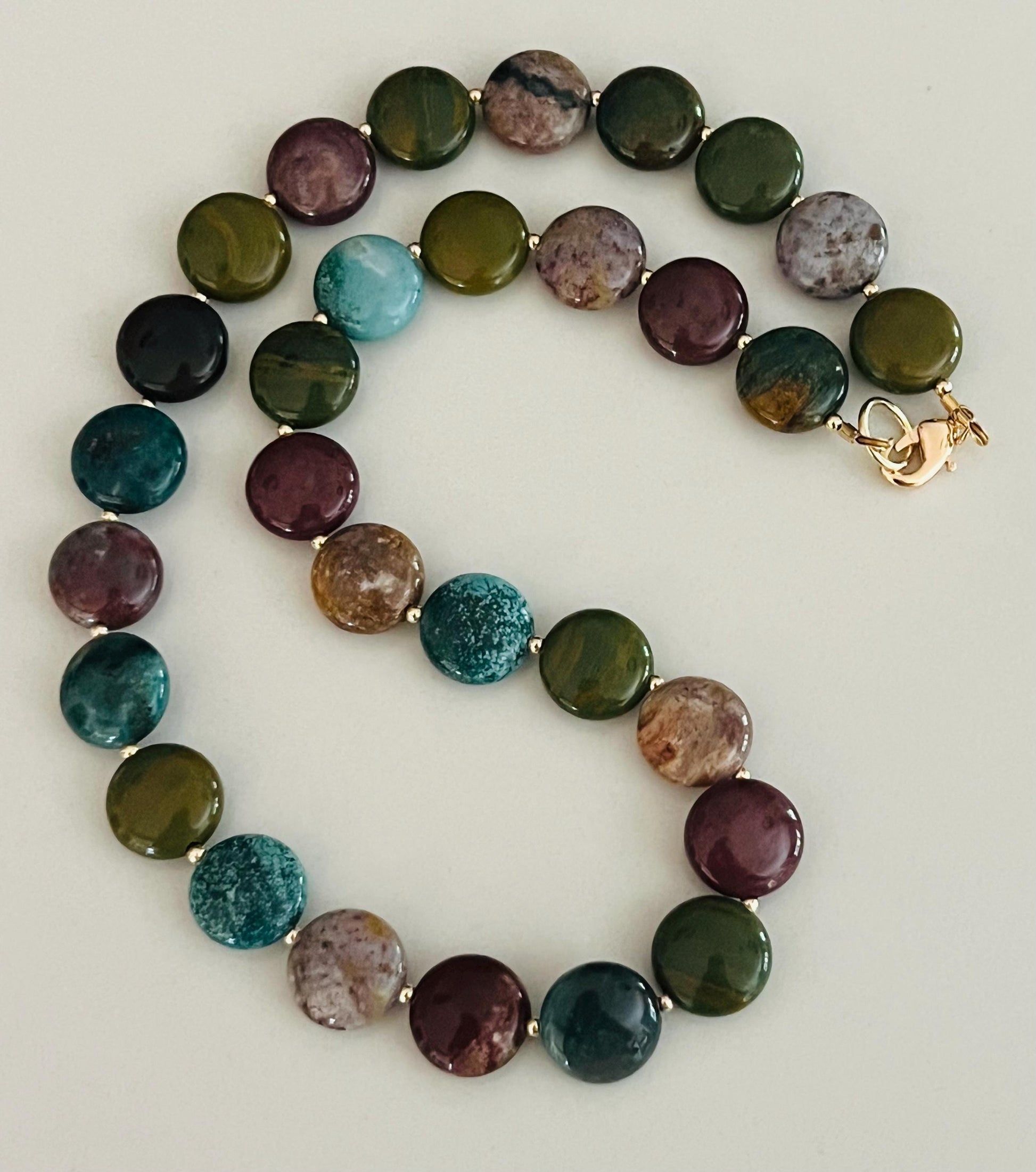 Natural Gemstone Necklace. 12mm smooth coin Kabamby Ocean jasper beaded necklace with a 2mm round gold filled bead between each Jasper stone. All 18k gold filled components in this lovely necklace. 18k gold filled spring clasp. Arrives thoughtfully packaged in an eco-friendly kraft box wrapped in ribbon, ready for gifting or keeping for yourself.