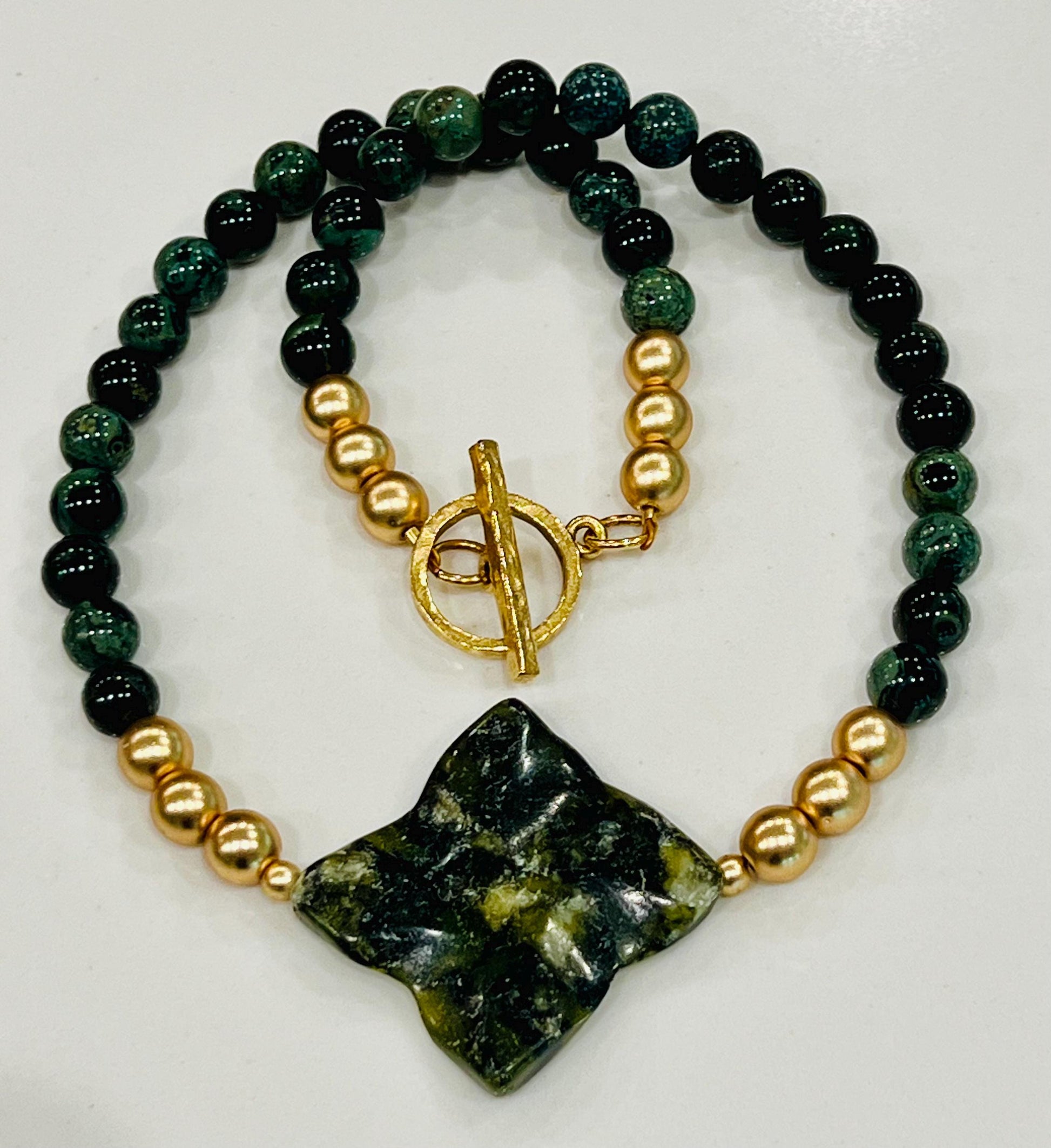 Natural Gemstone Necklace. Gorgeous statement necklace, Kambaba Jasper 8.5mm round smooth beads with large Kambaba pendant and matte hematite accent beads with non-tarnish gold plated pewter easy toggle clasp. 19 inches in length. Arrives thoughtfully packaged in an eco-friendly kraft box wrapped in ribbon, ready for gifting or keeping for yourself.