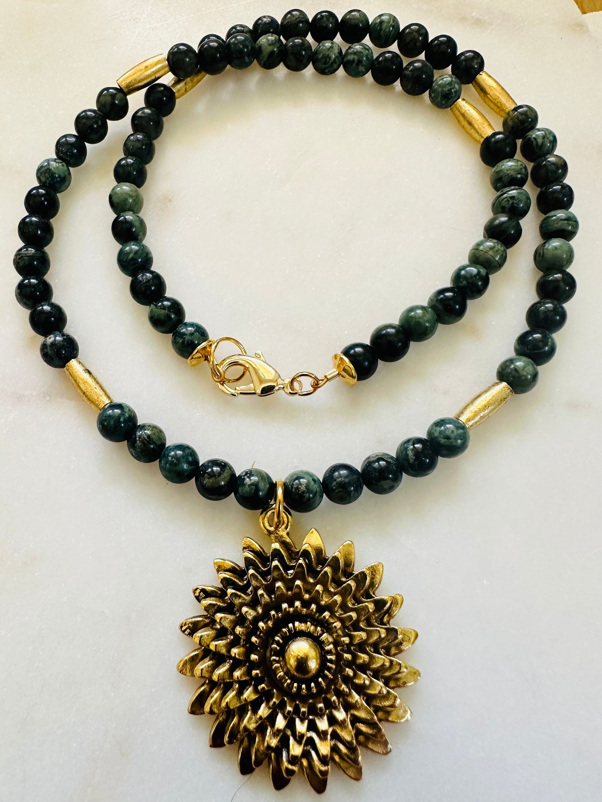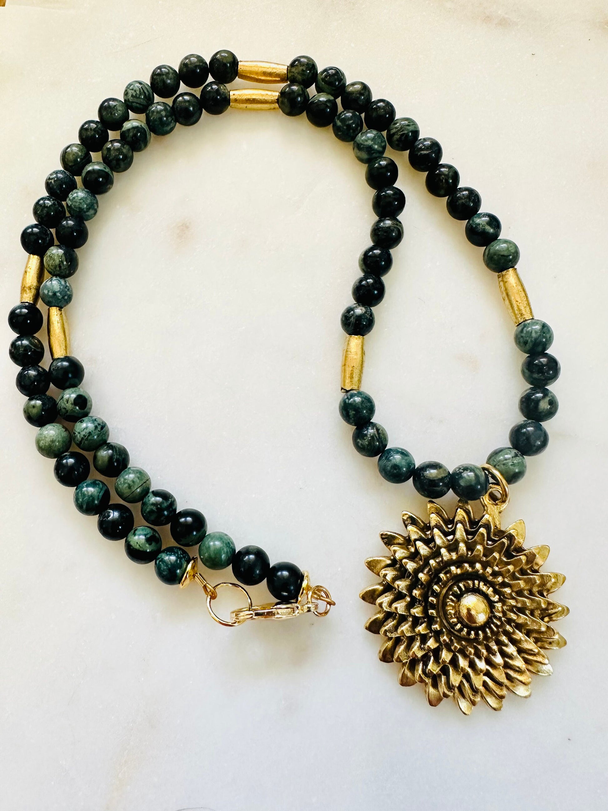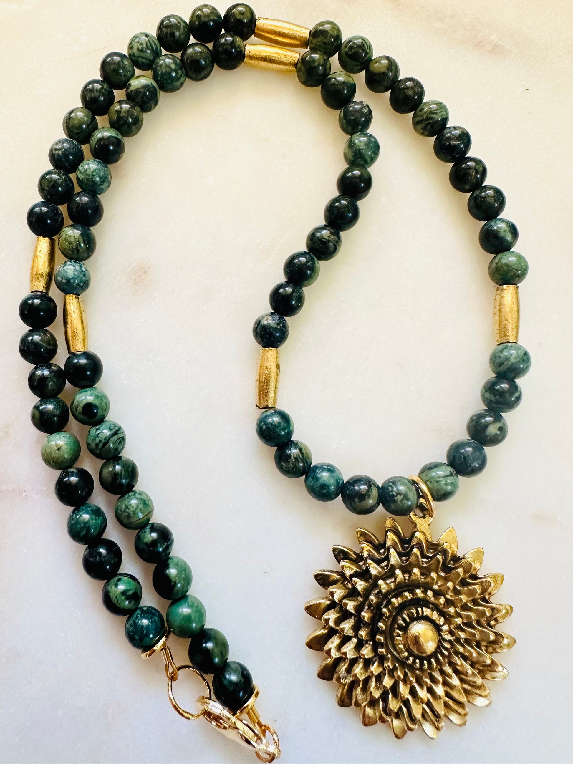 Natural Gemstone Necklace. 6mm Kambaba Jasper Stones with non-tarnish gold plated pewter daisy pendant. Antique gold plated pewter non-tarnish large accent beads. Arrives thoughtfully packaged in an eco-friendly kraft box wrapped in ribbon, ready for gifting or keeping for yourself.