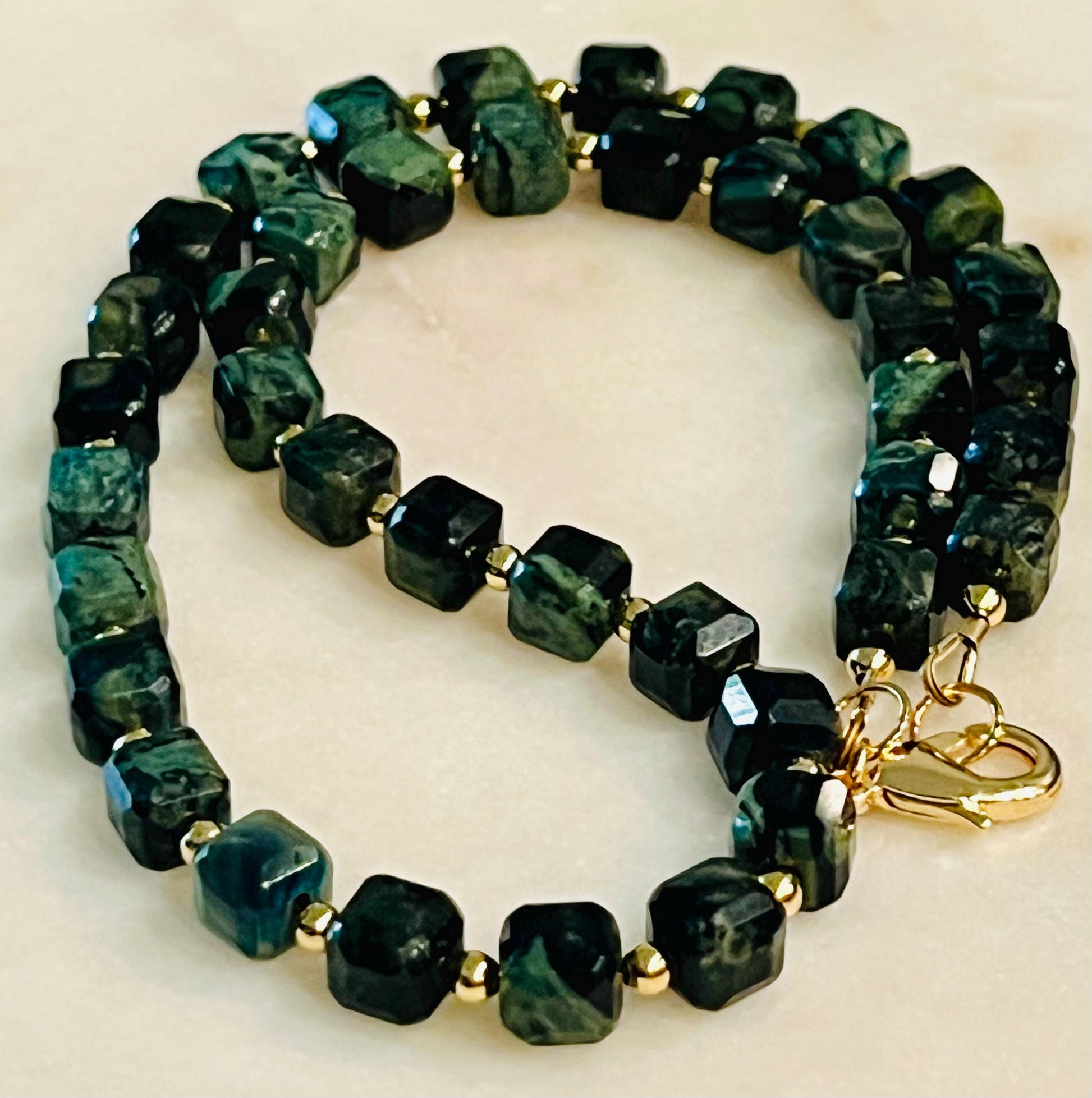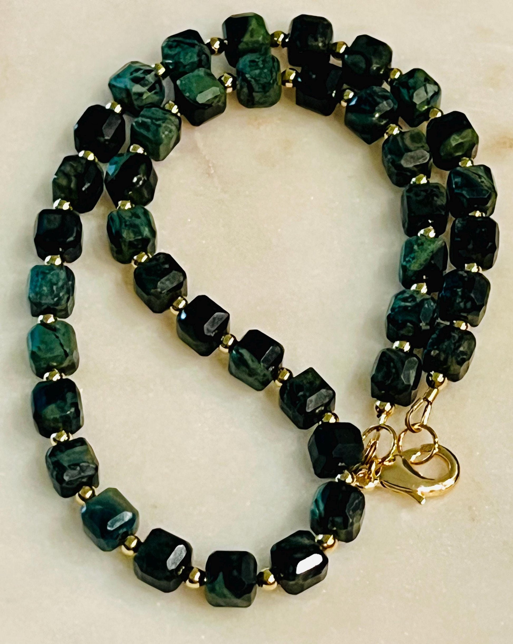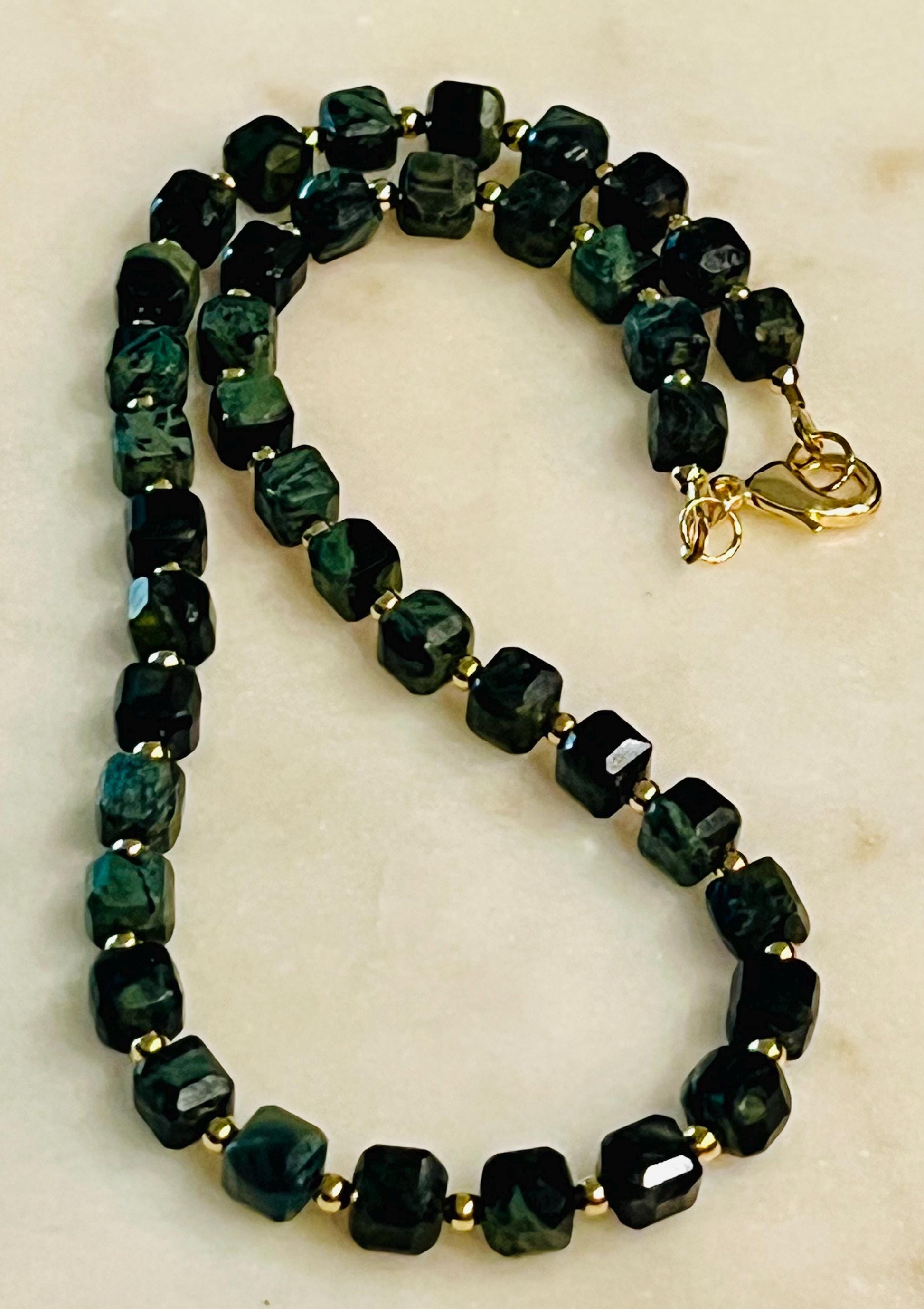Natural Gemstone Necklace. Kambaba Jasper 8mm faceted cubed beaded necklace with 18k gold filled large lobster clasp and 18k gold filled 3mm beads in between each Jasper stone. 16.5 inches in length. Stunning necklace. Arrives thoughtfully packaged in an eco-friendly kraft box wrapped in ribbon, ready for gifting or keeping for yourself.
