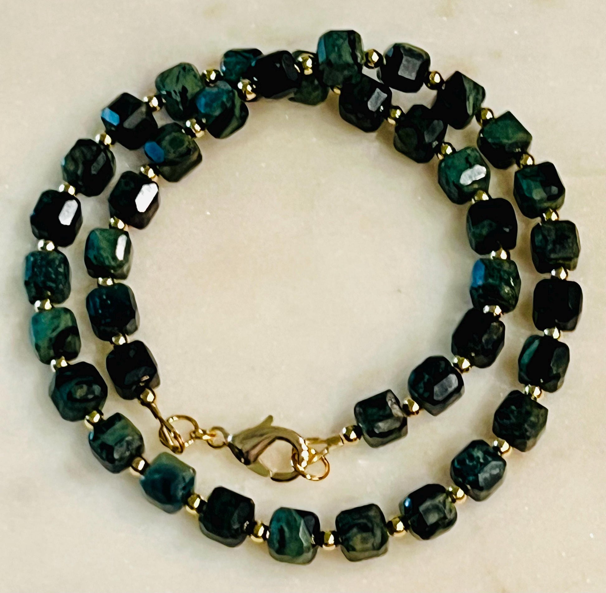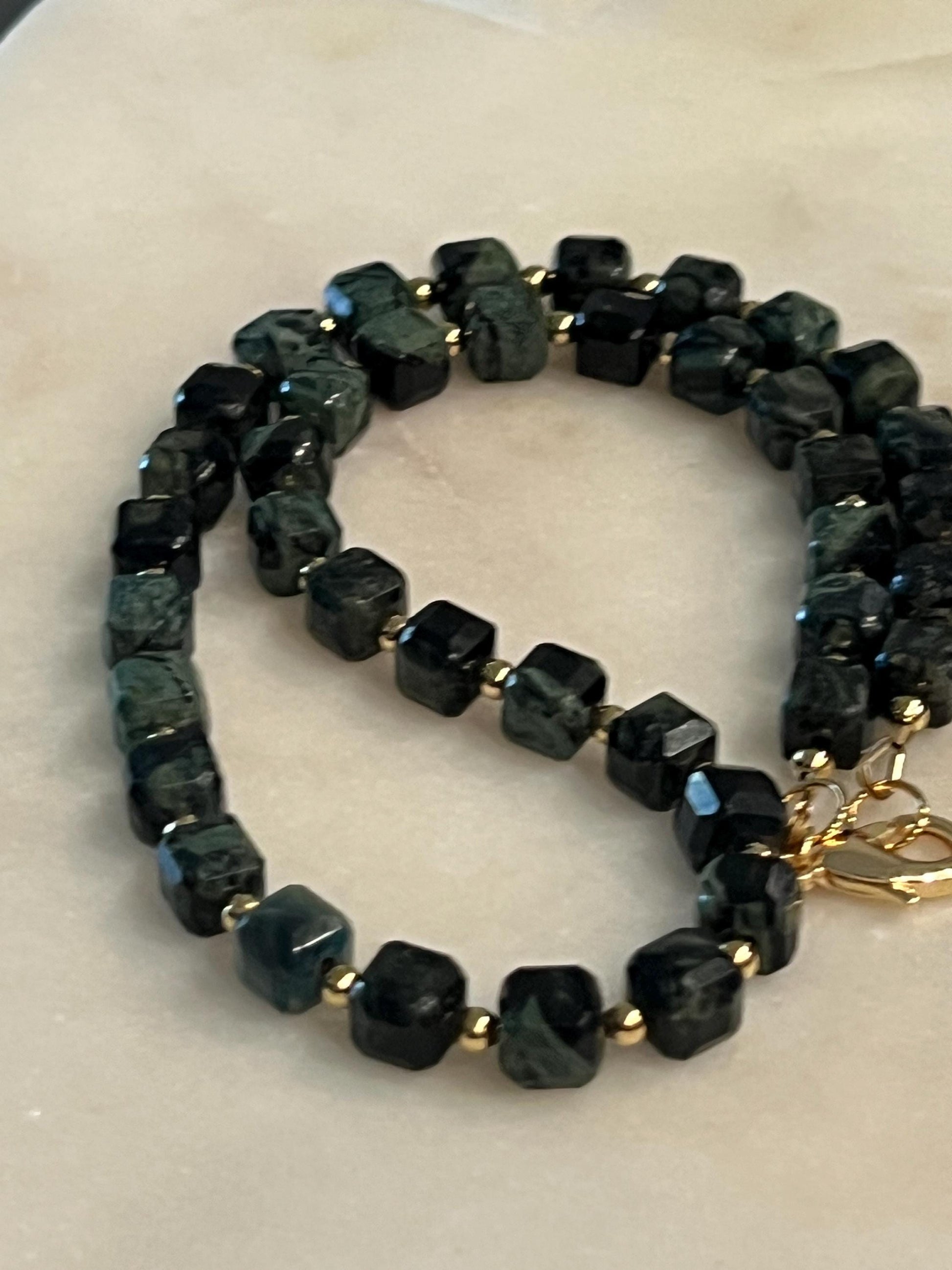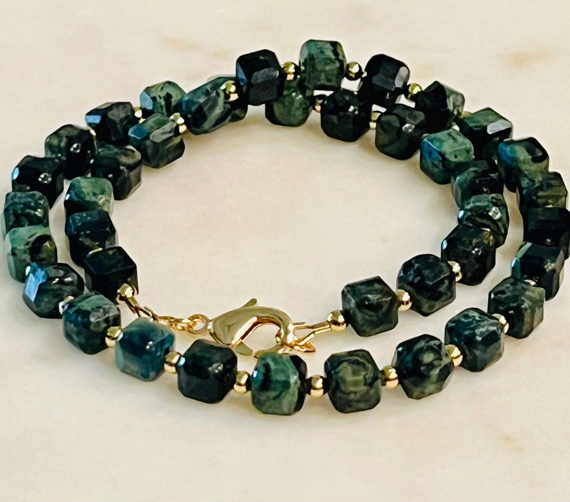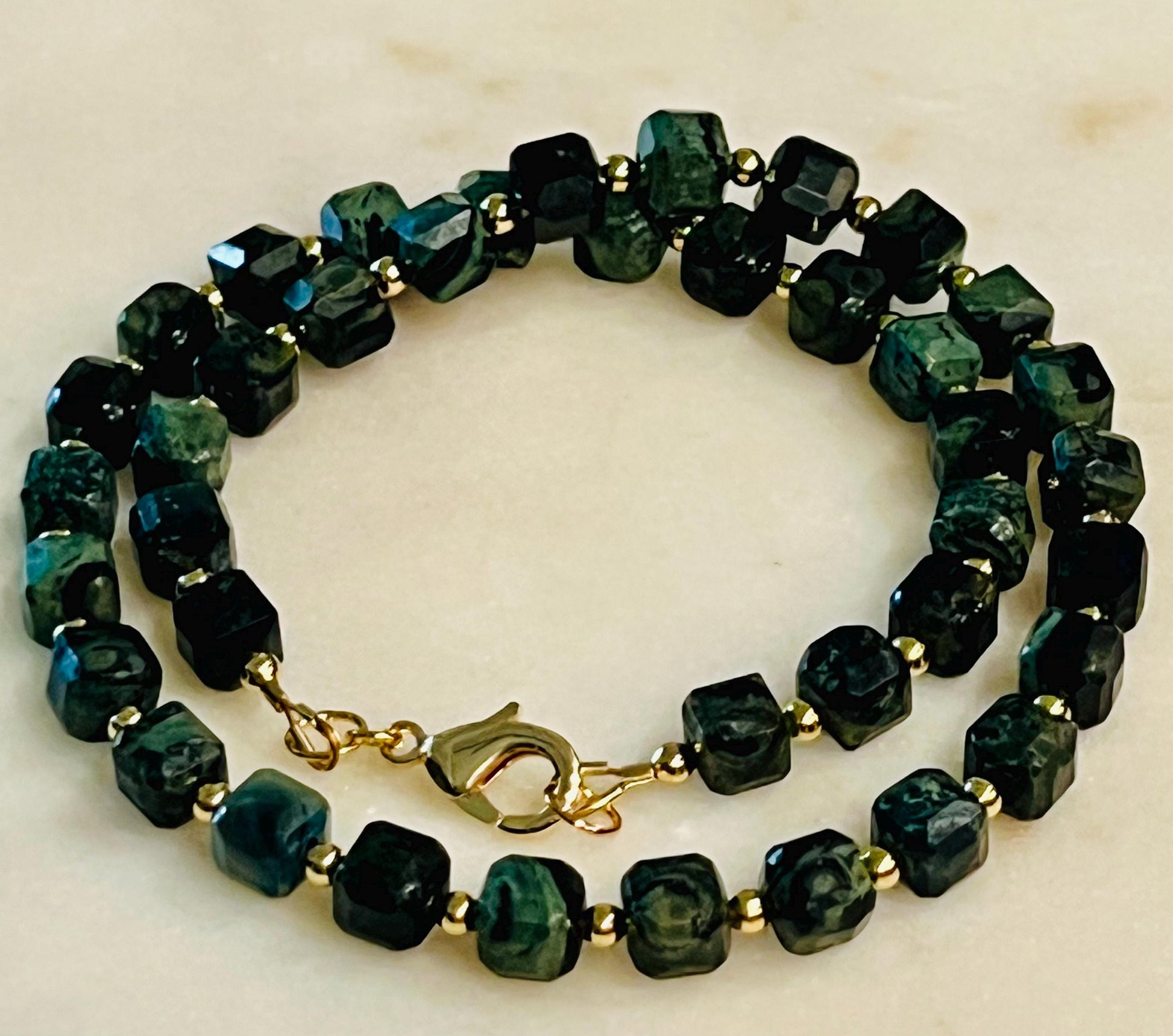 Natural Gemstone Necklace. Kambaba Jasper 8mm faceted cubed beaded necklace with 18k gold filled large lobster clasp and 18k gold filled 3mm beads in between each Jasper stone. 16.5 inches in length. Stunning necklace. Arrives thoughtfully packaged in an eco-friendly kraft box wrapped in ribbon, ready for gifting or keeping for yourself.