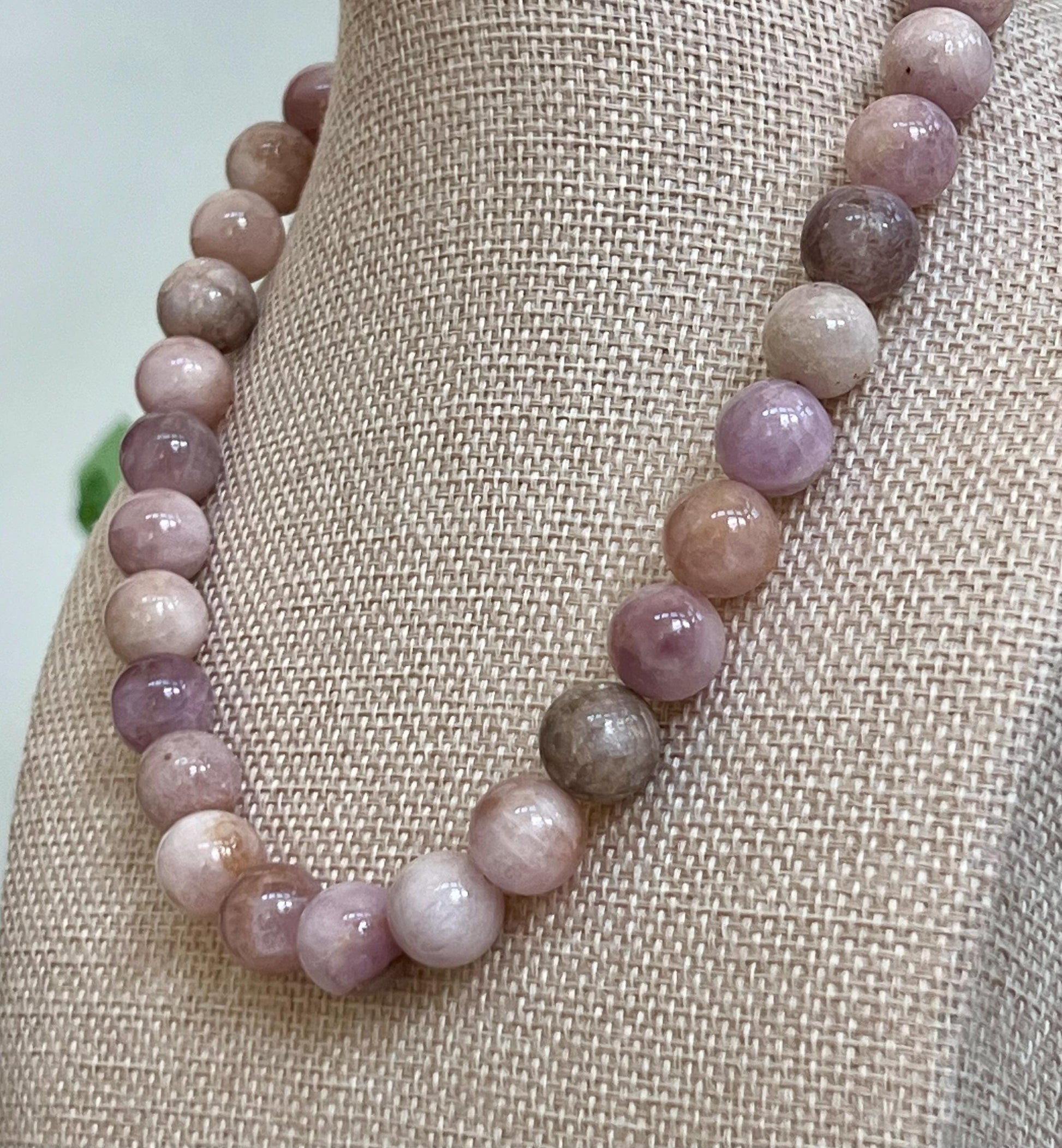 Natural gemstone necklace. Kunzite 12mm smooth round beaded necklace with 18k gold filled clasp. Arrives thoughtfully packaged in an eco-friendly kraft box wrapped in ribbon, ready for gifting or keeping for yourself.