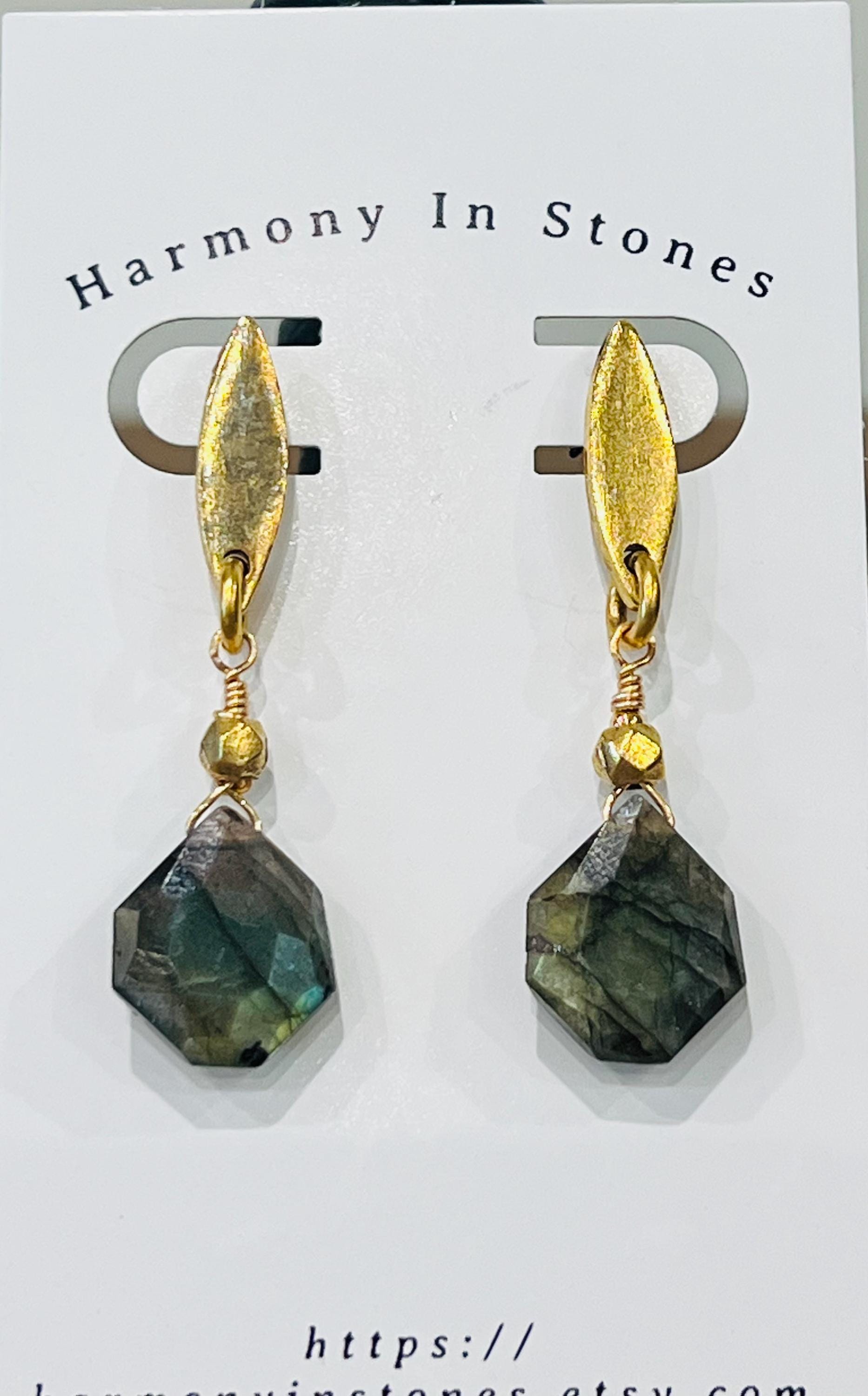 labradorite drop earrings with non-tarnish gold plated pewter beads and gold plated pewter navette post drops with stainless steel posts. 1.75 inches in length. Arrives thoughtfully packaged in an eco-friendly kraft box wrapped in ribbon, ready for gifting or keeping for yourself.