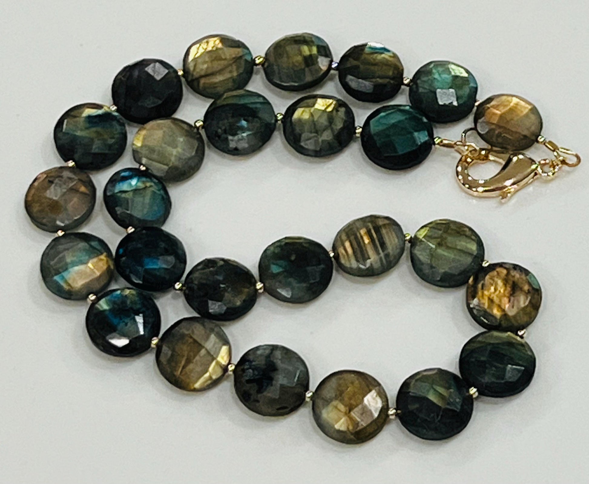 Natural Gemstone Necklace. Labradorite 12mm faceted coin hand cut stones with 18k gold filled large lobster and 18k gold filled 2mm beads between each labradorite stone. Perfect elegant layering necklace. In the metaphysical world, labradorite is considered one of the most powerful protectors. The gemstone creates a shield for auras and protects against negativity of the world. Labradorite is said to temper the negativity within ourselves as well.Arrives thoughtfully packaged in an eco-friendly kraft box wrapped in ribbon, ready for gifting or keeping for yourself.