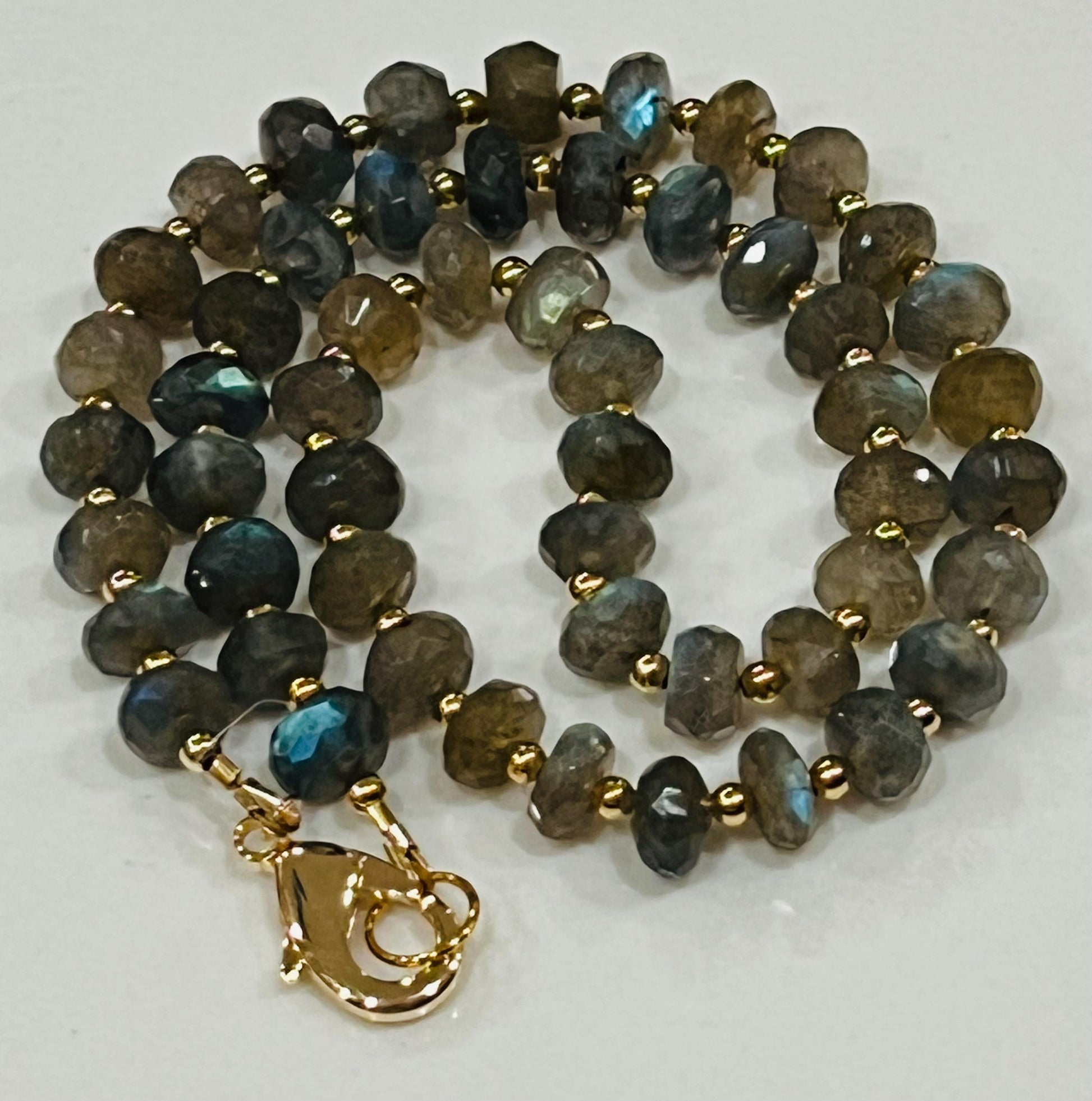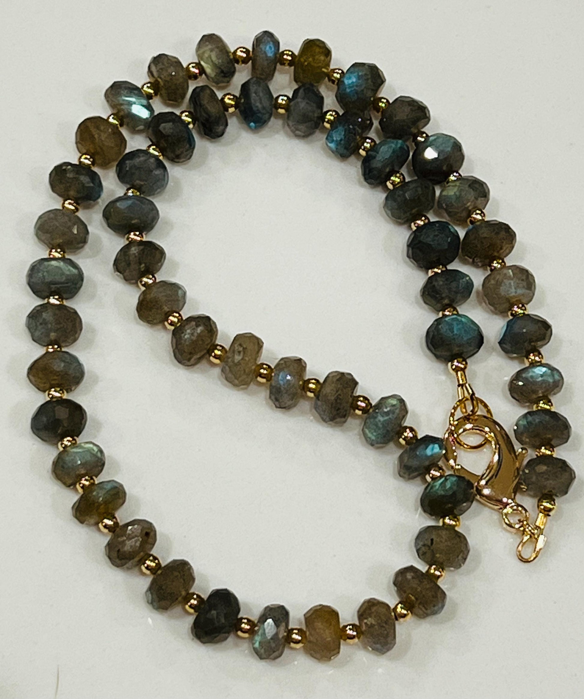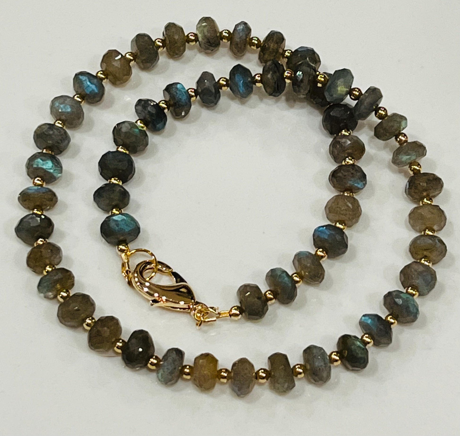 Natural Gemstone Necklace. Labradorite 8mm faceted rondelle hand cut with 18k gold filled large lobster and 18k gold filled 3mm beads between each labradorite stone. Perfect elegant layering necklace. In the metaphysical world, labradorite is considered one of the most powerful protectors. The gemstone creates a shield for auras and protects against negativity of the world. Labradorite is said to temper the negativity within ourselves as well.Arrives thoughtfully packaged in an eco-friendly kraft box wrapped in ribbon, ready for gifting or keeping for yourself.