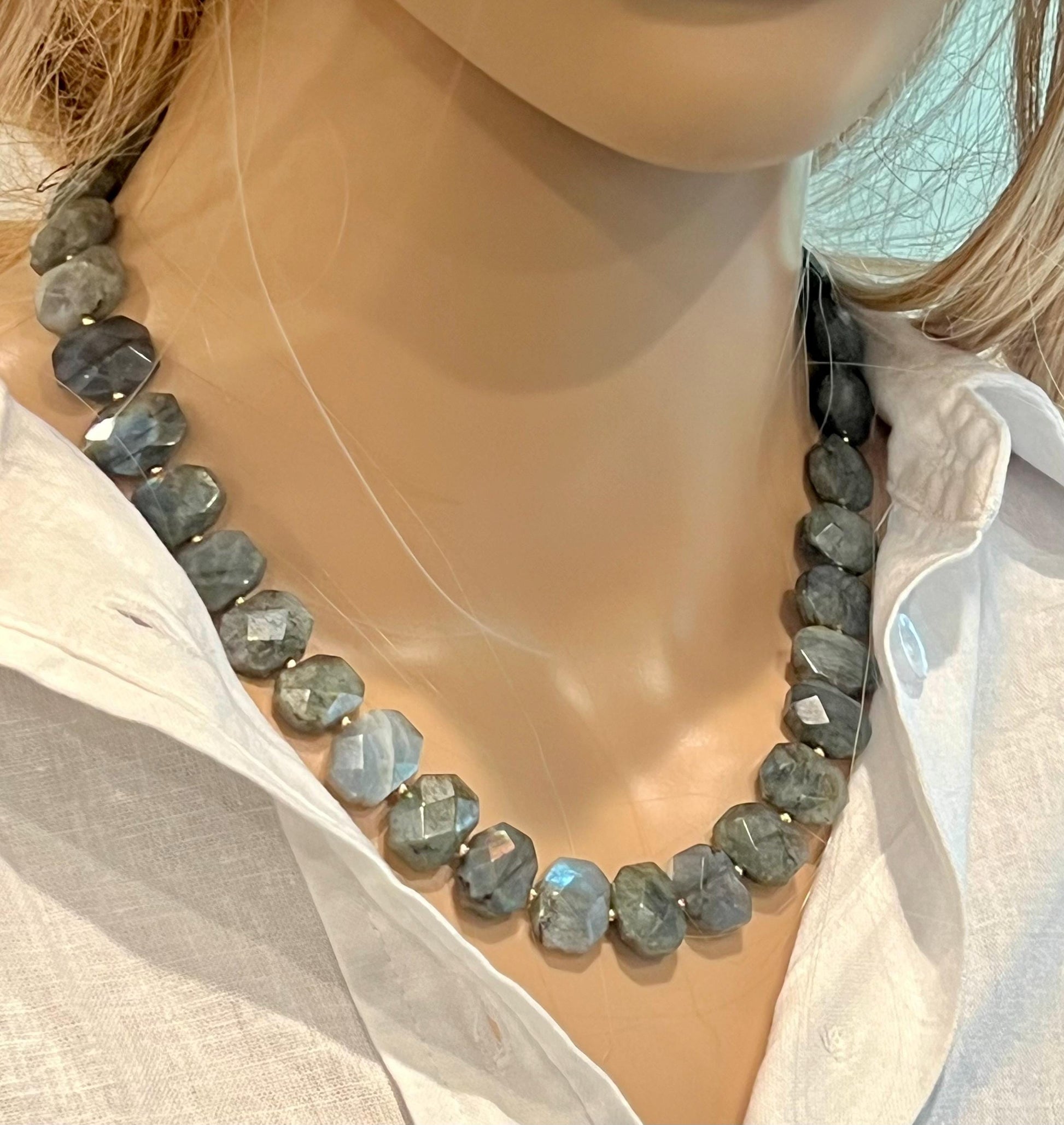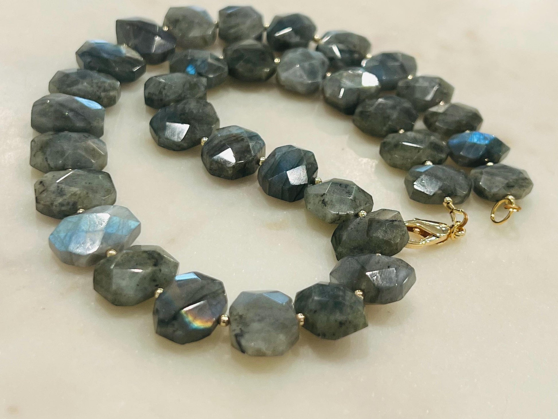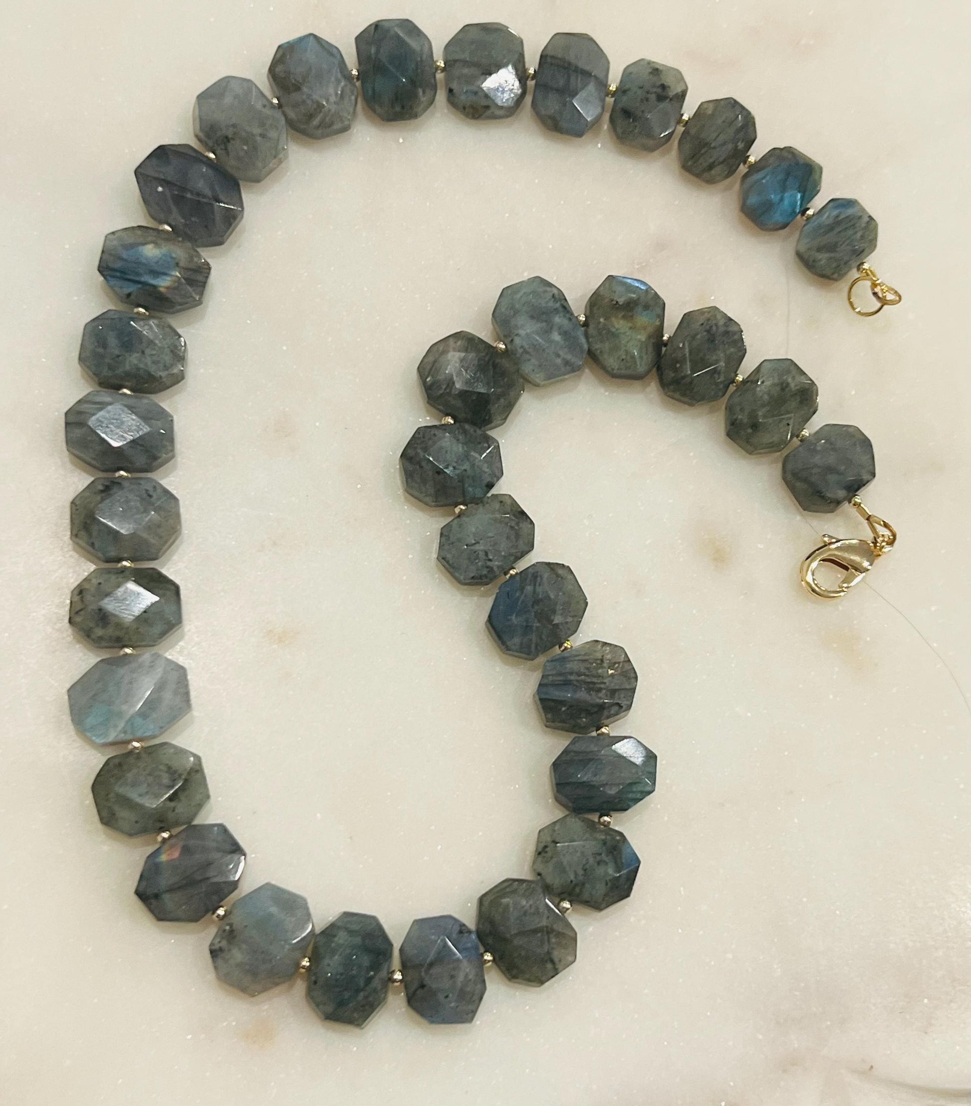 Natural Gemstone Necklace. Gorgeous high quality Labradorite faceted octagon stones with 18k gold filled clasp. 18k gold filled accent beads between each labradorite stone. Elegant statement necklace. Arrives thoughtfully packaged in an eco-friendly kraft box wrapped in ribbon, ready for gifting or keeping for yourself.