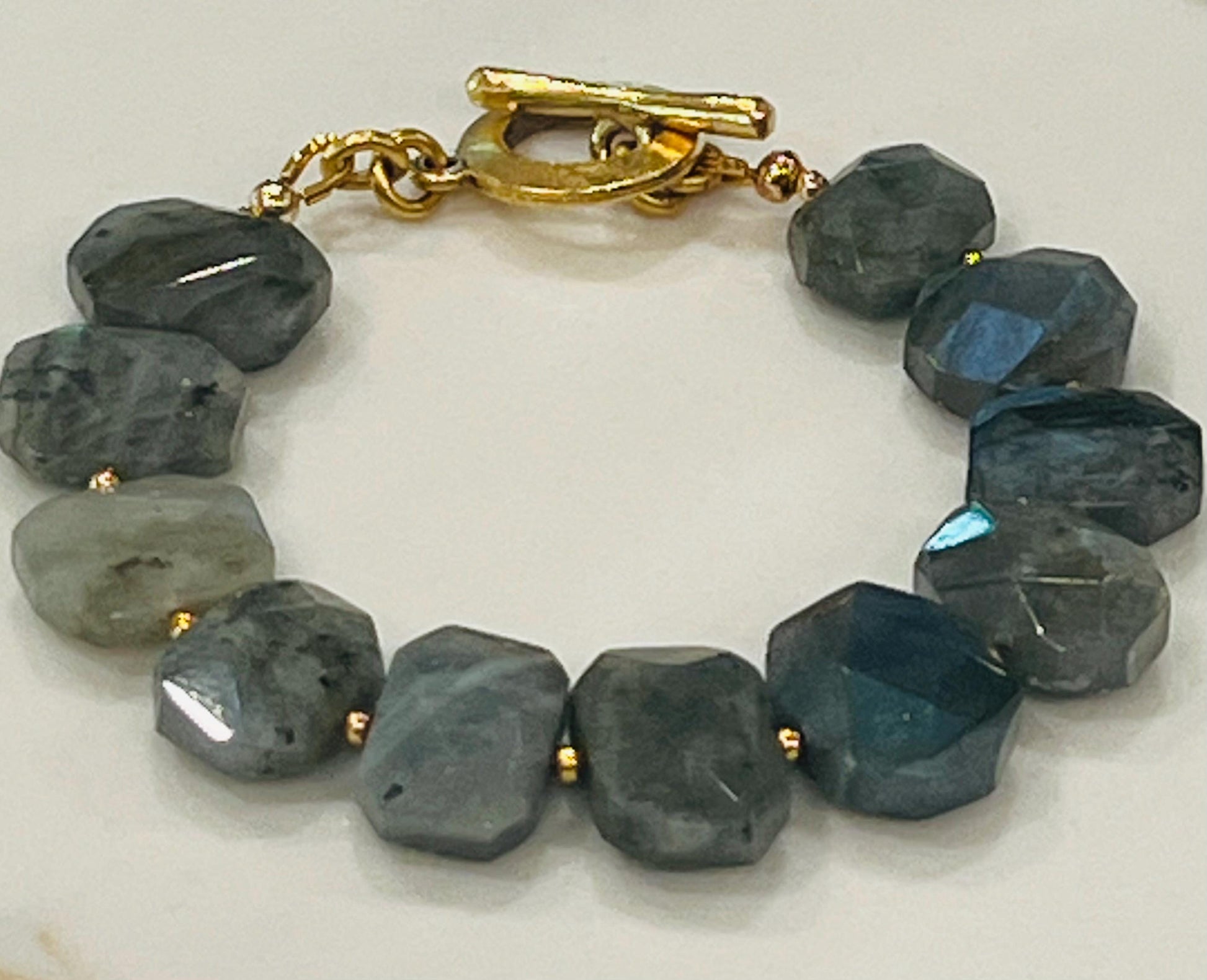 Labradorite Bracelet Labradorite Beaded Chunky Bracelet Non-Tarnish Gold Plated Pewter Toggle Gorgeous Labradorite Stones Elegant Bracelet
