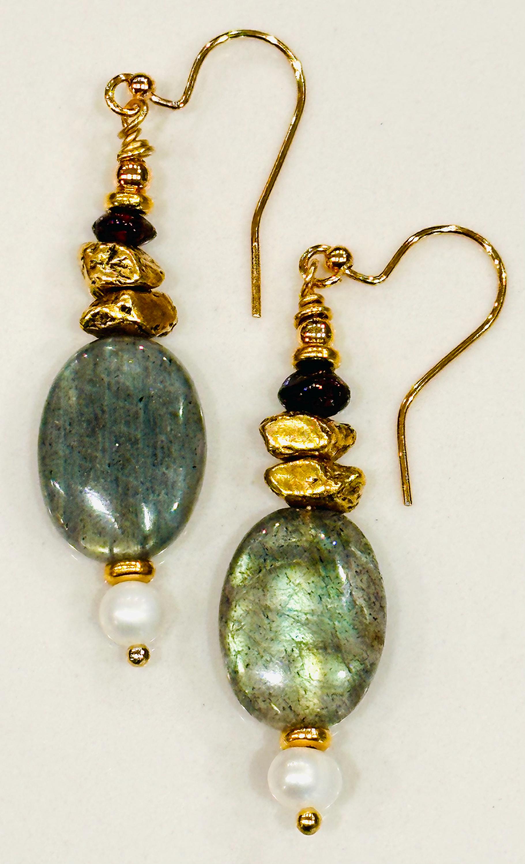 Labradorite Earrings Drop Gold Garnet Pearl Earrings Red Grey Pearl Beaded Bohemian Earrings Round Drop Earrings 2.5 inch Drop