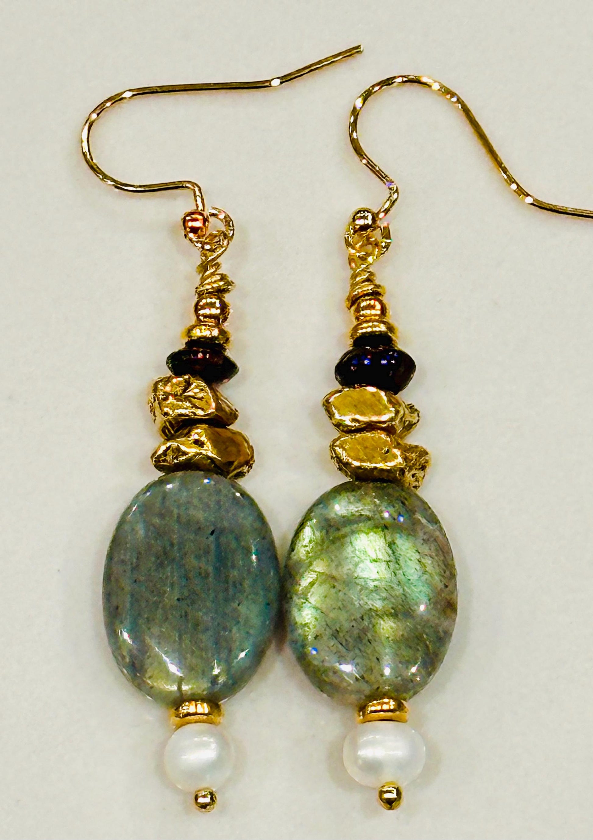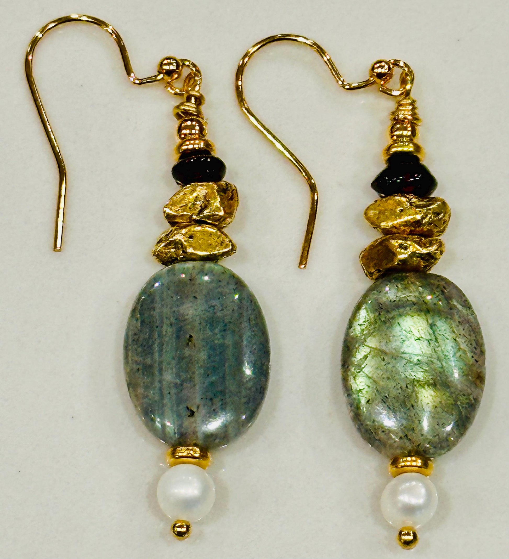 Labradorite Freshwater Pearl and Garnet drop earrings with non-tarnish gold plated pewter beads and gold plated brass ear wires. Arrives thoughtfully packaged in an eco-friendly kraft box wrapped in ribbon, ready for gifting or keeping for yourself.