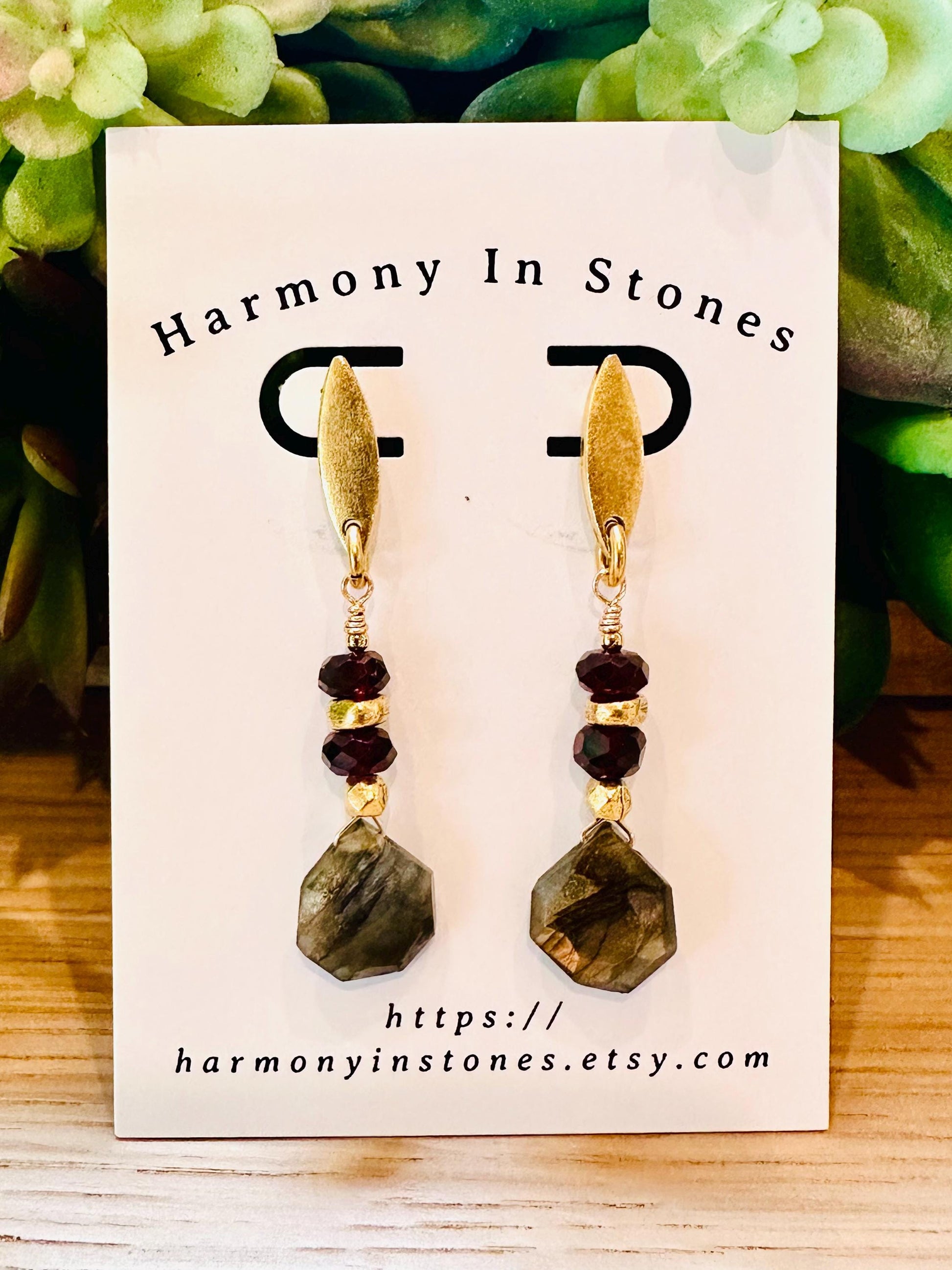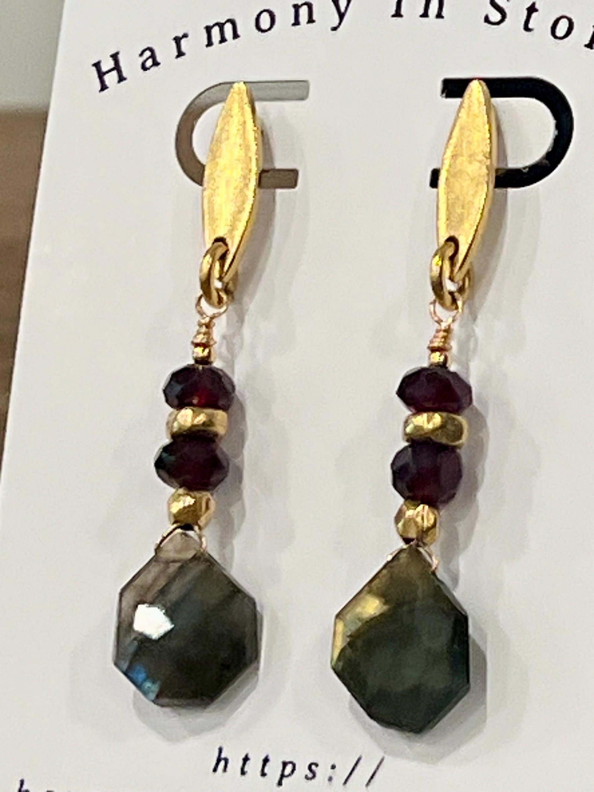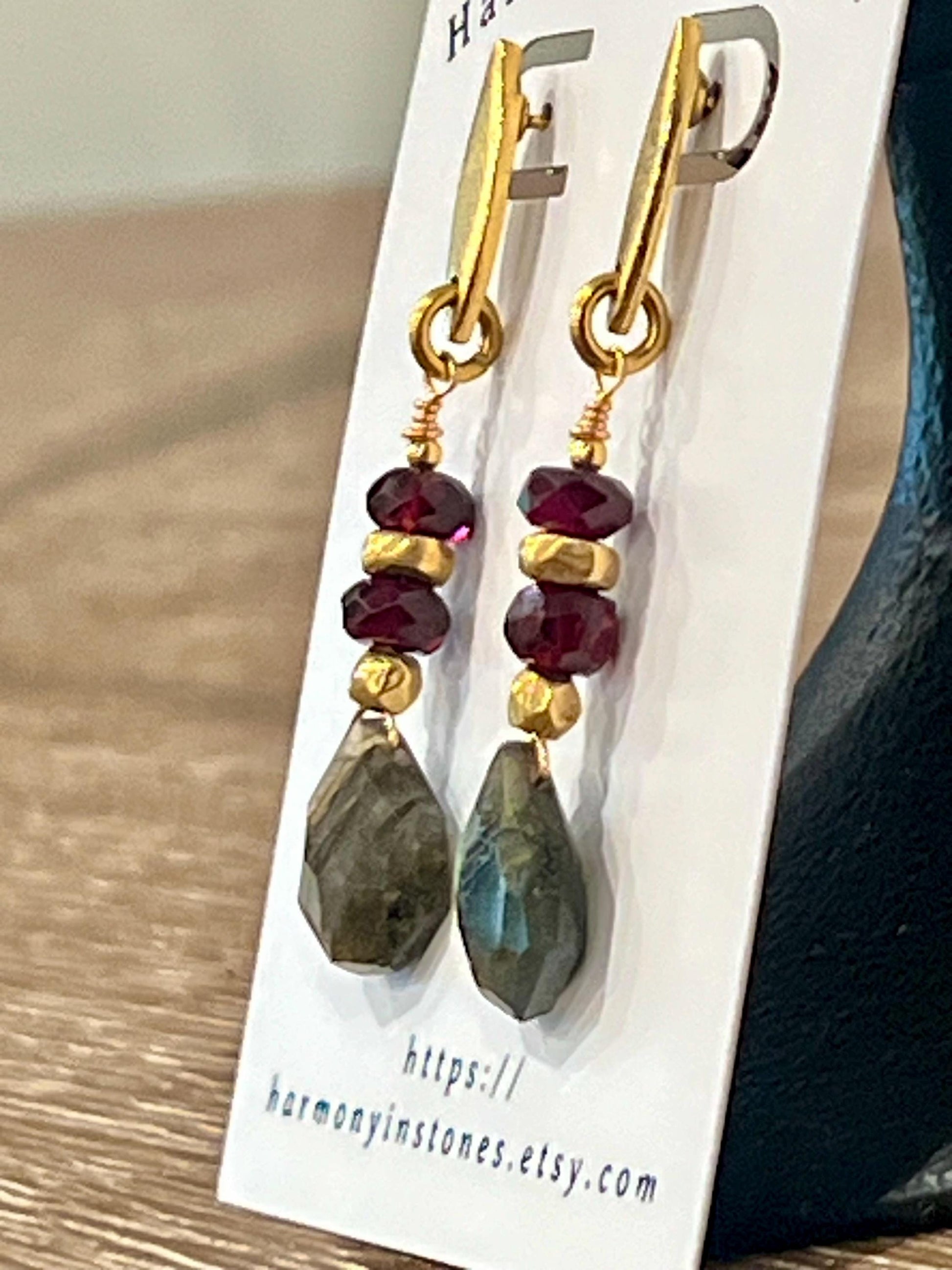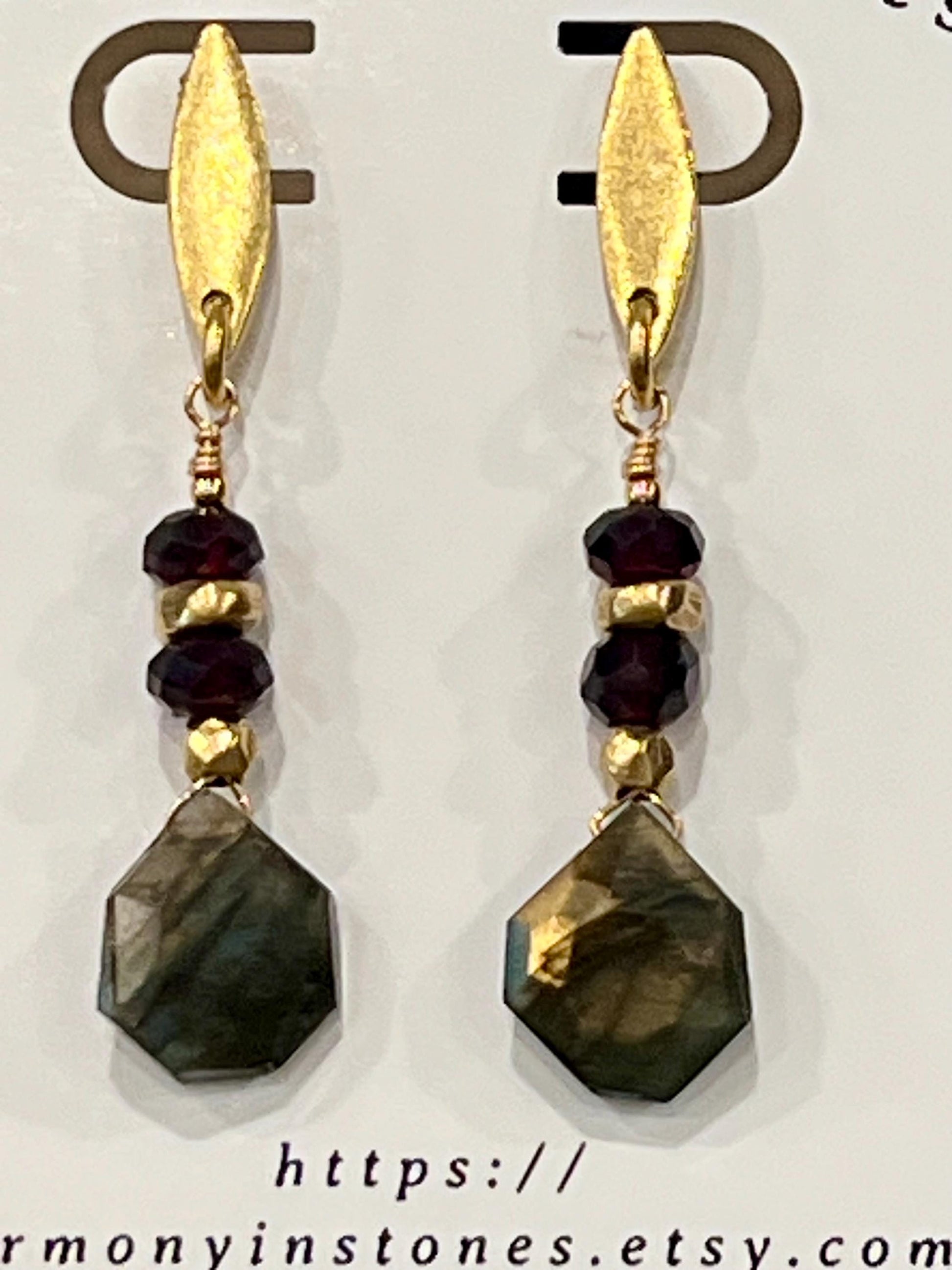Faceted labradorite and faceted garnet drop earrings with non-tarnish gold plated pewter beads and gold plated pewter coin post drops with stainless steel posts. 2inches in length. Arrives thoughtfully packaged in an eco-friendly kraft box wrapped in ribbon, ready for gifting or keeping for yourself.