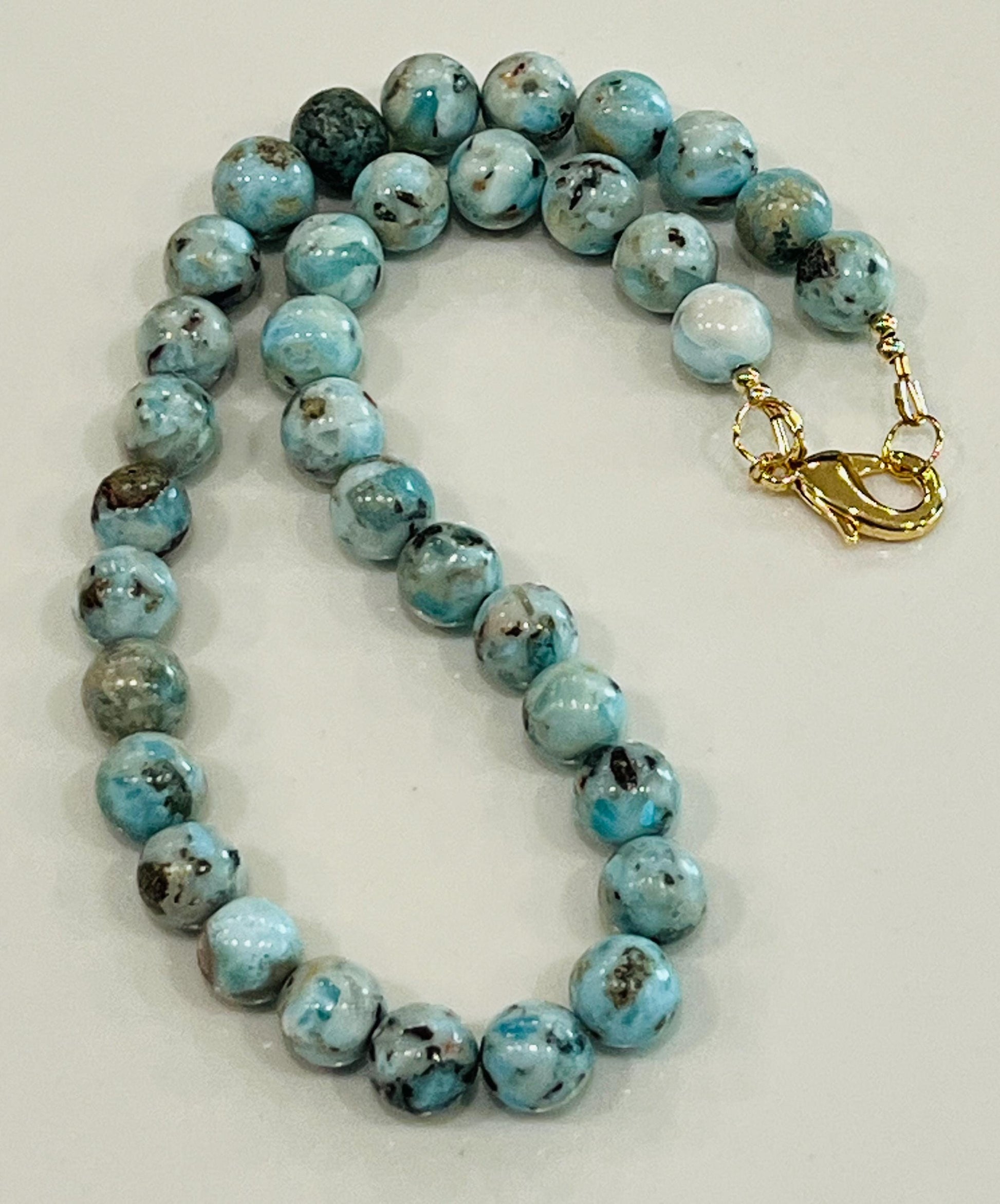 Larimar Beaded Necklace: 10mm Round Gemstone, 18k Gold Filled Clasp