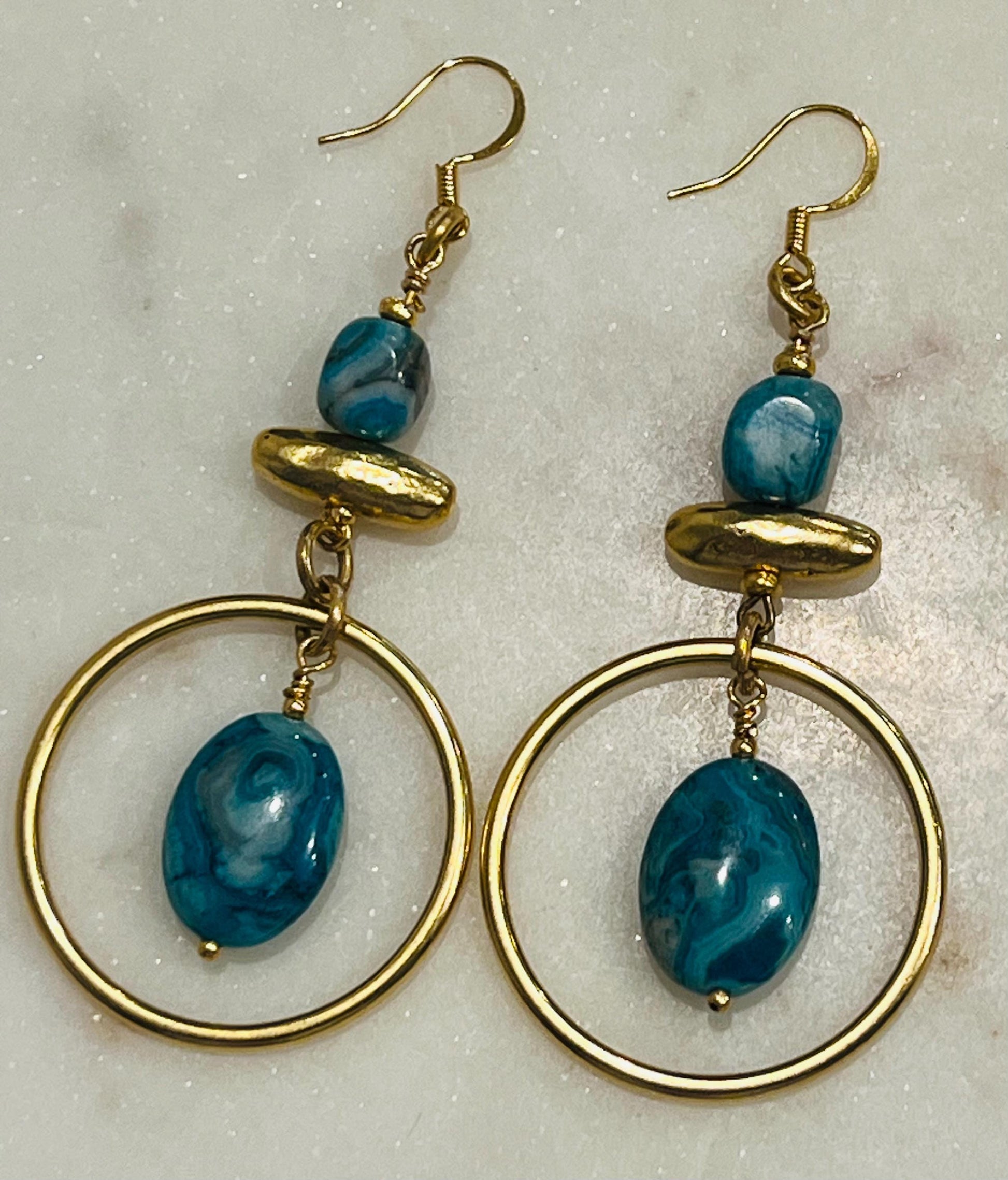 Larimar crazy lace agate drop earrings with non-tarnish gold plated pewter round frames and gold plated stainless steel ear wires. 3 inches in length. Arrives thoughtfully packaged in an eco-friendly kraft box wrapped in ribbon, ready for gifting or keeping for yourself.