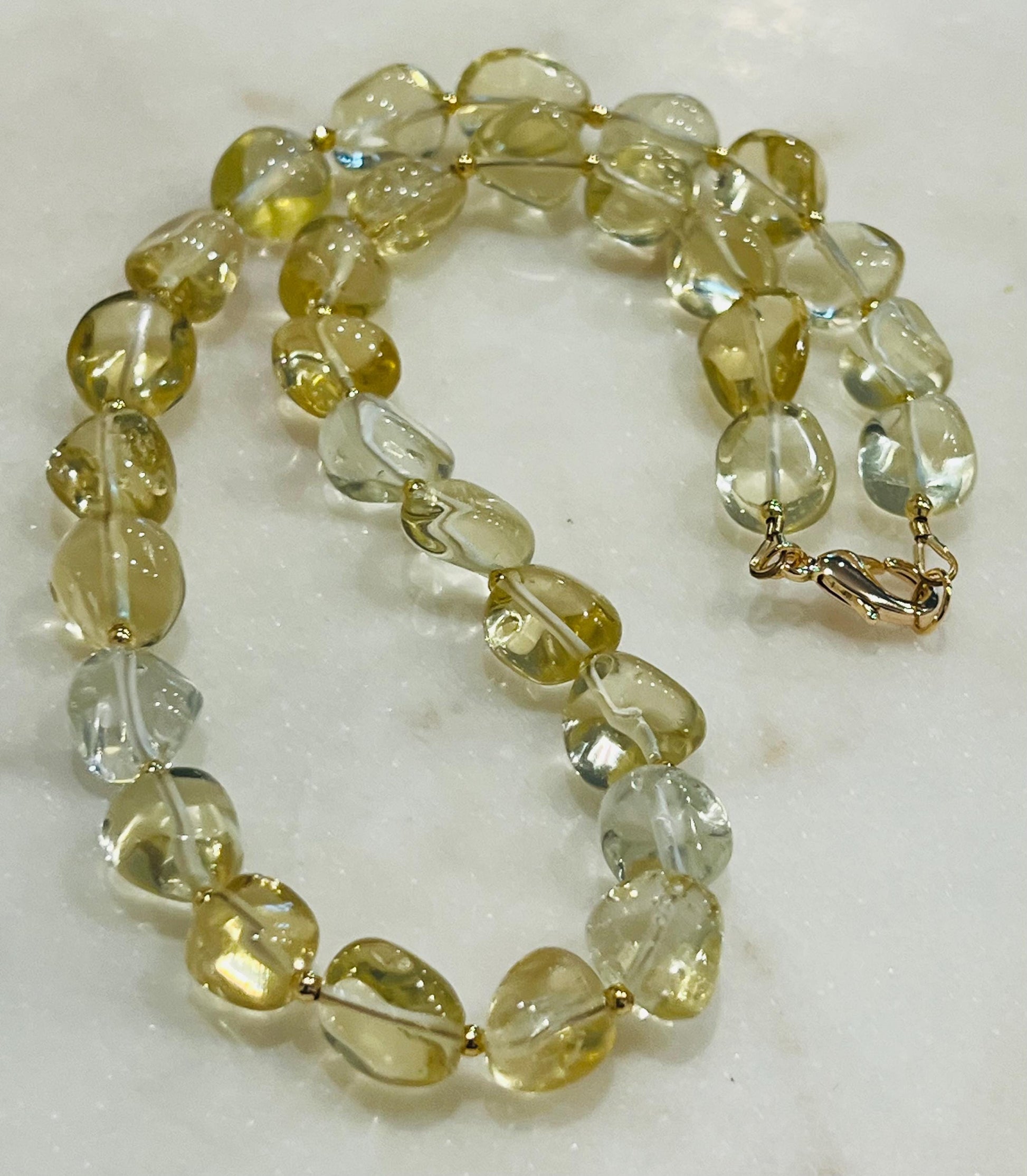 Natural Gemstone Necklace. Lemon Quartz Beaded Necklace with 18k Gold Filled Clasp and 2.5mm gold filled round beads between each quartz Tumbled Nugget stone. 10-13x10-11mm Smooth Quartz Stones. Arrives thoughtfully packaged in an eco-friendly kraft box wrapped in ribbon, ready for gifting or keeping for yourself.