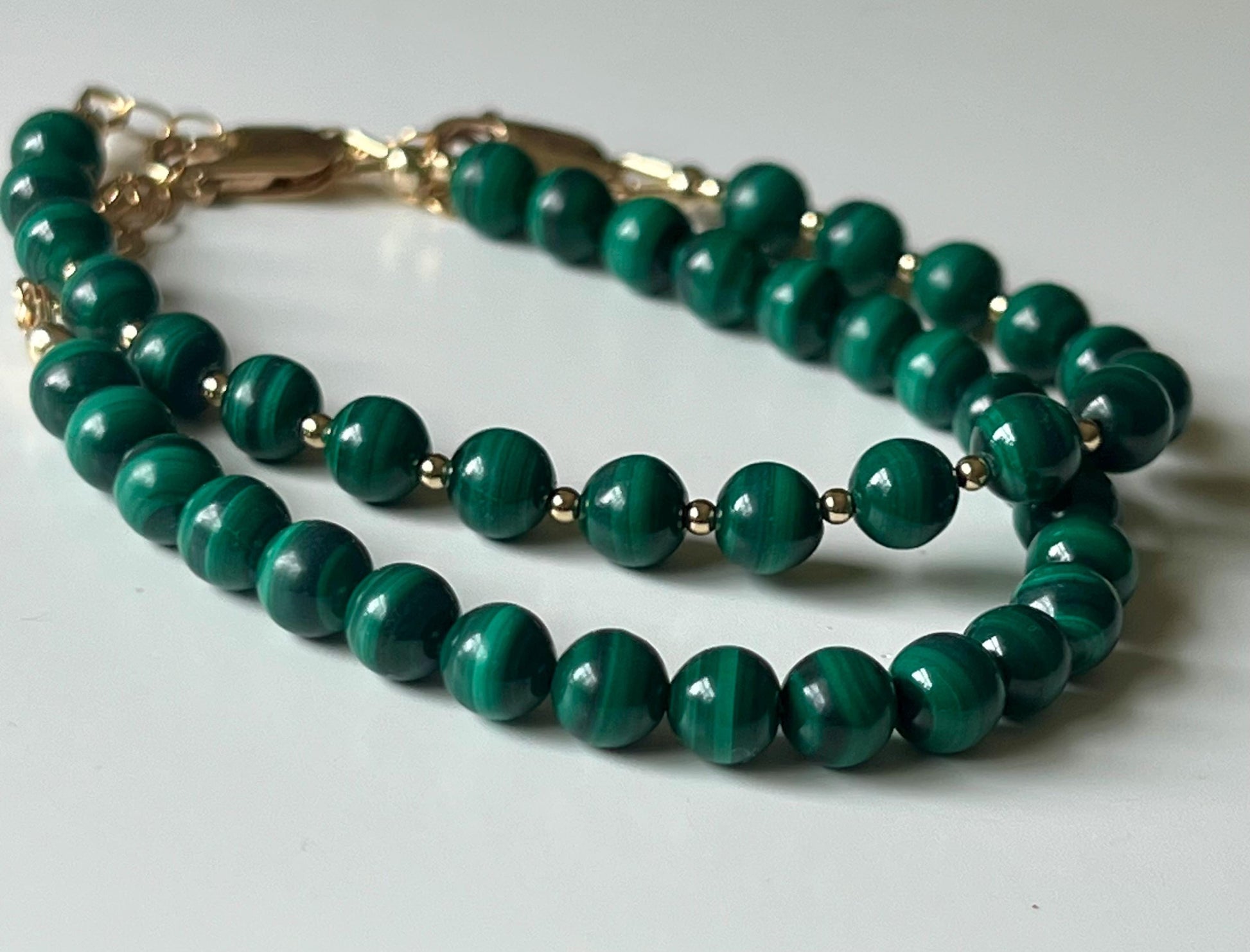 Malachite Smooth round 6mm stones with gold filled beads, gold filled clasp, and gold filled extender that allows for length to range from 6.5 to 8 inches. Arrives thoughtfully packaged in an eco-friendly kraft box wrapped in ribbon, ready for gifting or keeping for yourself.