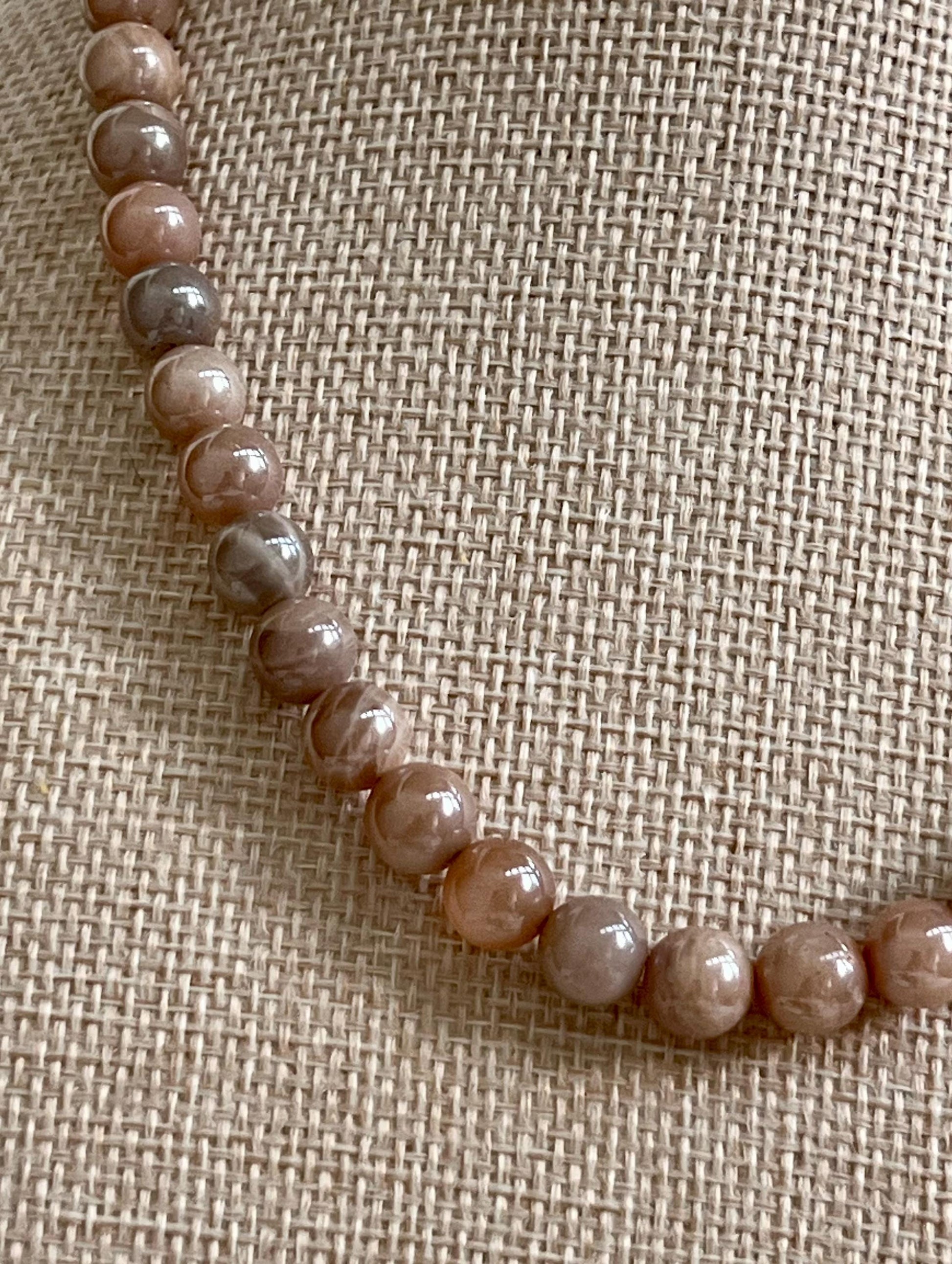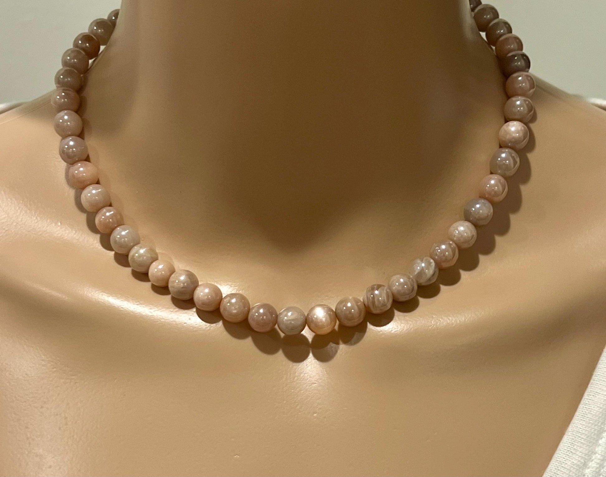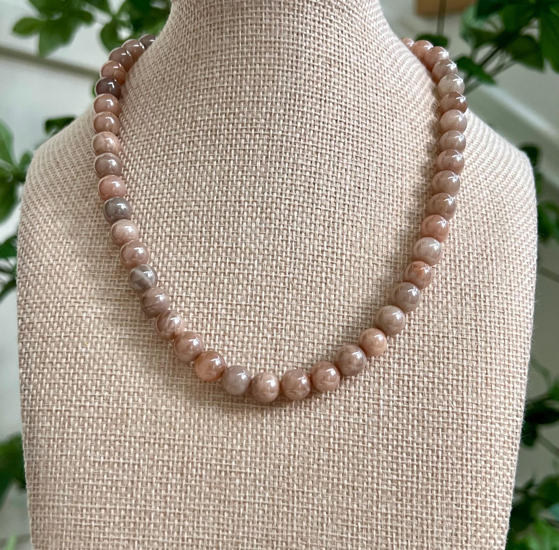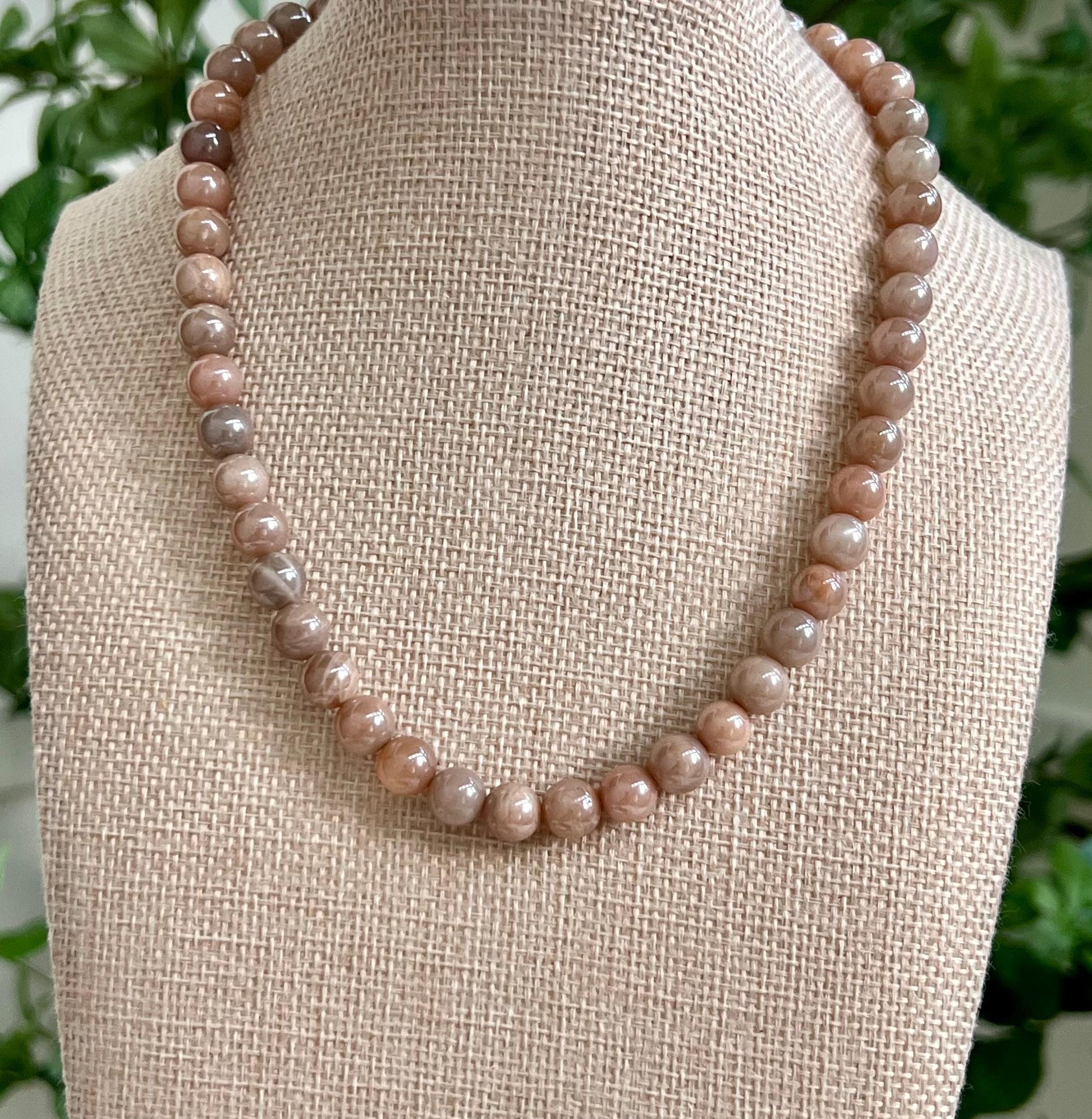 Peach Moonstone Beaded Necklace: 18k Gold Filled Clasp, Electroplated 8mm Beads