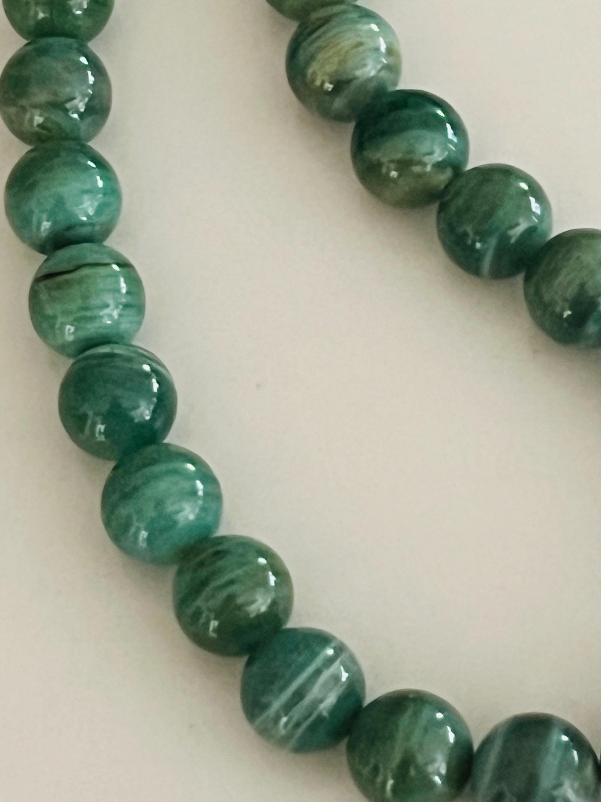 Natural Green Pilbara Prase 10mm smooth round beads with an 18k gold filled lobster clasp. Arrives thoughtfully packaged in an eco-friendly kraft box wrapped in ribbon, ready for gifting or keeping for yourself.