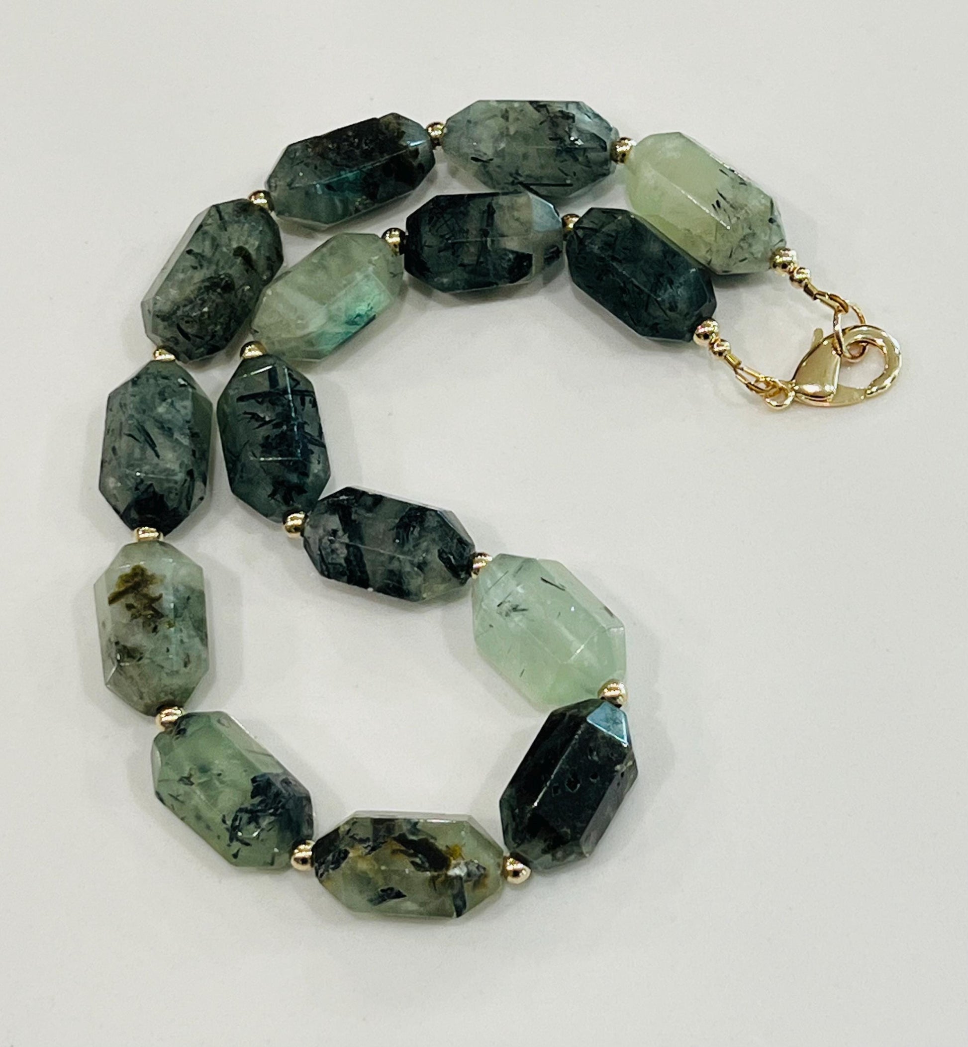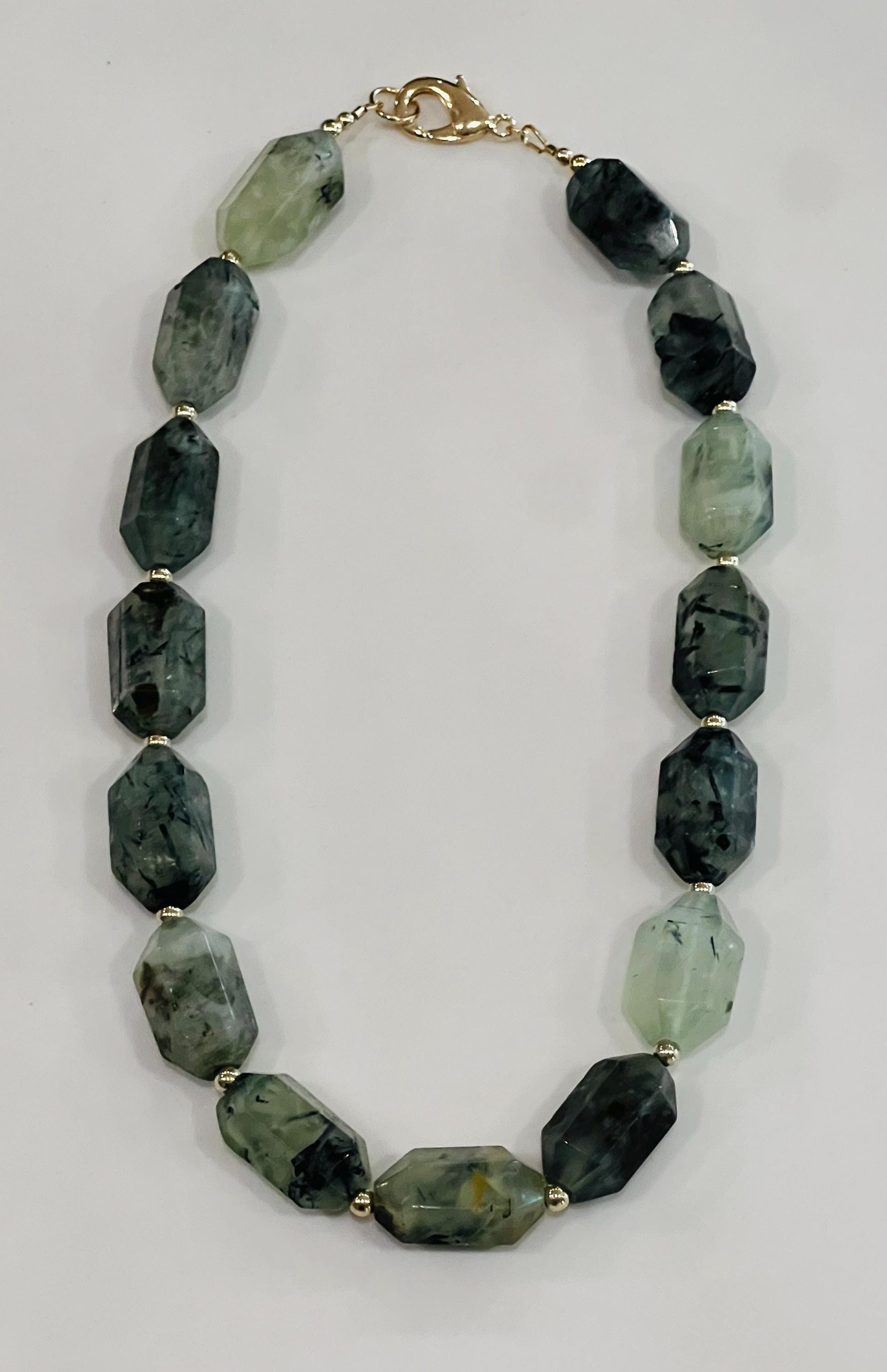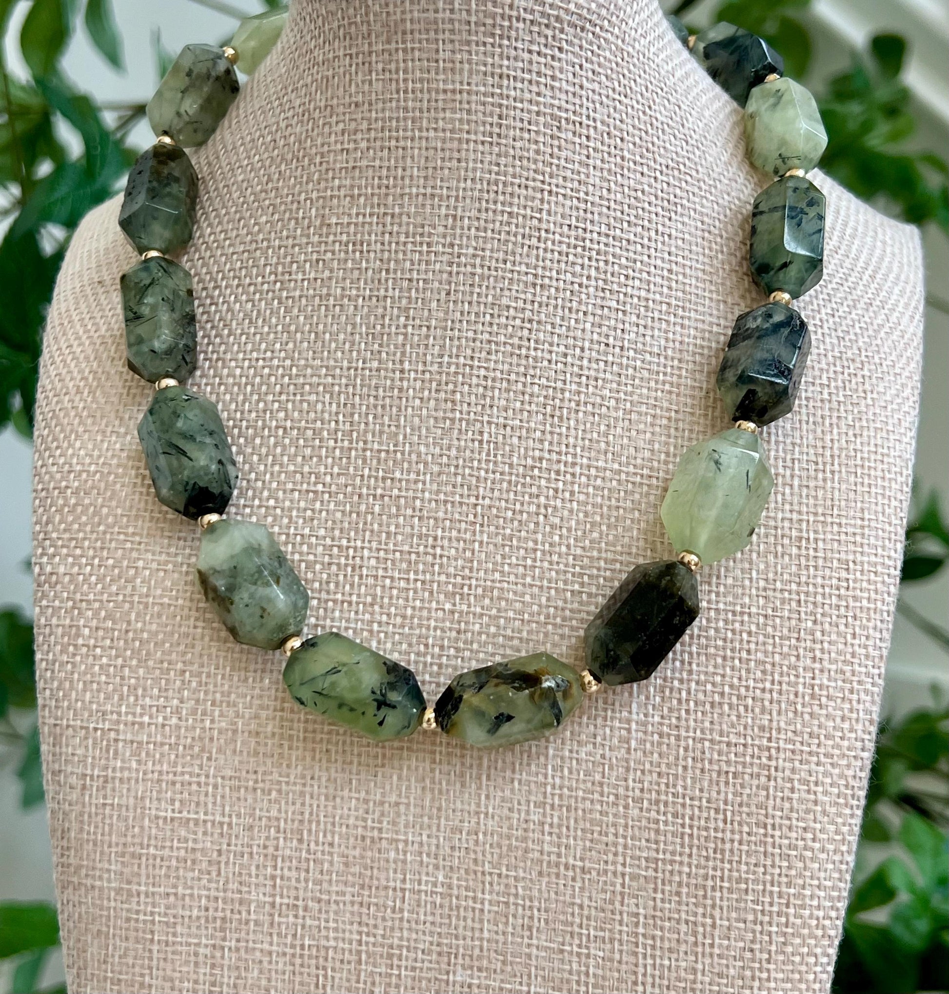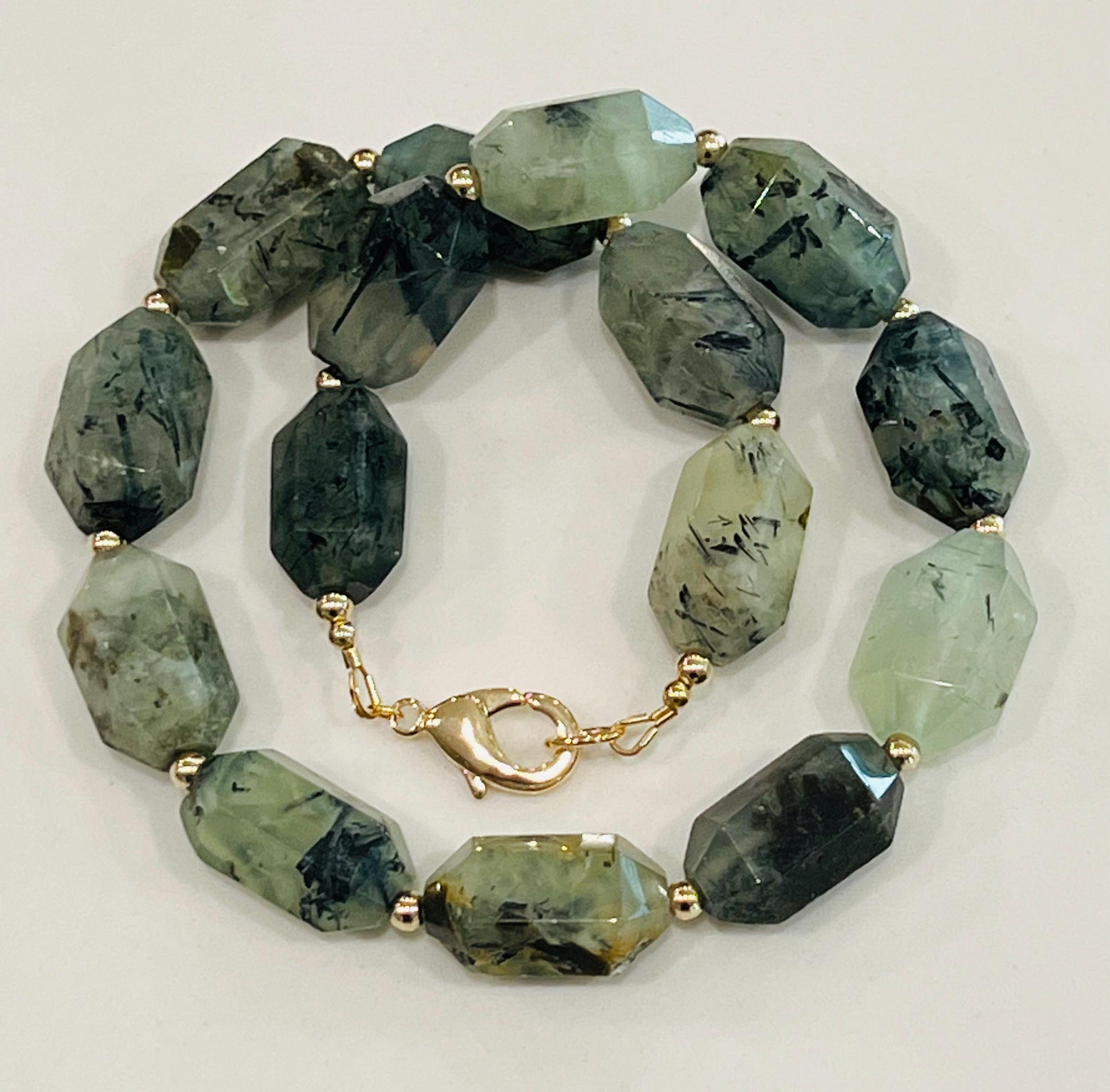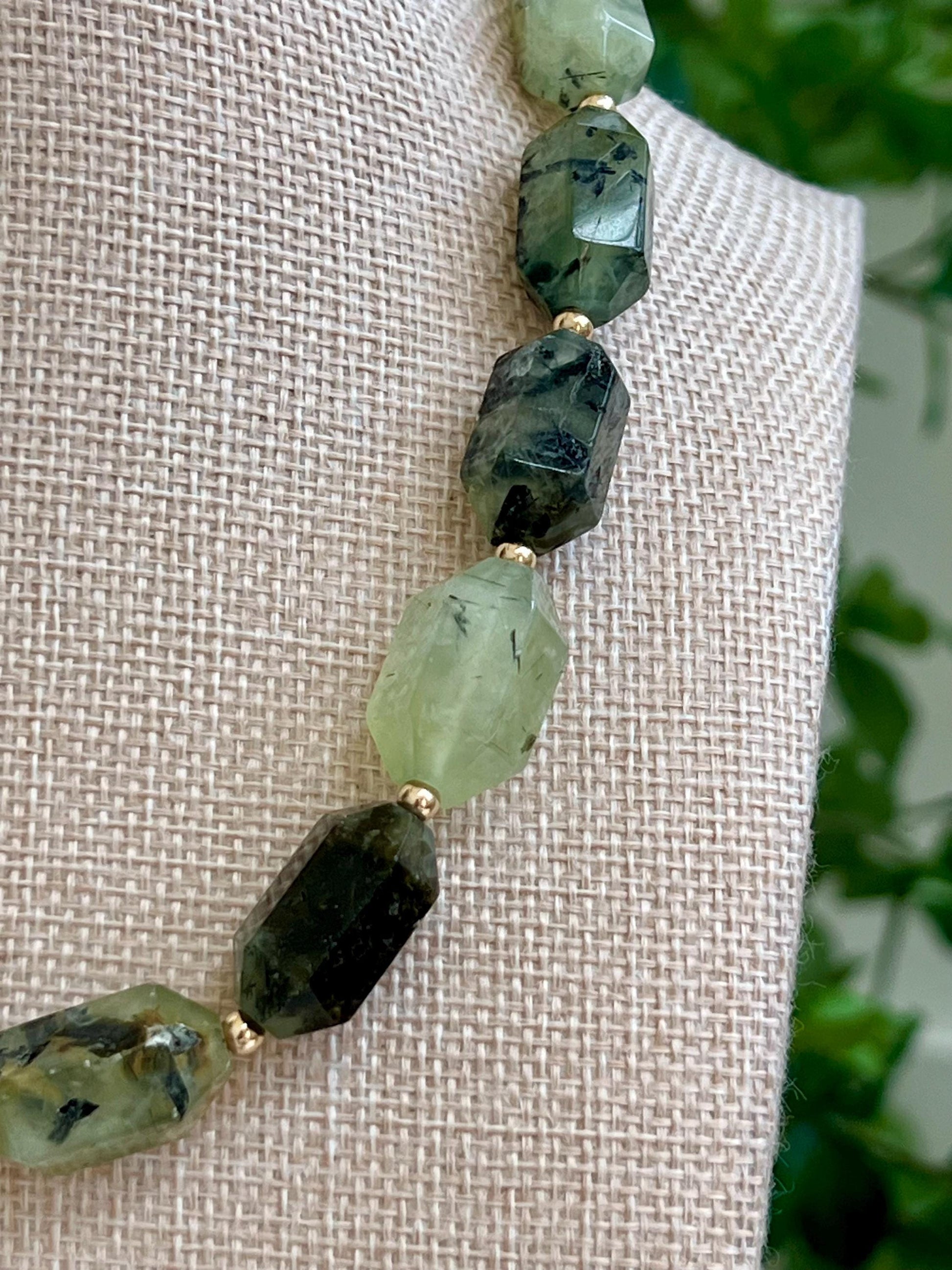 Natural Gemstone Necklace. Natural Prehnite Prism Cut Double Point Bead Size 15x25mm Stones. Gorgeous sparkling Prehnite stones with an 18k gold filled lobster clasp and 4mm gold filled beads between each Prehnite stone. Arrives thoughtfully packaged in an eco-friendly kraft box wrapped in ribbon, ready for gifting or keeping for yourself.