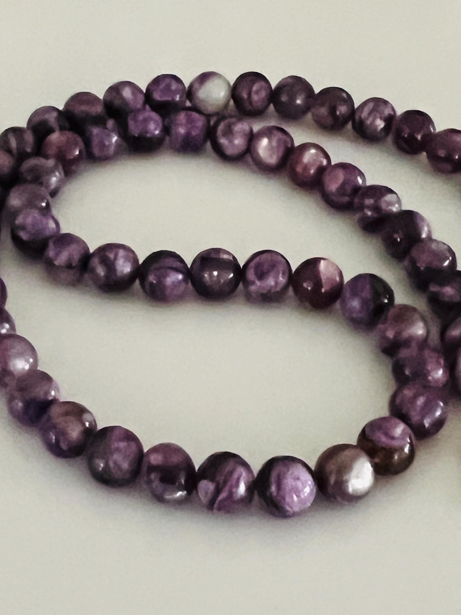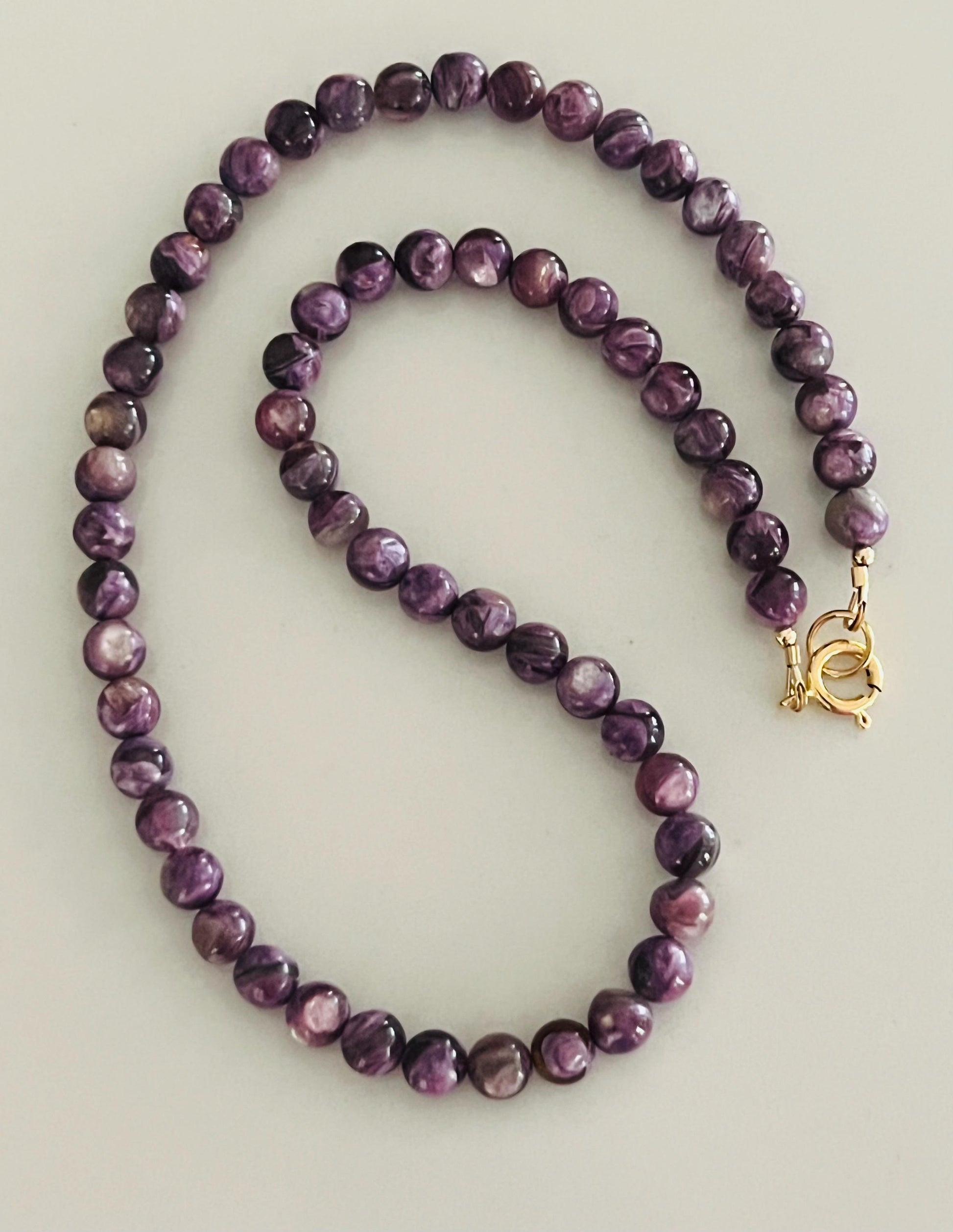 Natural gemstone necklace. High quality Purple Mica Muscovite 7mm smooth round beaded necklace with an 18k gold filled clasp. The reflection on these stones and coloring is truly breathtaking. Arrives thoughtfully packaged in an eco-friendly kraft box wrapped in ribbon, ready for gifting or keeping for yourself.