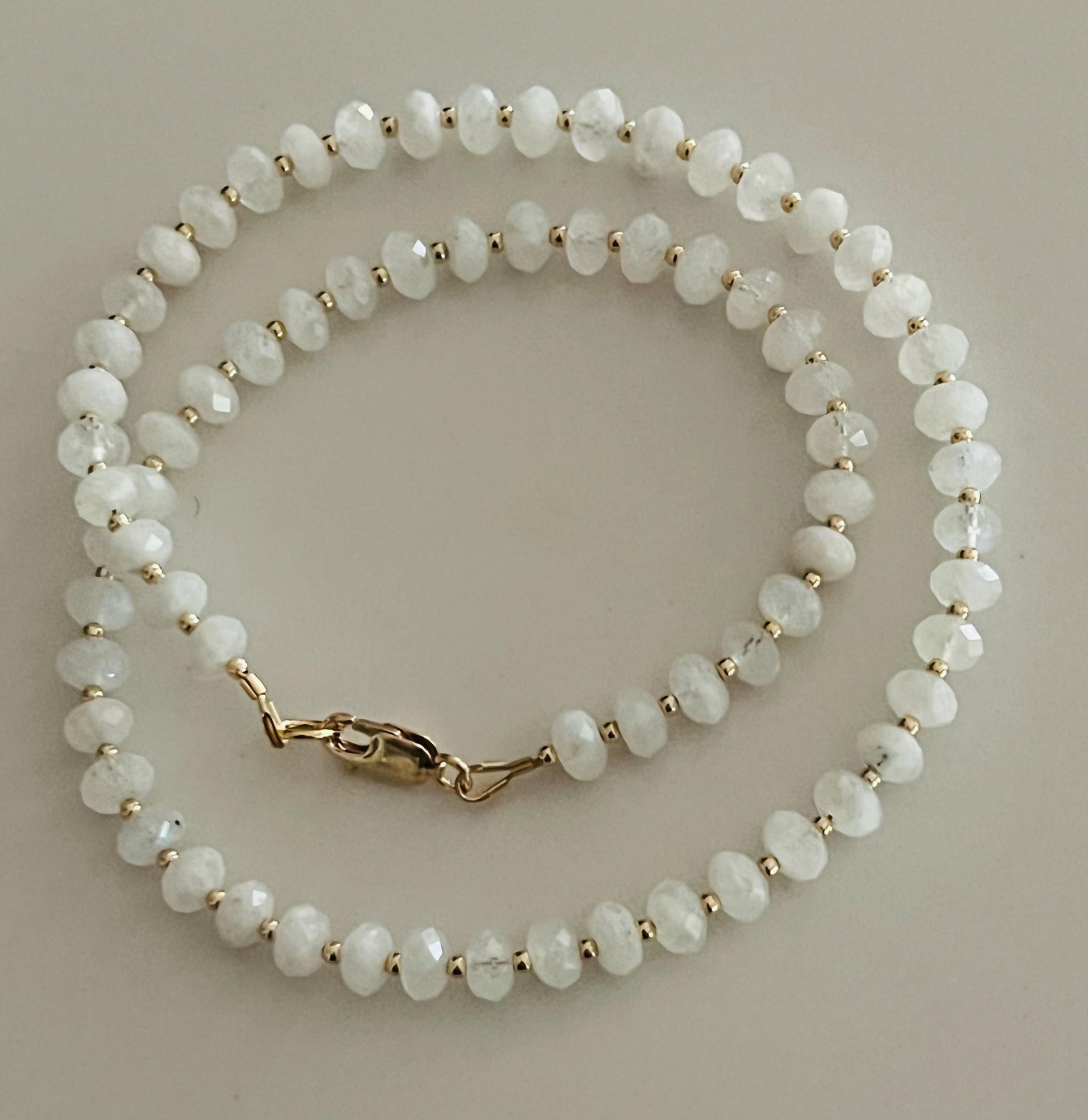 Natural Gemstone Necklace. Natural Rainbow Moonstone faceted black speckled 6mm rondelle necklace with an 18k gold filled clasp and a 2mm gold filled round beads between each Moonstone stone. Arrives thoughtfully packaged in an eco-friendly kraft box wrapped in ribbon, ready for gifting or keeping for yourself.