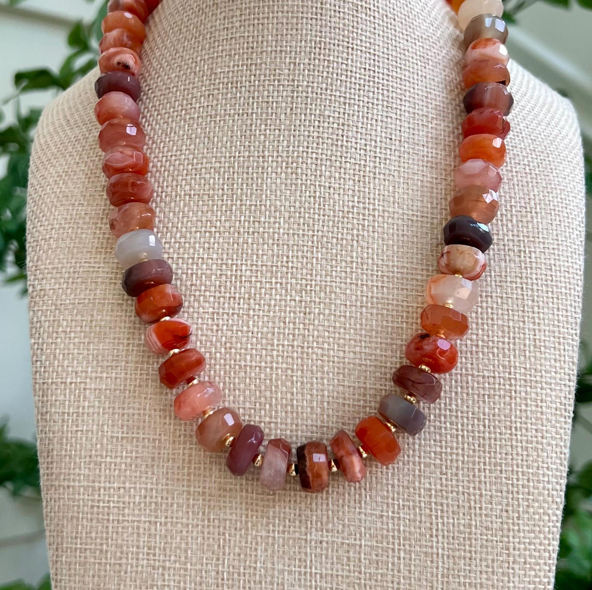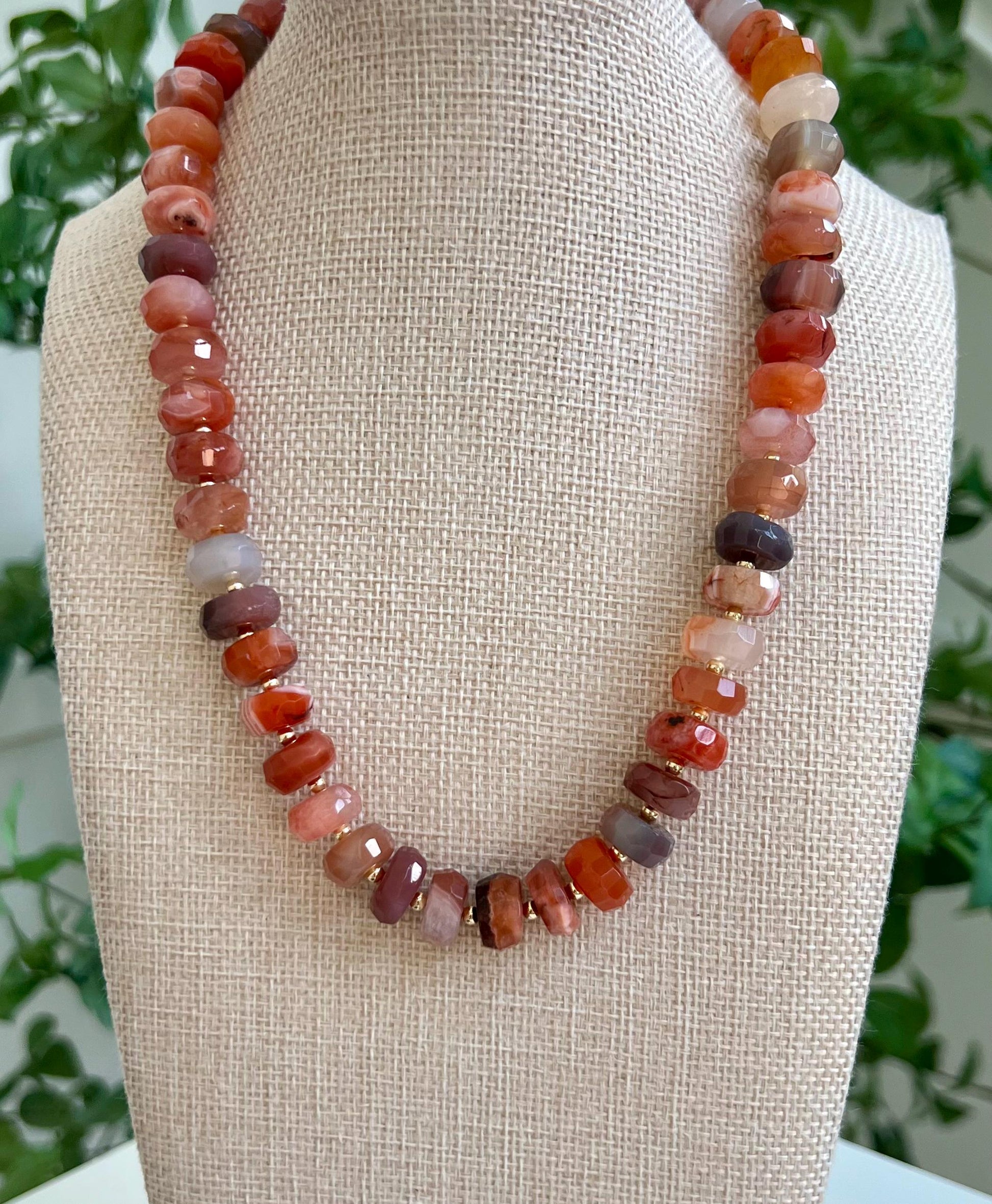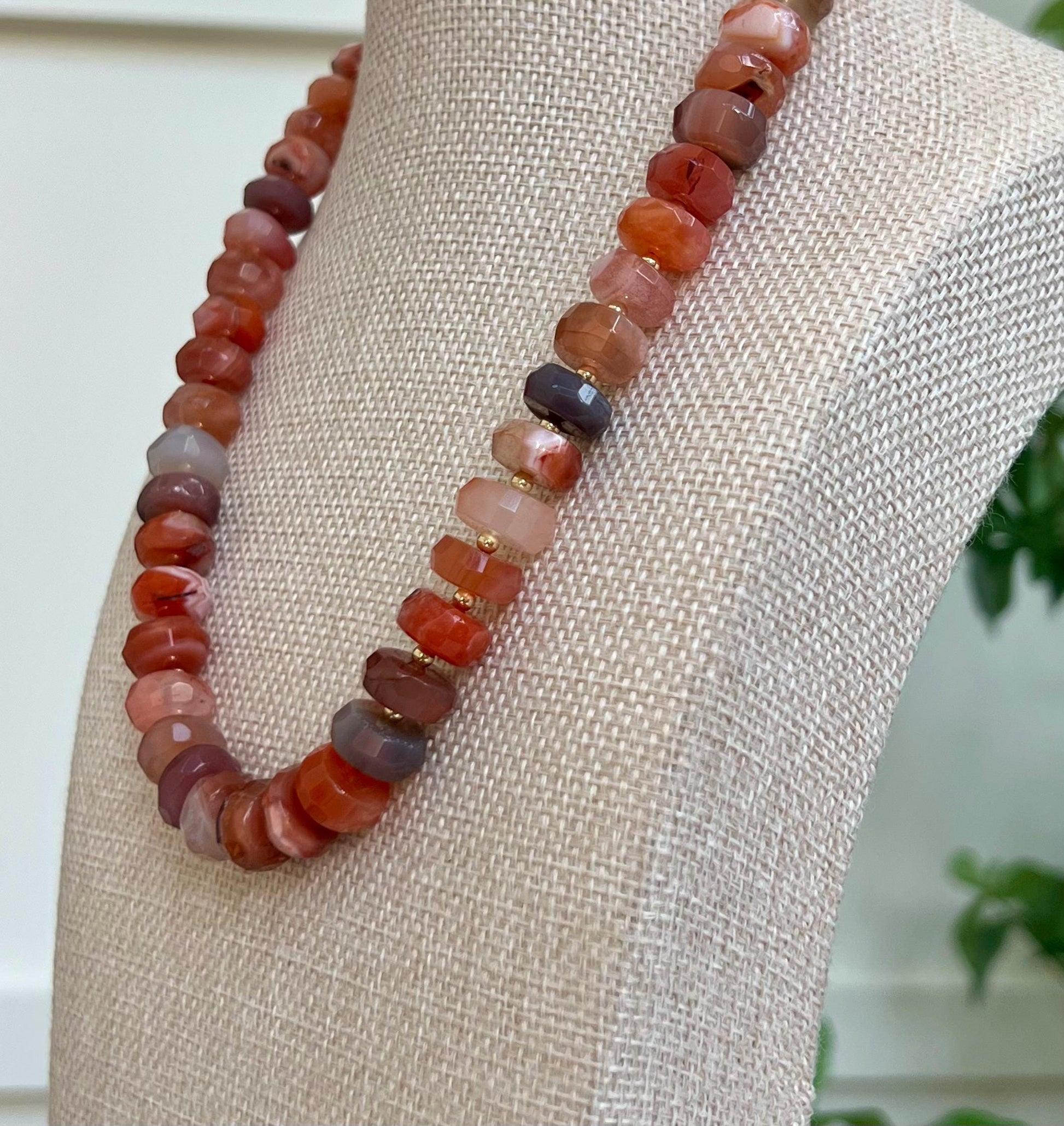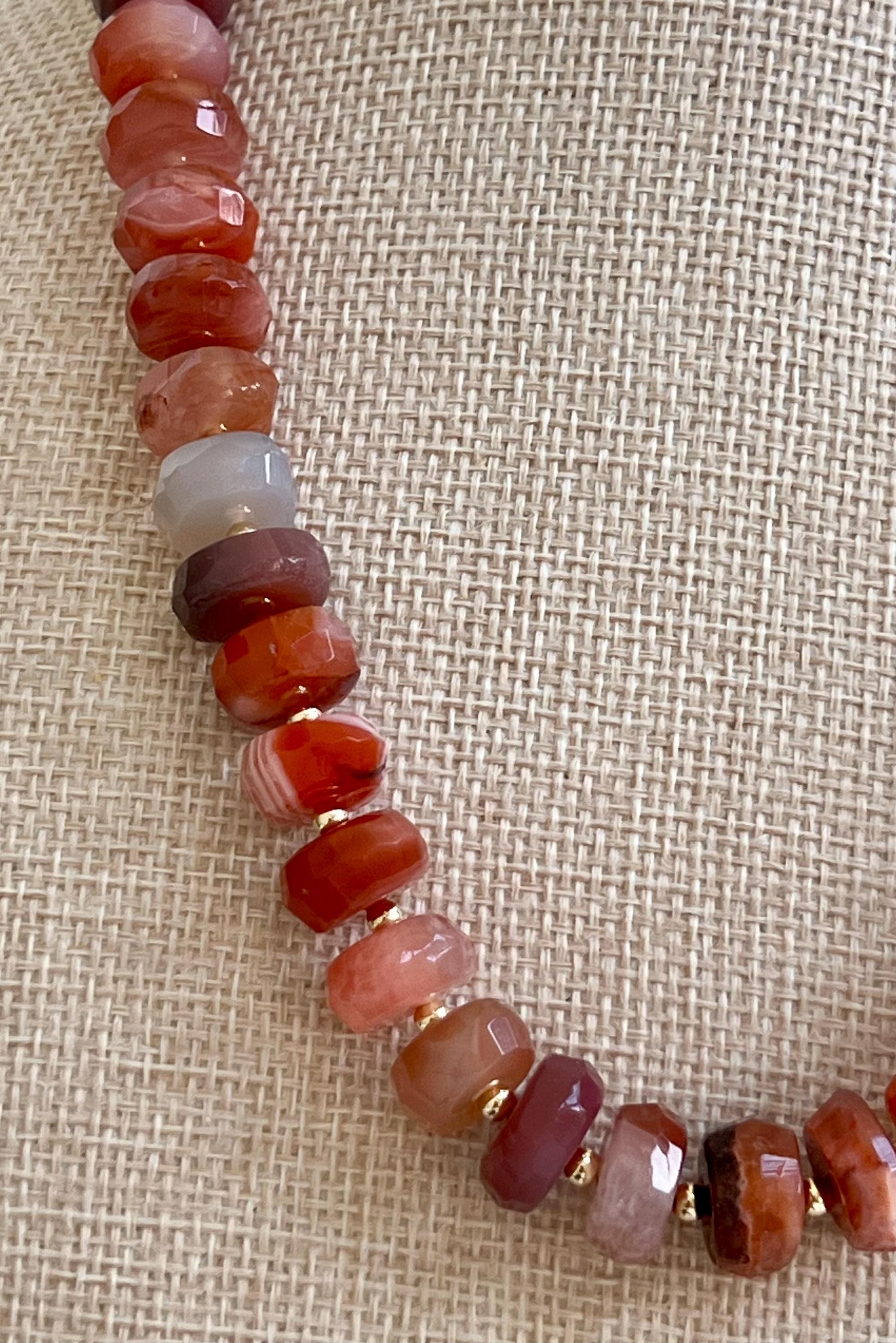8x12mm-8x15mm faceted large Red Botswana Agate wheel stones with a large 18k gold filled lobster clasp and gold filled bead between each Botswana stone. Arrives thoughtfully packaged in an eco-friendly kraft box wrapped in ribbon, ready for gifting or keeping for yourself.