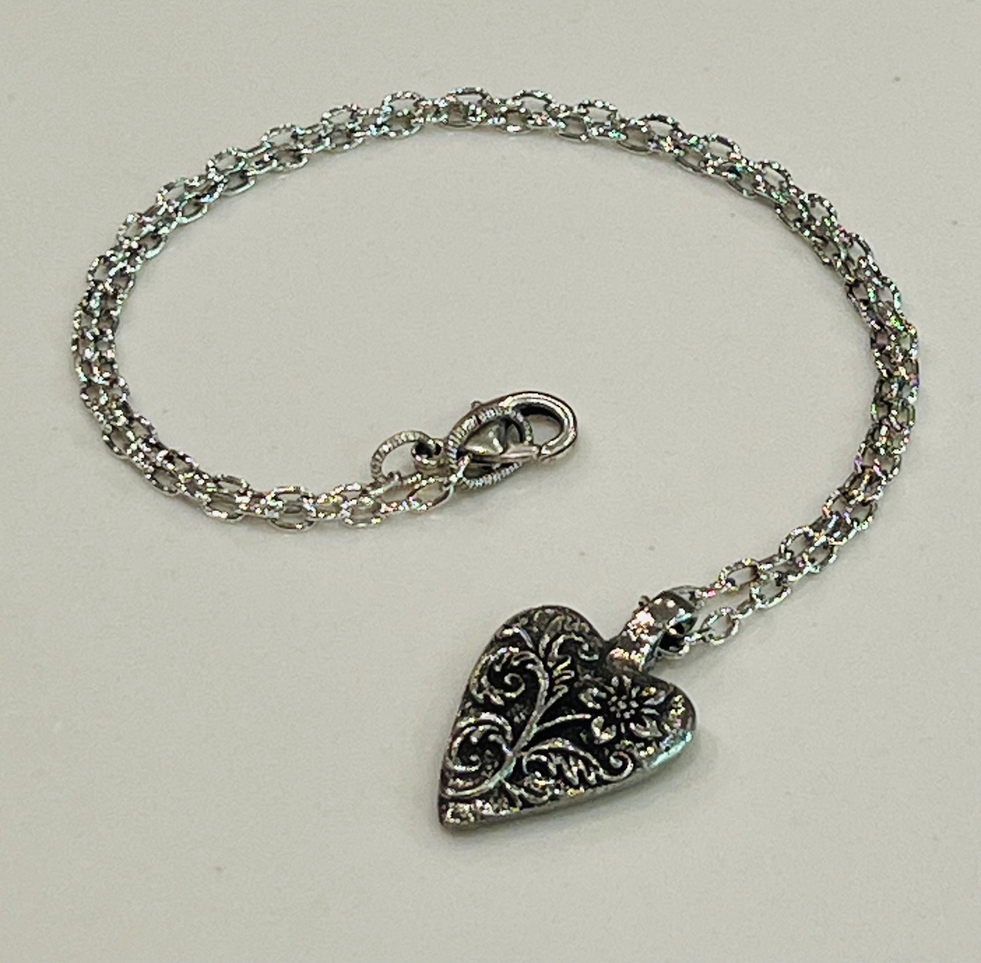 Small classic cable chain with non-tarnish silver plated pewter gorgeous Floral Heart by Green Girl Studios. The pendant is 1 inch in length. The length can be adjusted from 16 inches to 18 inches. Chain is made out of silver plated brass. Arrives thoughtfully packaged in an eco-friendly kraft box wrapped in ribbon, ready for gifting or keeping for yourself.